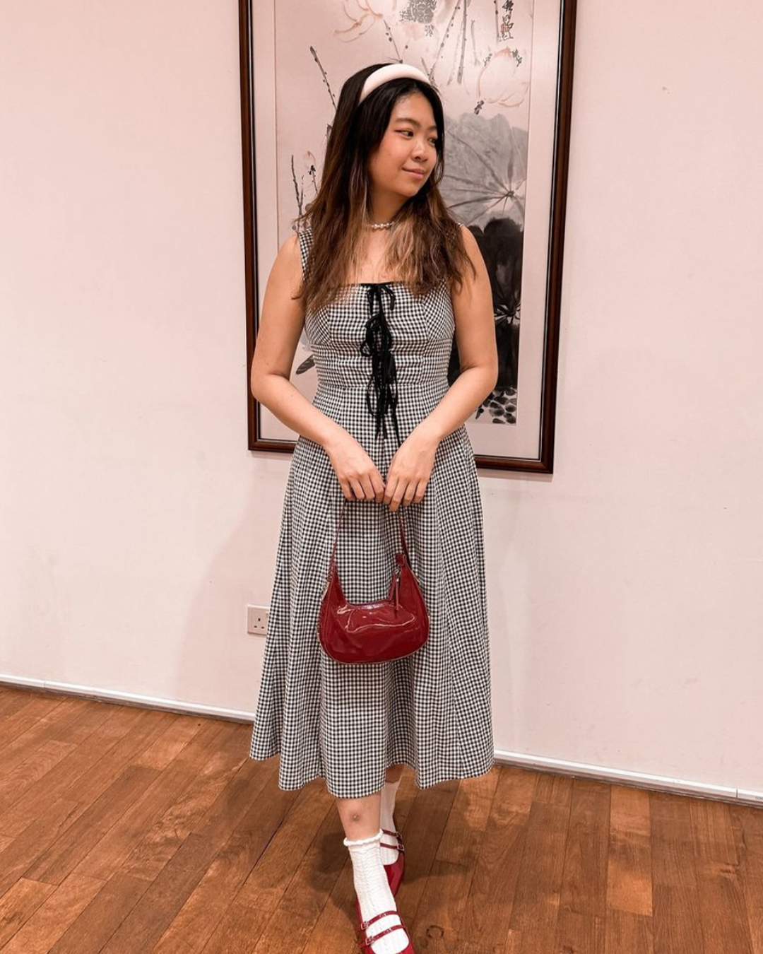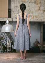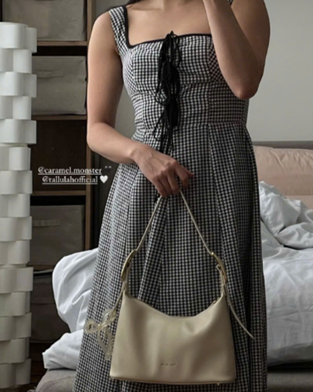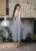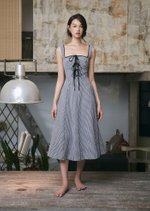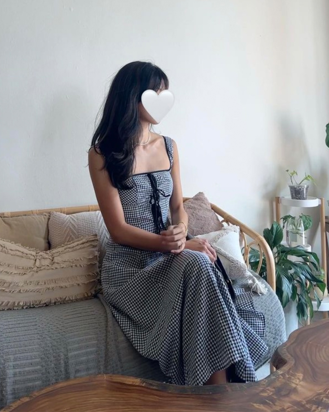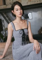 The Juliette is a checked printed midi dress featuring a square neckline with contrast trimmings and a corset-like bodice with self-tied detailing.