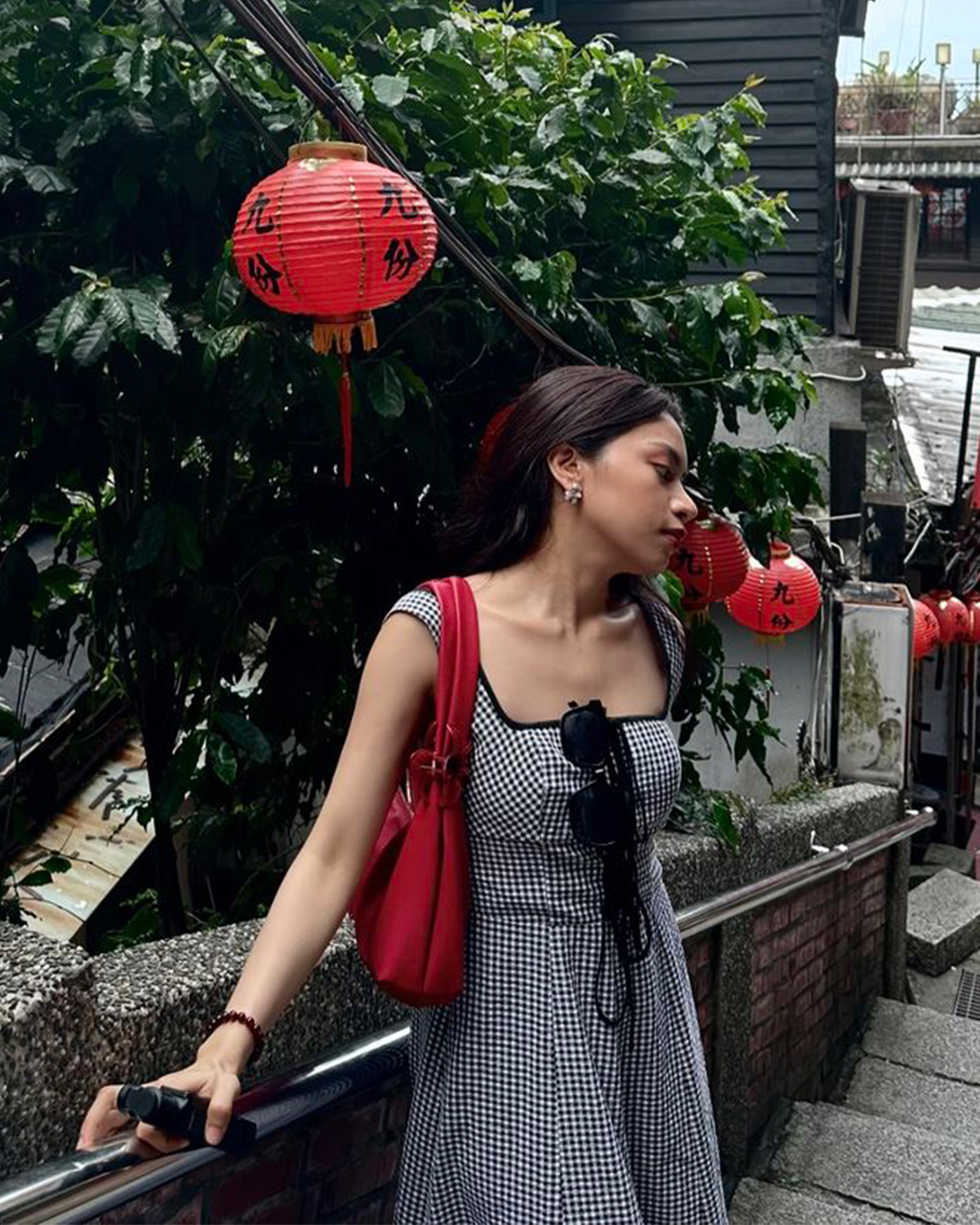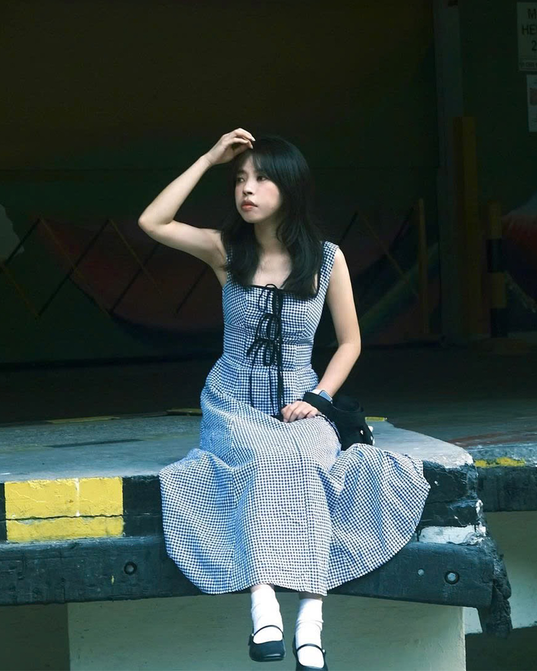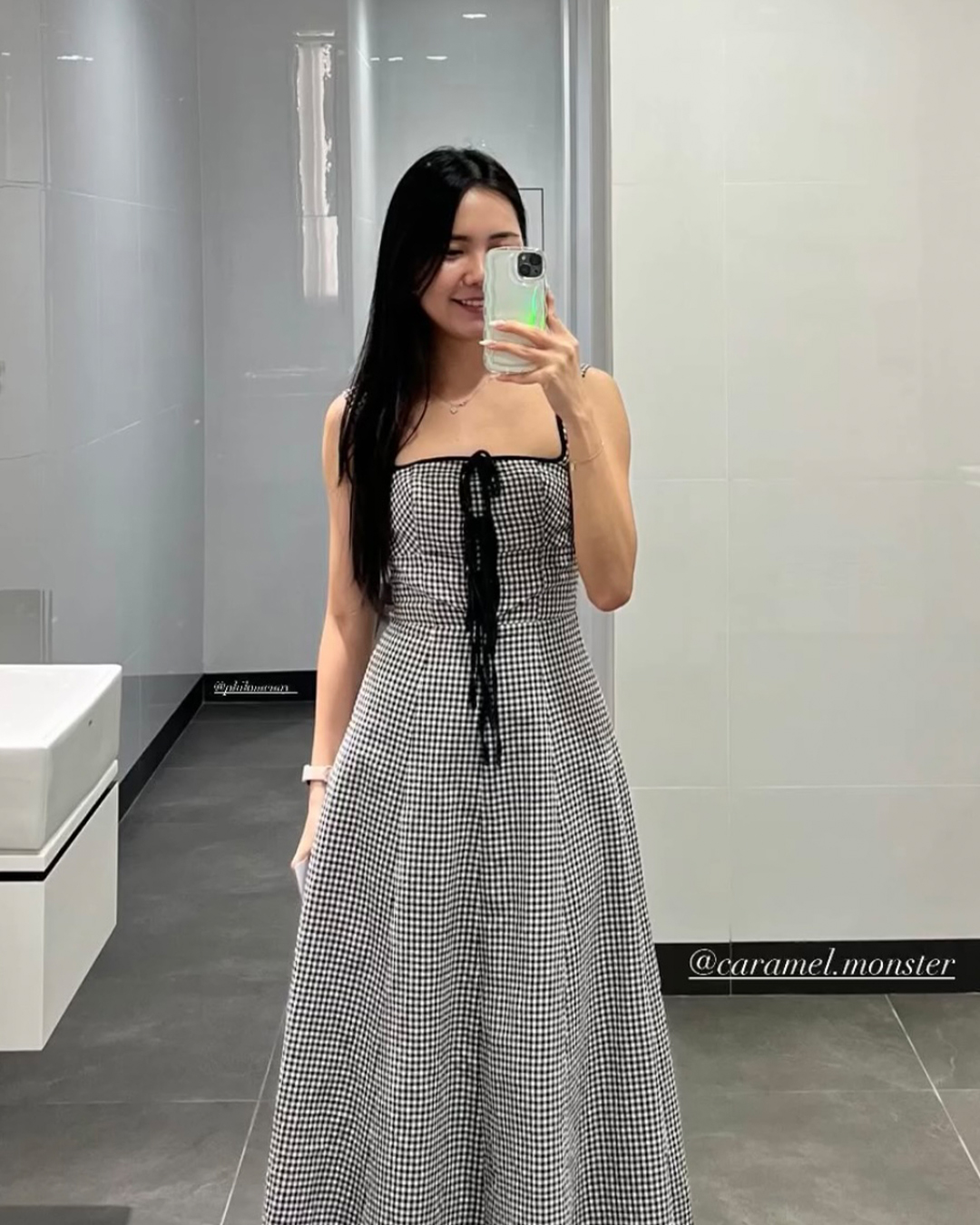 The Juliette is a checked printed midi dress featuring a square neckline with contrast trimmings and a corset-like bodice with self-tied detailing.
