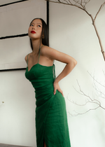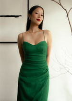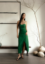 The Magdeline Midi Dress comes with a wrap skirt, a high slit and adjustable shoulder straps.