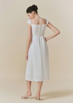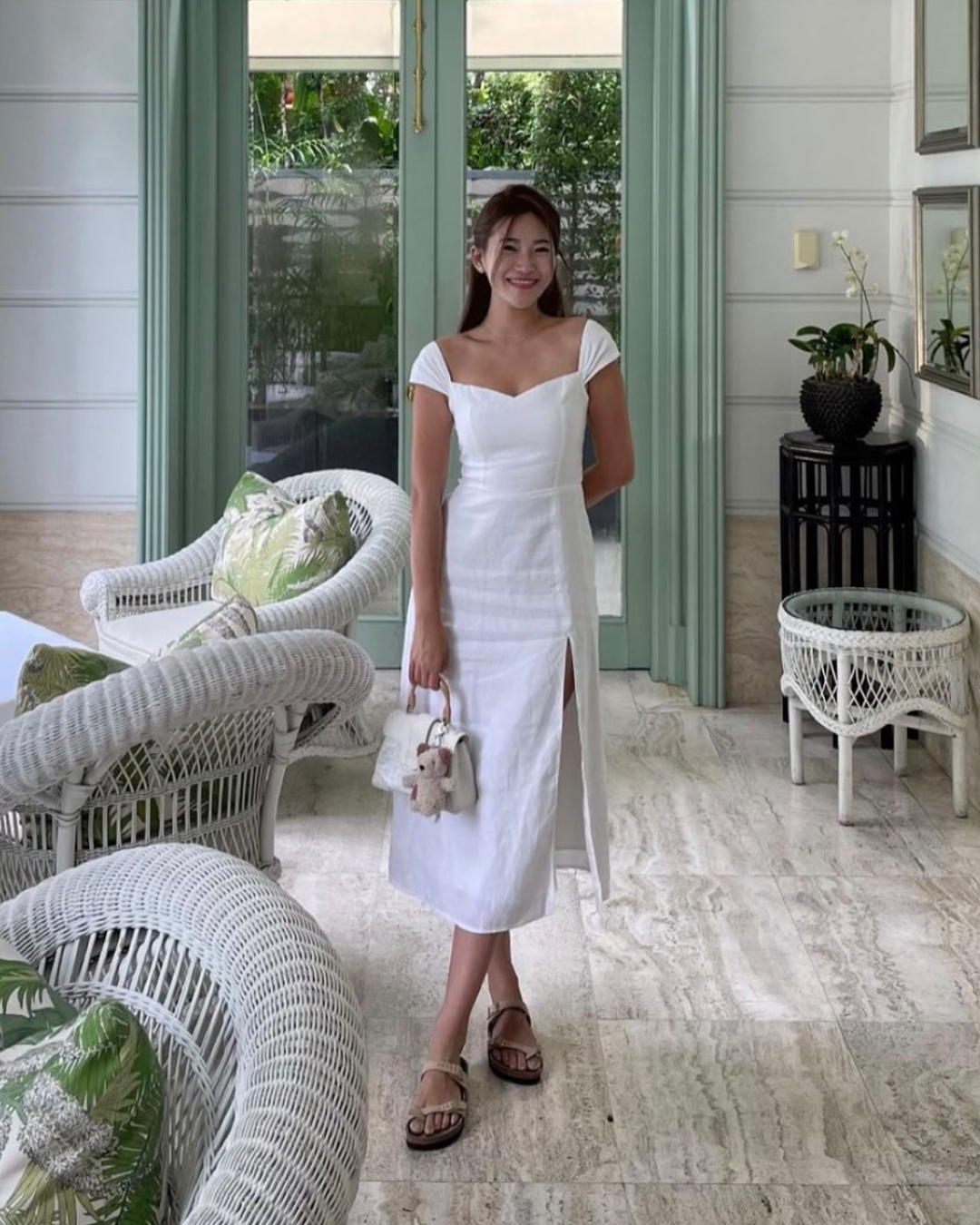 Joanne Midi Dress features a smocked back bodice and side slit to show off a bit of leg. It gives you a little more shape in places you might want that. It pairs well with any of your shoes.