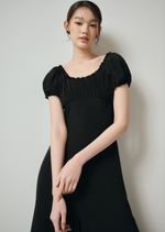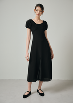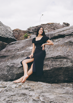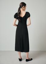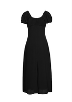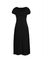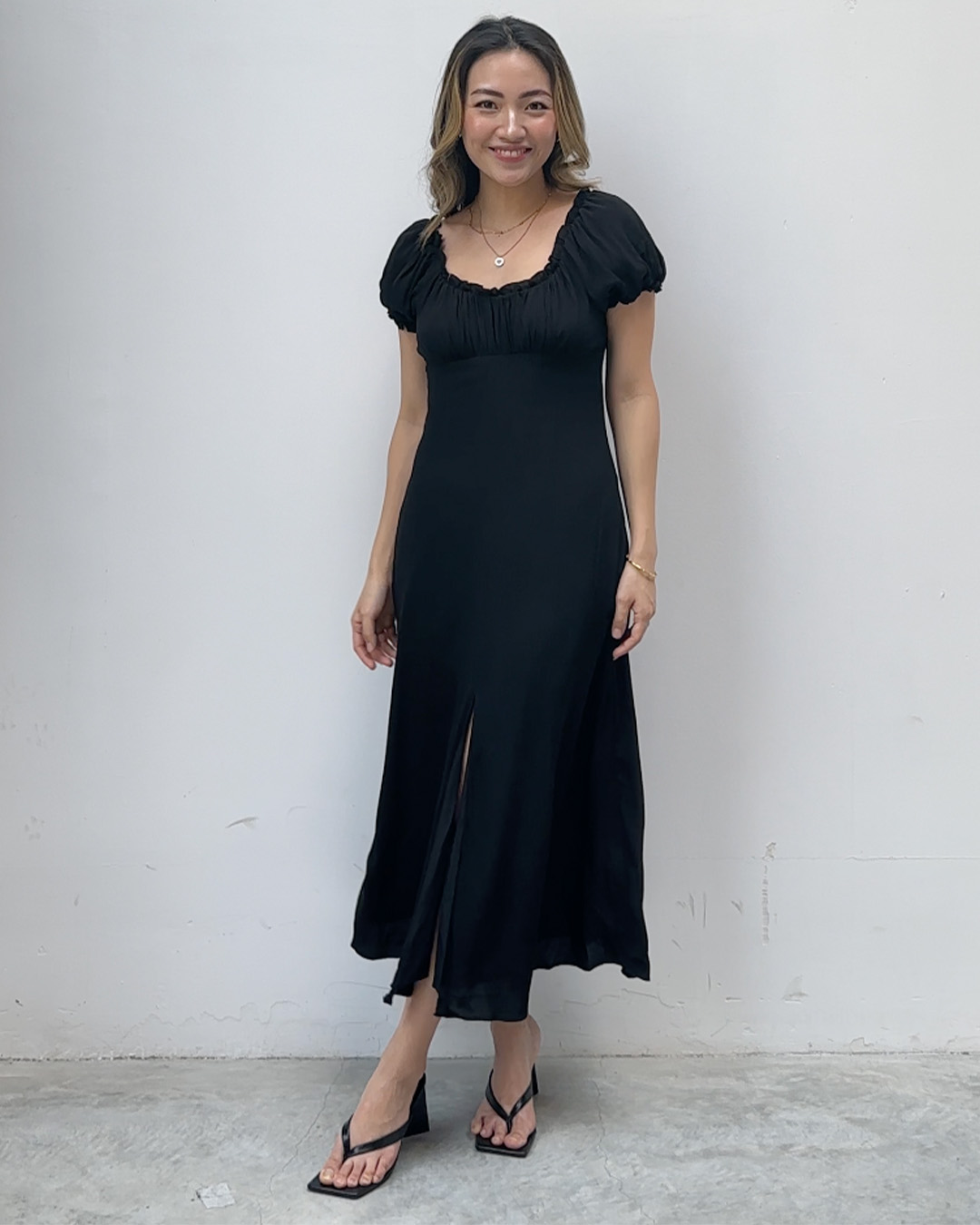 The Patty midi dress features a ruched bust and dainty ruffles around the neckline and sleeves, as well as a front slit for that extra movement for comfort.