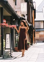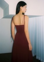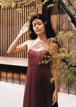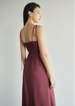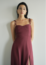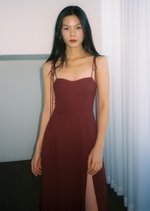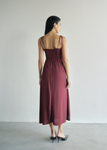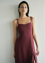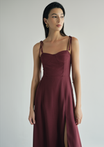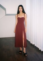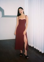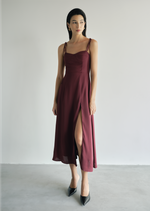The Olivia Midi Dress is a slim-fitting dress that comes with a front split, adjustable spaghetti straps and a romantic sweetheart neckline.