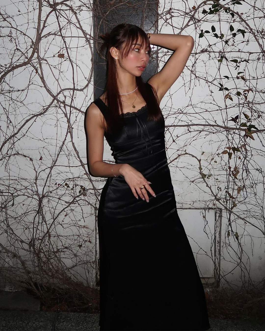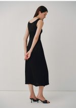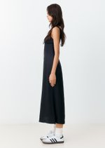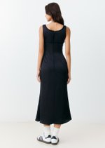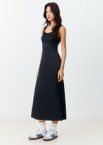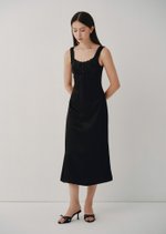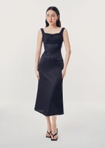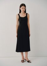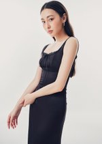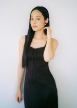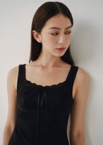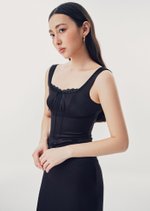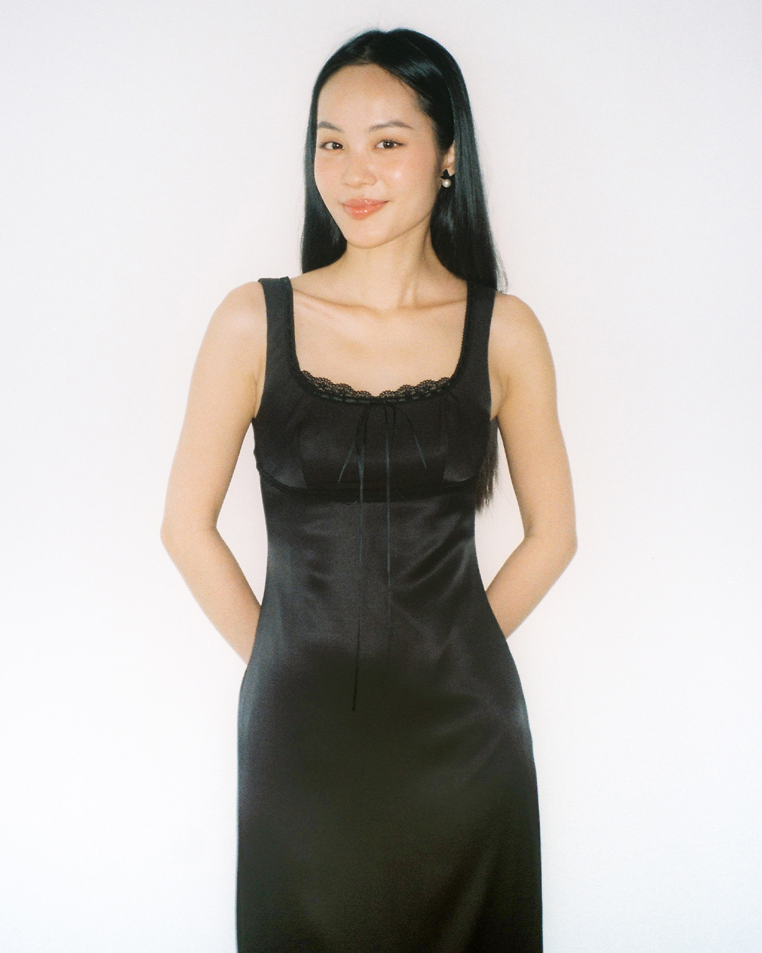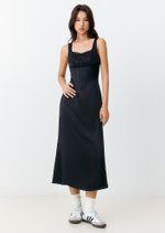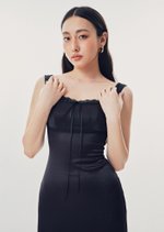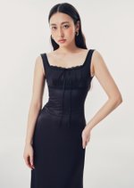 The Jullie midi dress stands out from your typical little black dress. It boasts lace trimmings adorning the neckline and a self-tied ribbon detail, complemented by an A-line skirt panel.