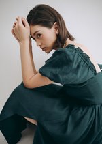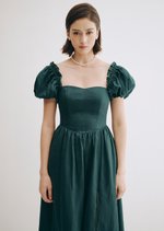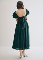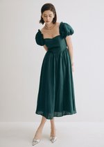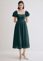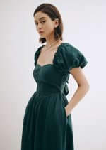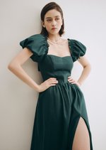 The Kat is a midi dress with the sweetest little details — ruffled trimmings around the puffy sleeves, a sweetheart neckline on a fitted bodice, a front slit and self-tied ribbon bow detailing behind.
