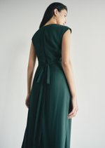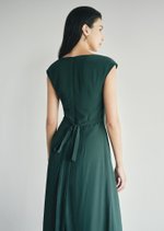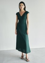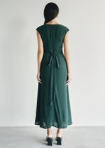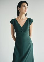 The Meji midi dress showcases a v-neckline adorned with button-down accents, along with cap sleeves and a self-tie ribbon at the back.