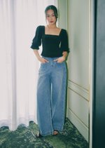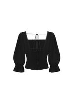 - Generous three-quarter-length sleeves finish in ruffles at the cuffs
