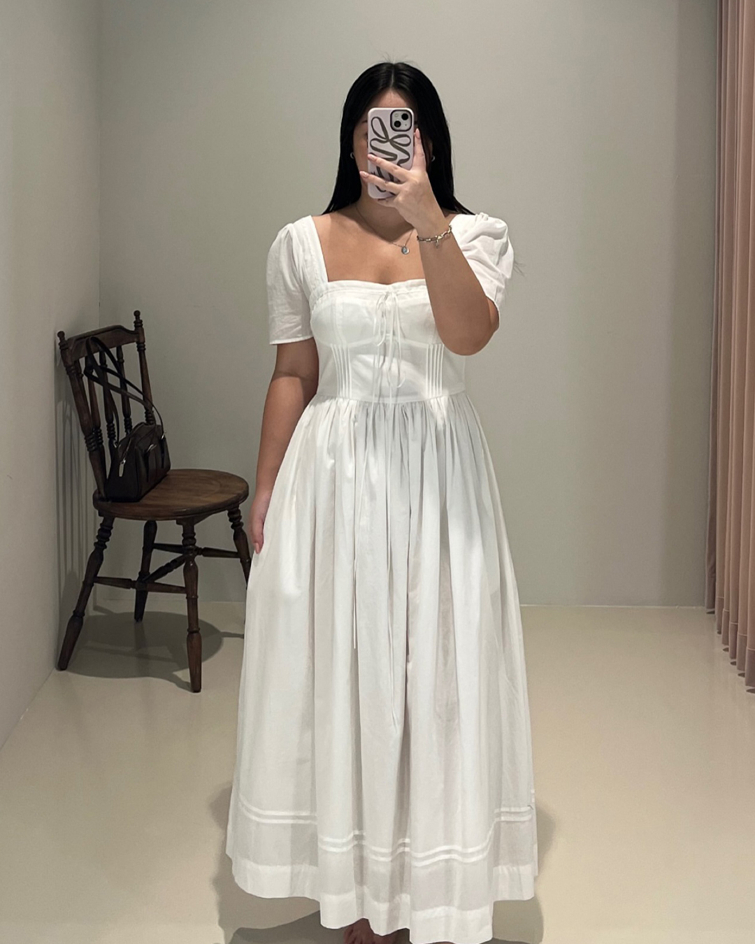 The Lara midi features a square neckline with intricate lace and ribbon detailing around. Pair it with your favorite sandals or sneakers for a casual day look, or dress it up with heels and statement jewelry for a more polished evening ensemble.