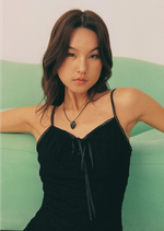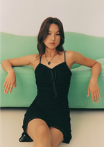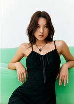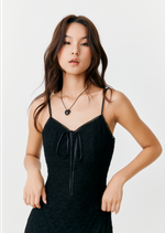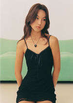 Nina is a fully lined lace mini dress with a v-neckline paired with lace trimmings and a self-tied ribbon front.