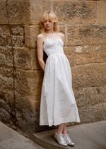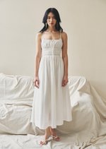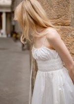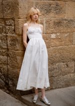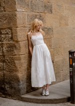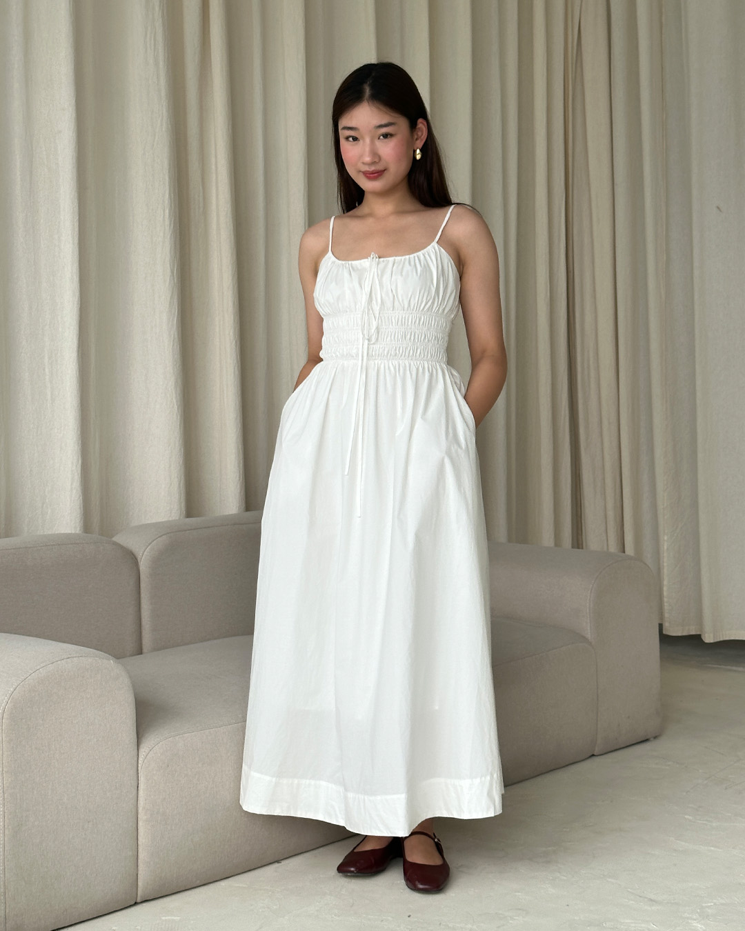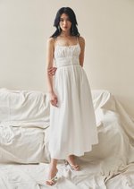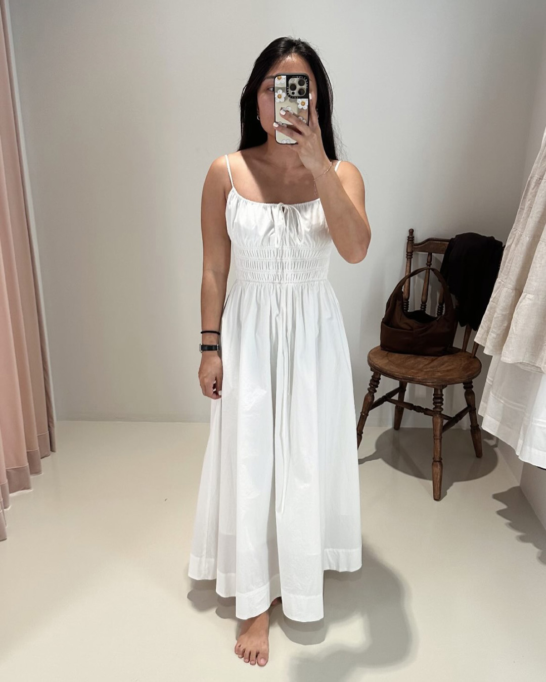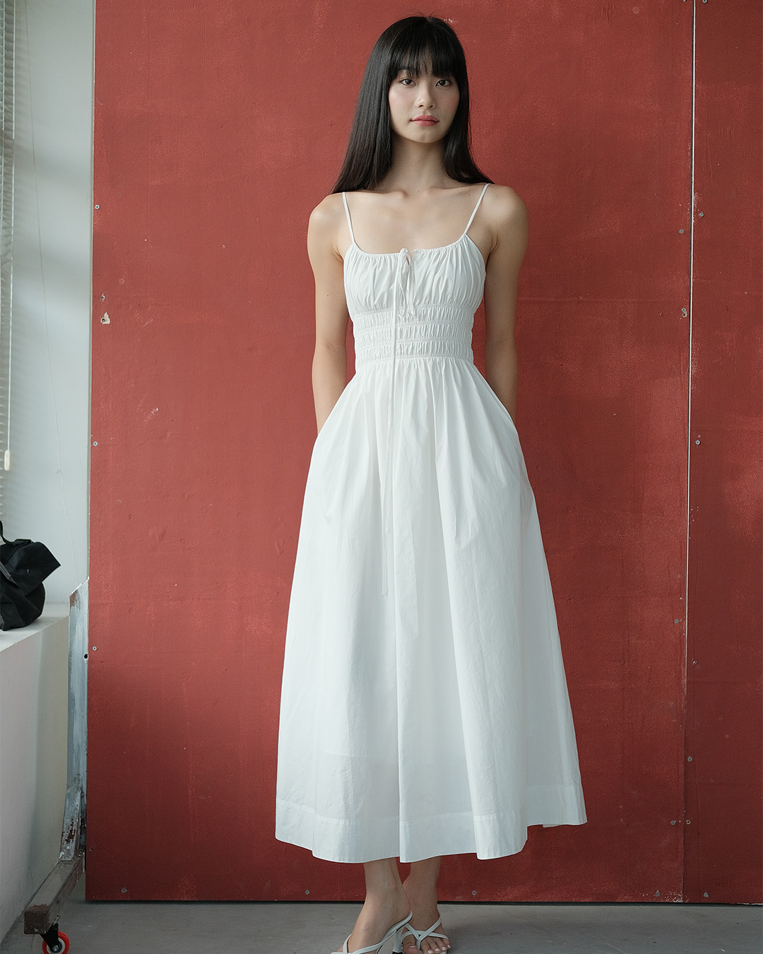 Embrace romantic elegance with our Grace Midaxi Dress, styled in a charming milk-maid design with a tie-string at the chest center. Featuring adjustable spaghetti straps, a ruched bodice, and a fully lined midaxi length, this dress is perfect for any occasion, blending classic style with modern comfort.