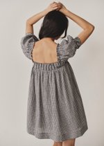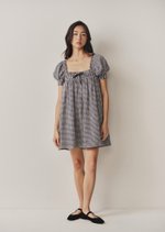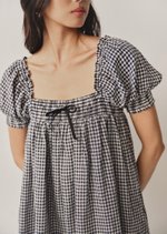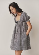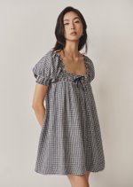 The Irina, with its charming baby doll shape and smocked panel at neckline, is adorned with puffy sleeves and a decorative ribbon for a playful touch.