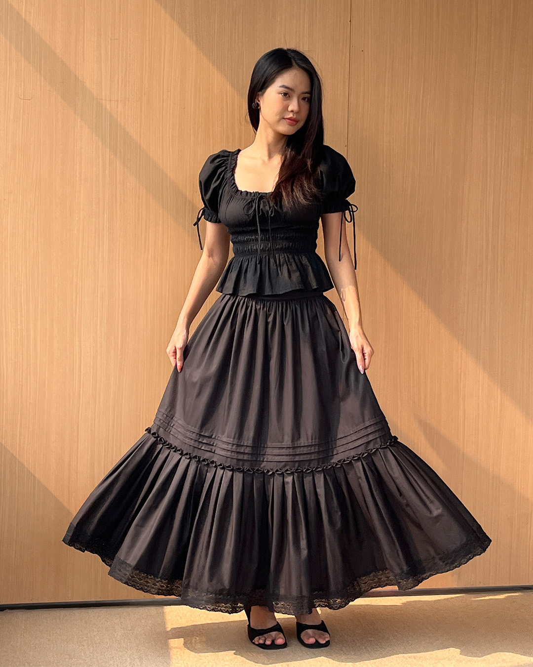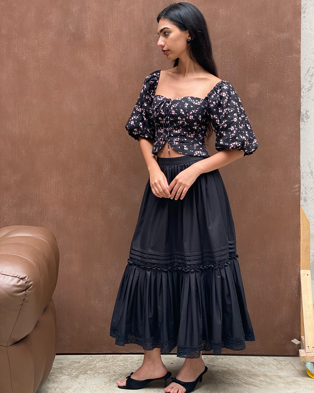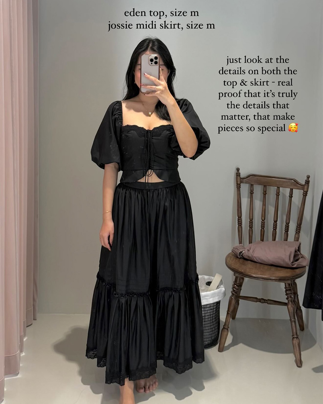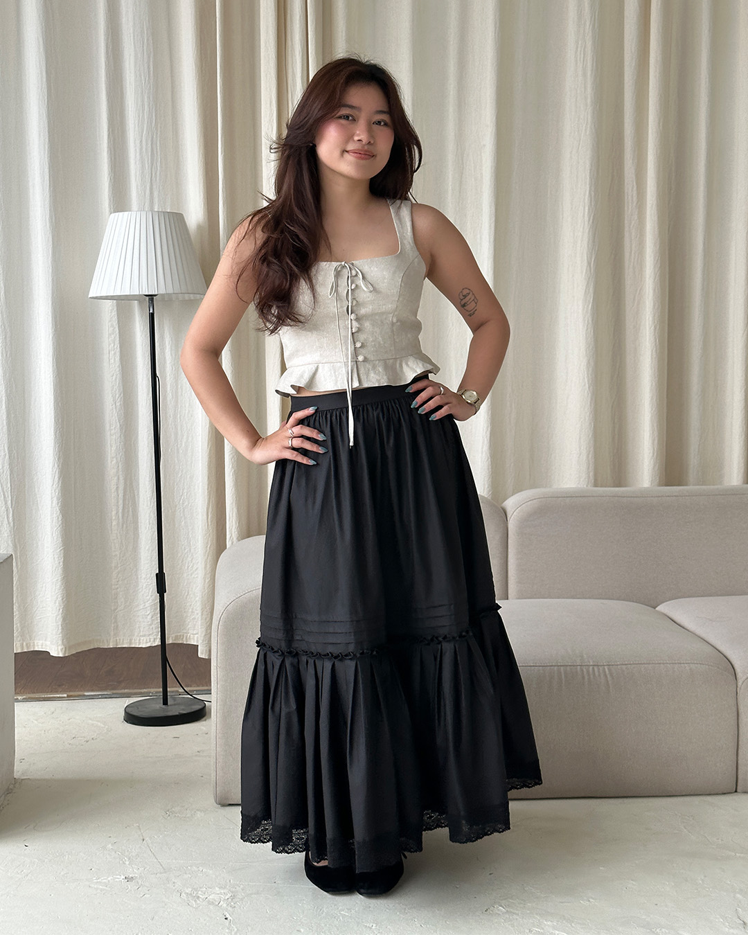 Elegant and practical, the Jossie Midi Skirt features lace-trimmed hems, piping details, hidden pockets, and a secure waistband. Fully lined for comfort, it’s a versatile wardrobe staple.