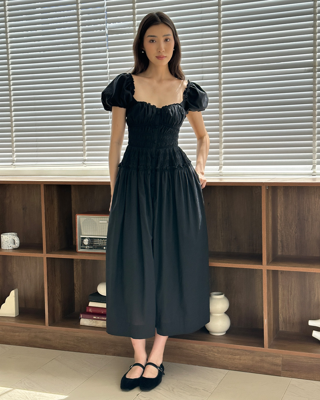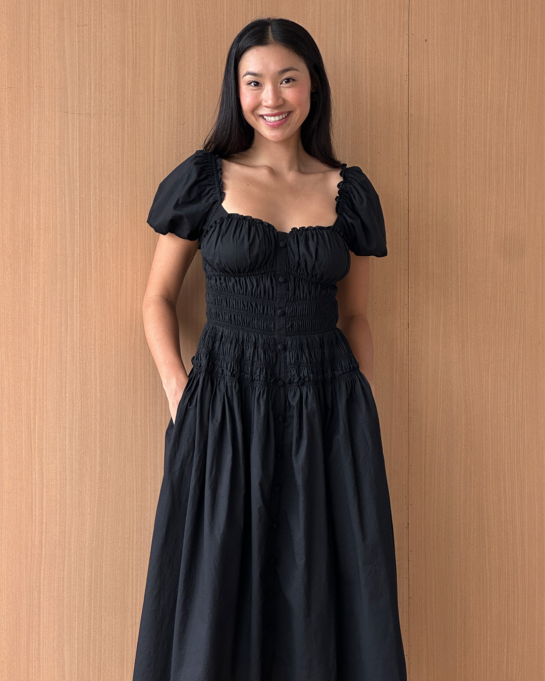 With puffy sleeves, a sweetheart neckline, and a button-front design, the Liora Midi Dress is both romantic and practical. Fully lined with pockets, it’s effortlessly chic.