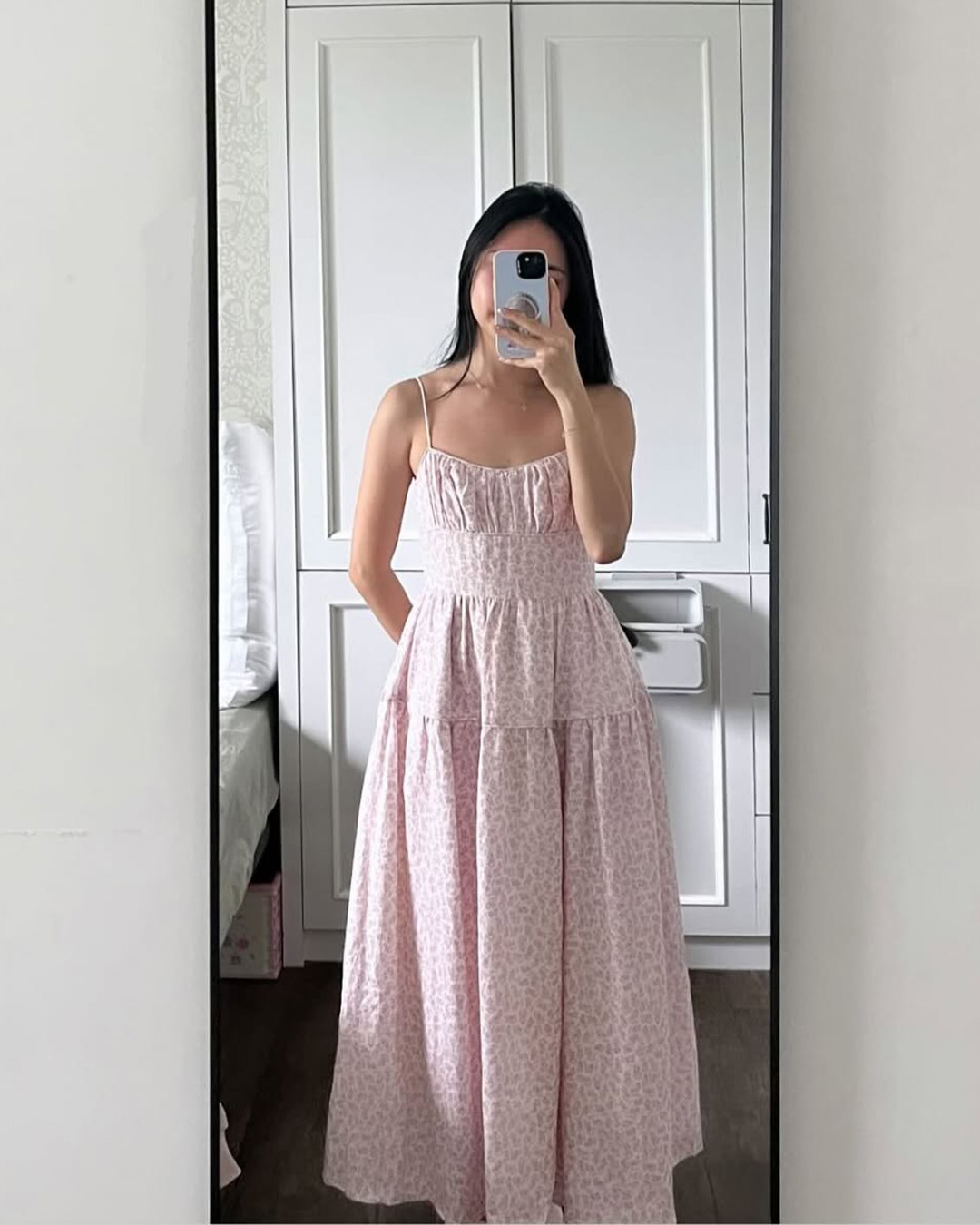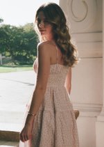 The Eleanor features a sweetheart neckline with a gathered bust panel and a two-tiered maxi skirt.