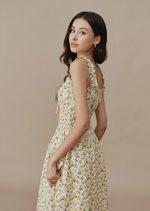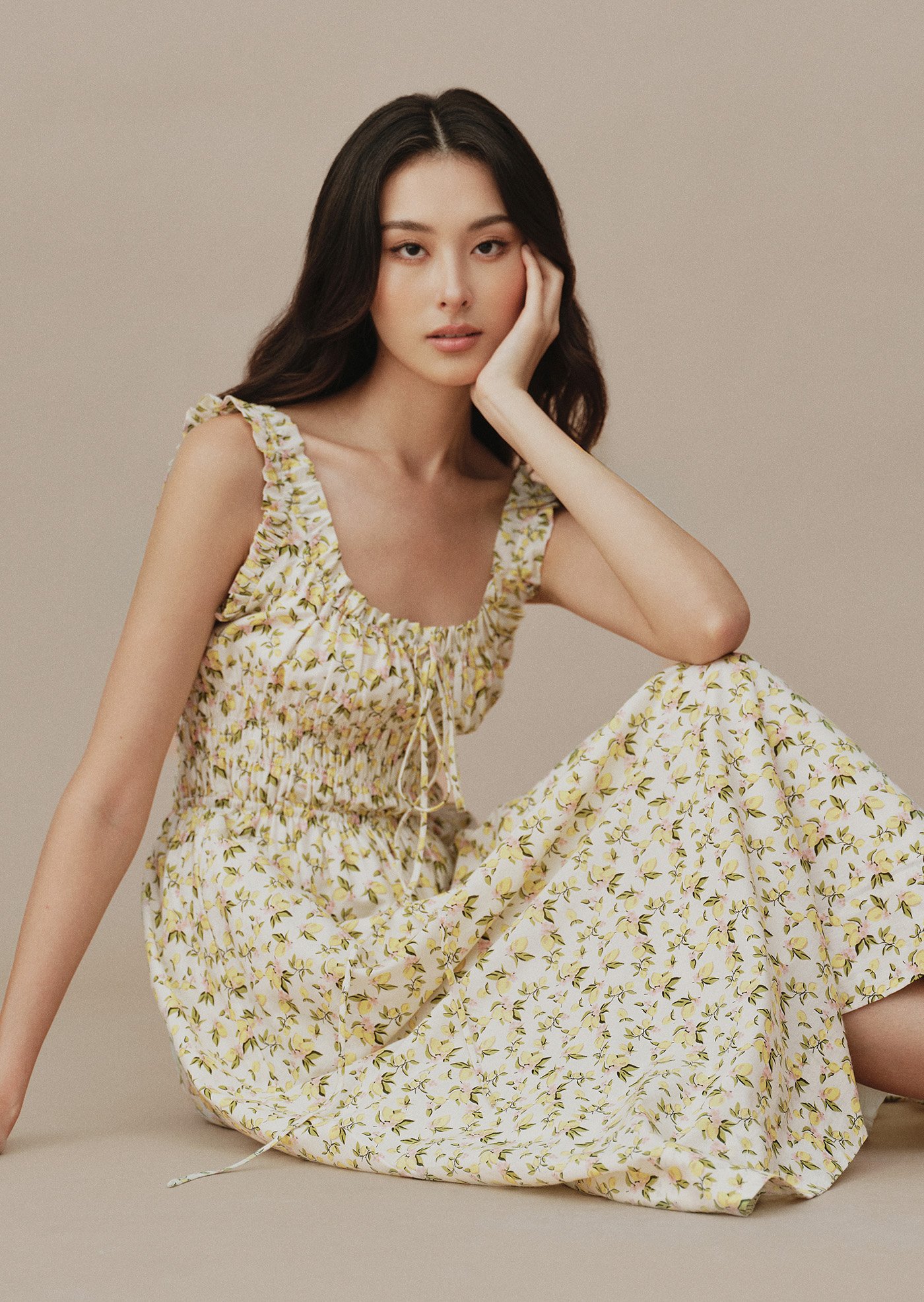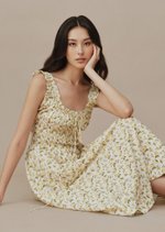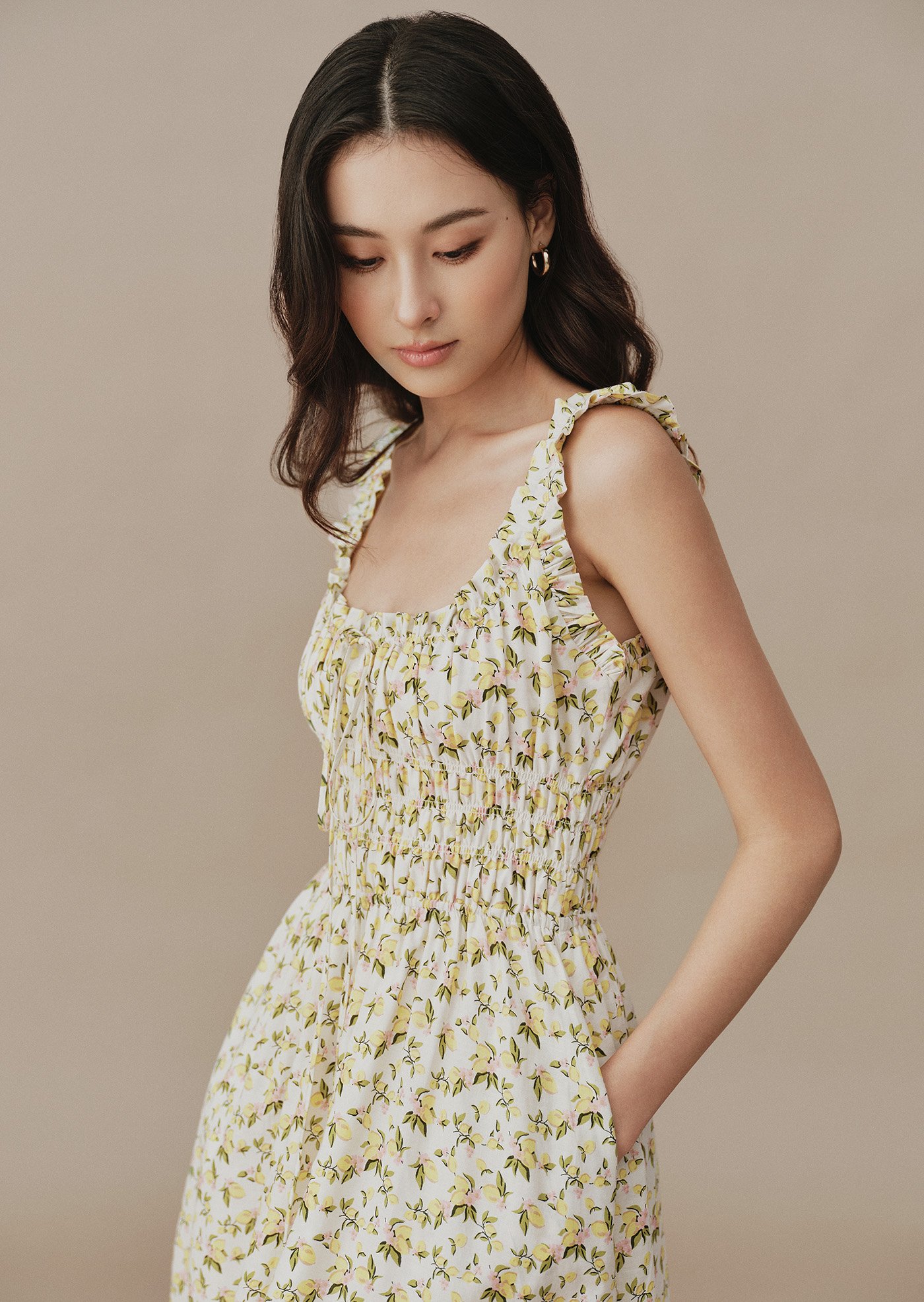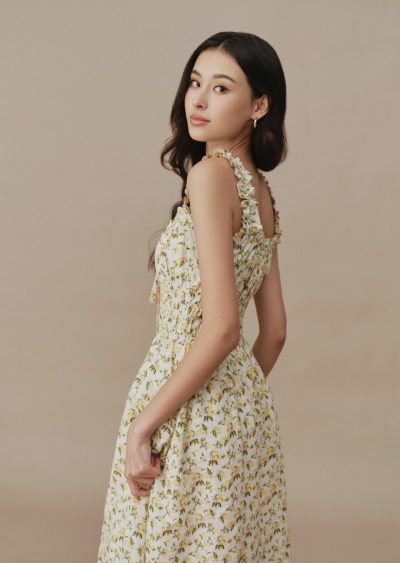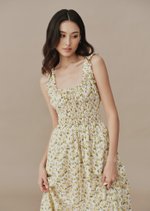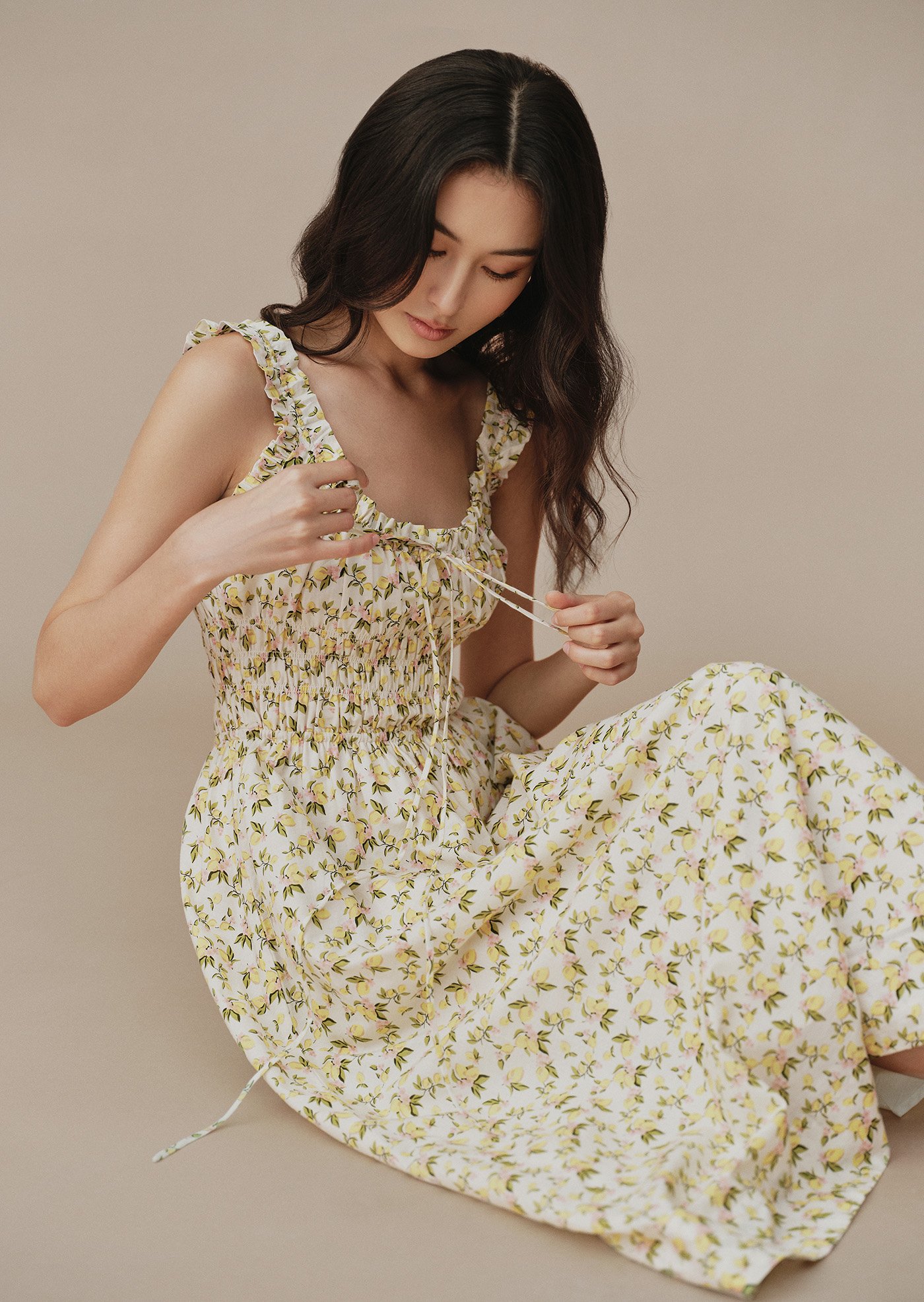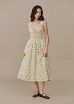 Designed with a smocked bodice that flatters effortlessly, ruffled shoulder straps, and a flowing midi skirt, it moves with grace and ease. A tie detail at the neckline adds a gentle touch of charm, while hidden side pockets make it as practical as it is romantic.