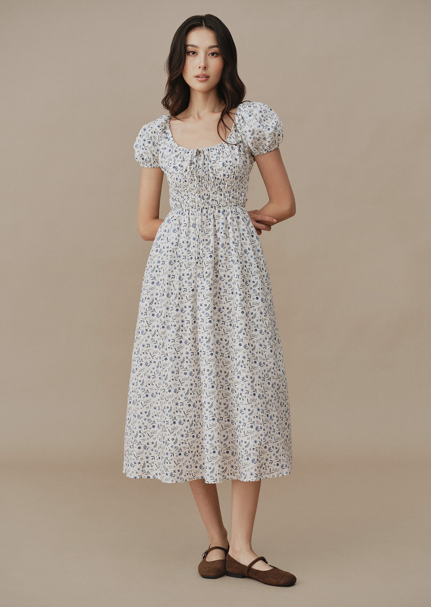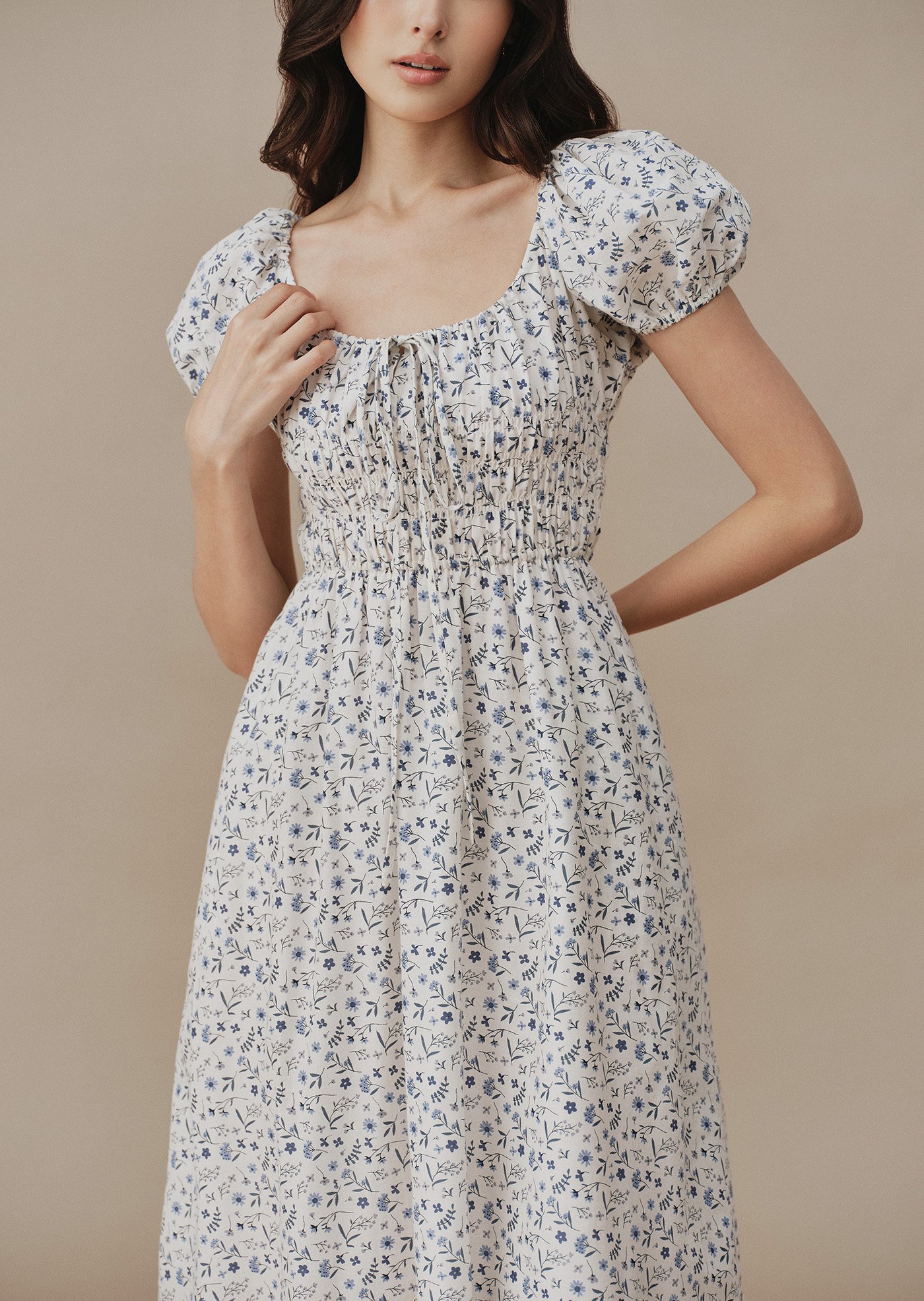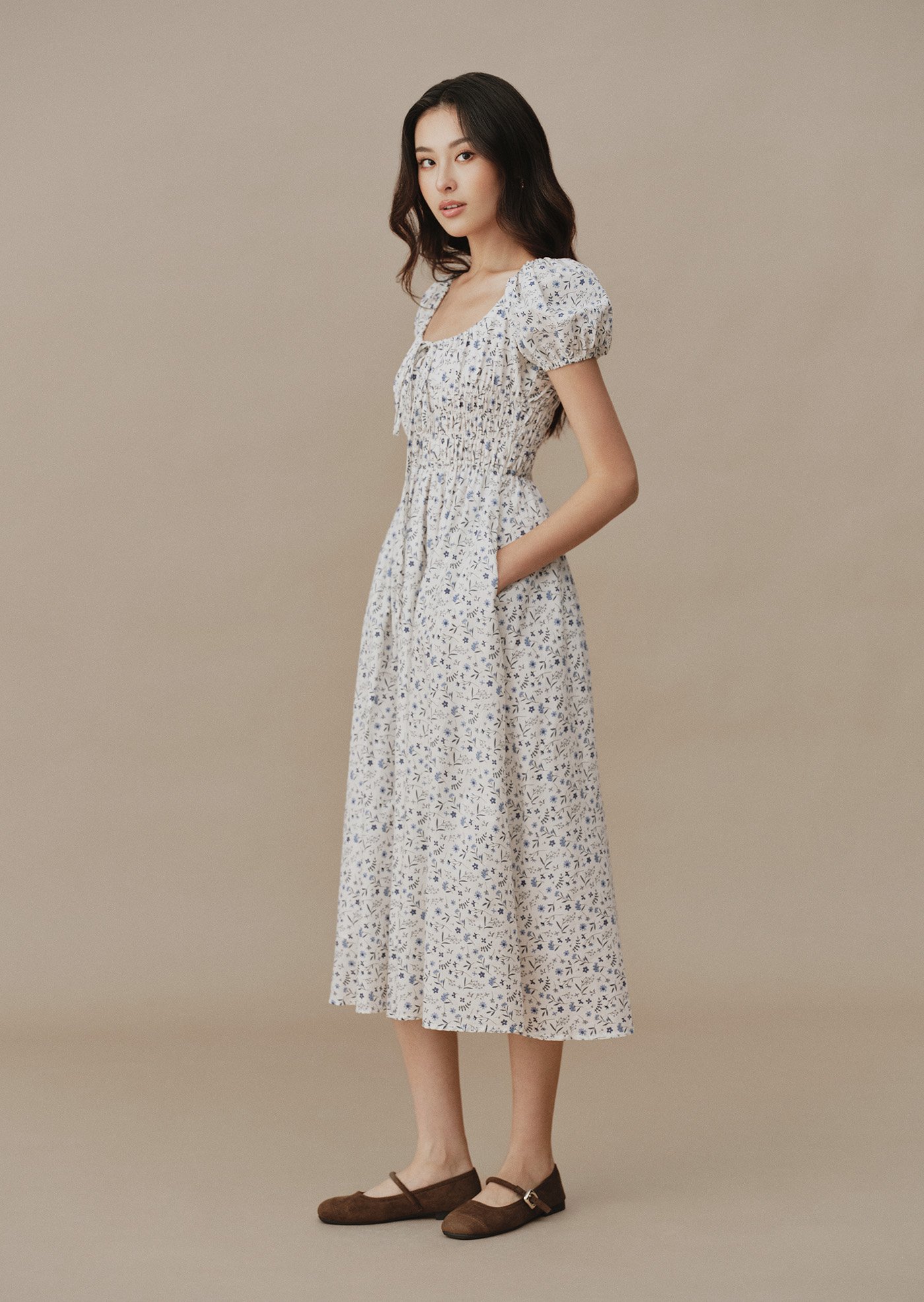 Featuring a smocked bodice that flatters naturally, puff sleeves with gentle volume, and a flowing midi skirt that moves gracefully with every step. Finished with a subtle tie detail at the neckline and hidden side pockets for everyday comfort.