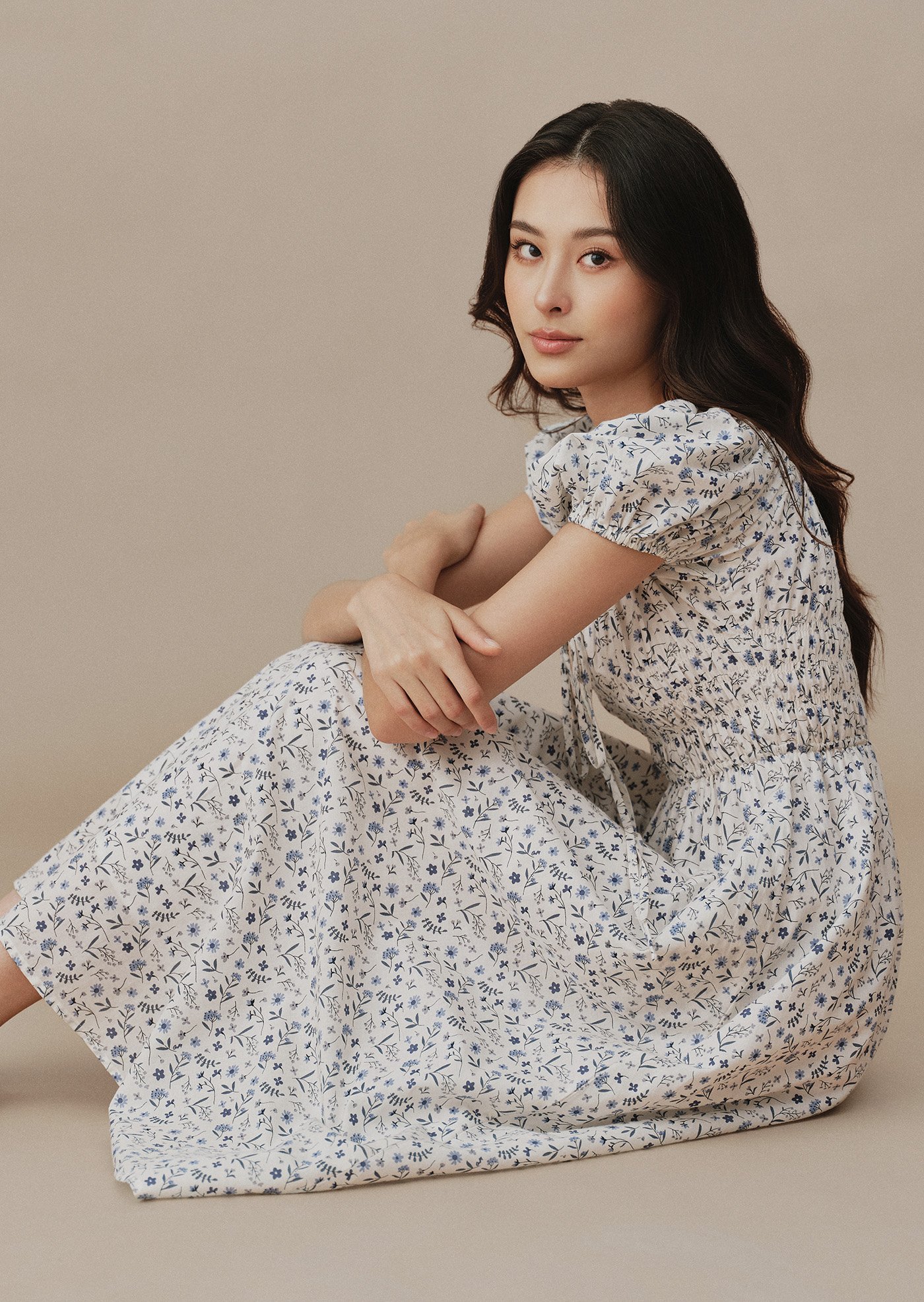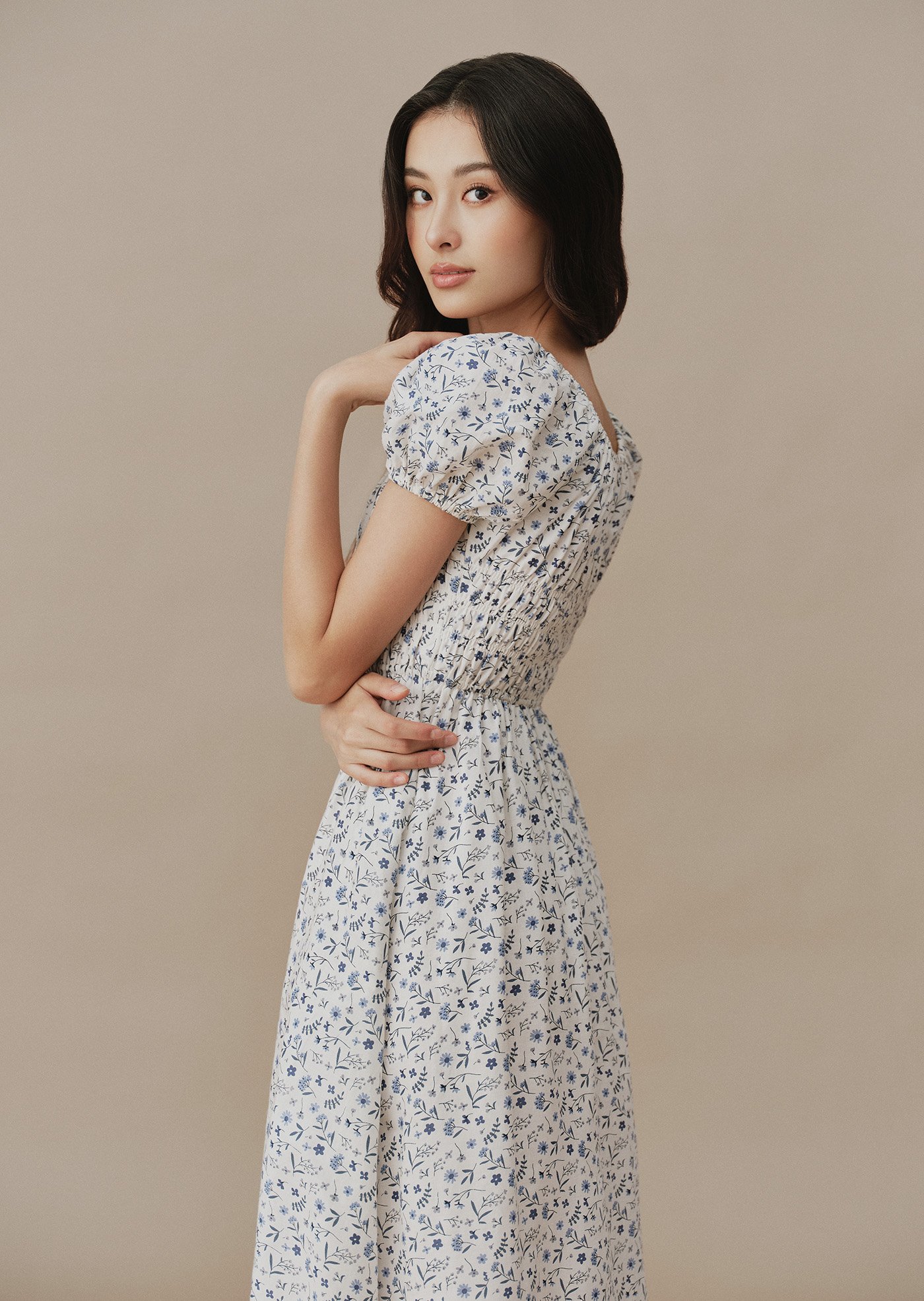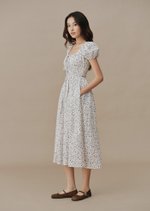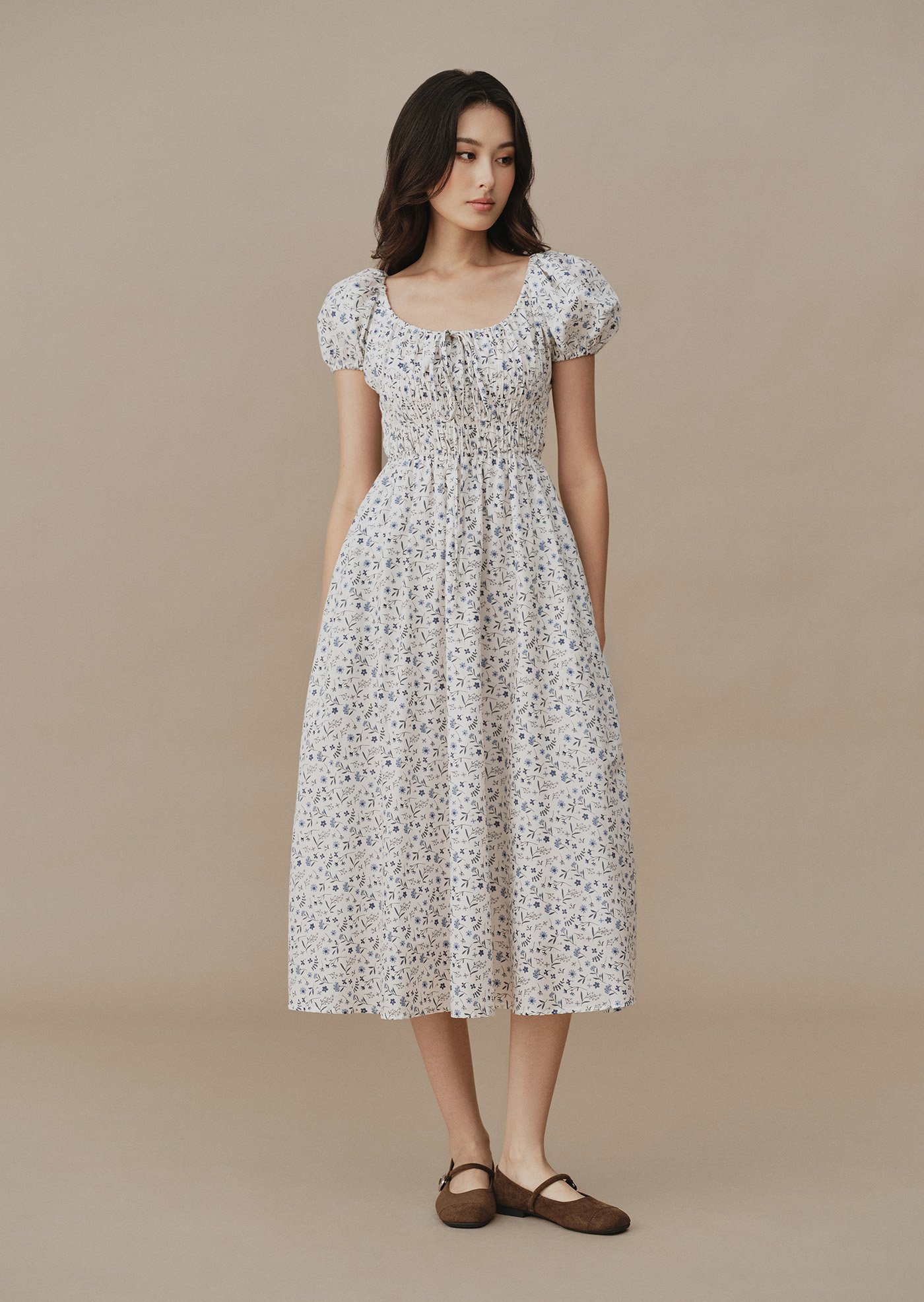 Featuring a smocked bodice that flatters naturally, puff sleeves with gentle volume, and a flowing midi skirt that moves gracefully with every step. Finished with a subtle tie detail at the neckline and hidden side pockets for everyday comfort.