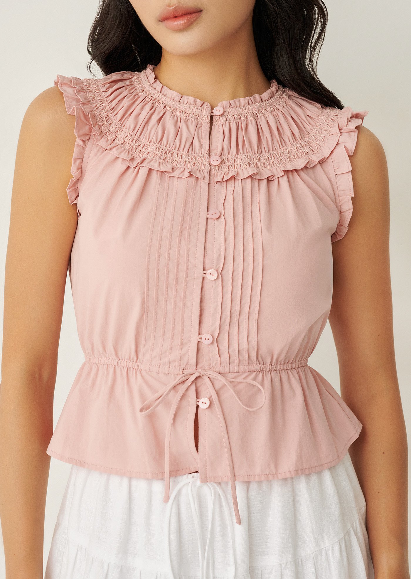 -High ruffled neckline with delicate gathers