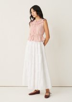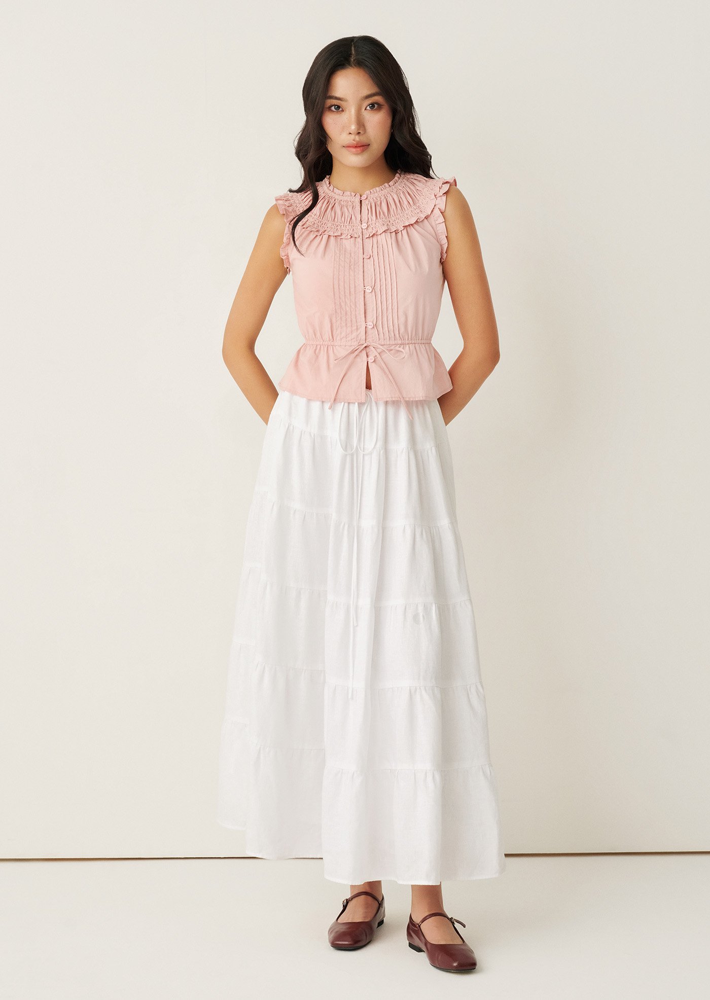 The Rhoda Top is defined by delicate pintucks, a ruffled neckline, and an adjustable waist tie that flatters without feeling restrictive. Light and airy in cotton voile, it’s a timeless piece made for slow days — effortlessly paired with skirts, denim, or worn as a quiet statement on its own.