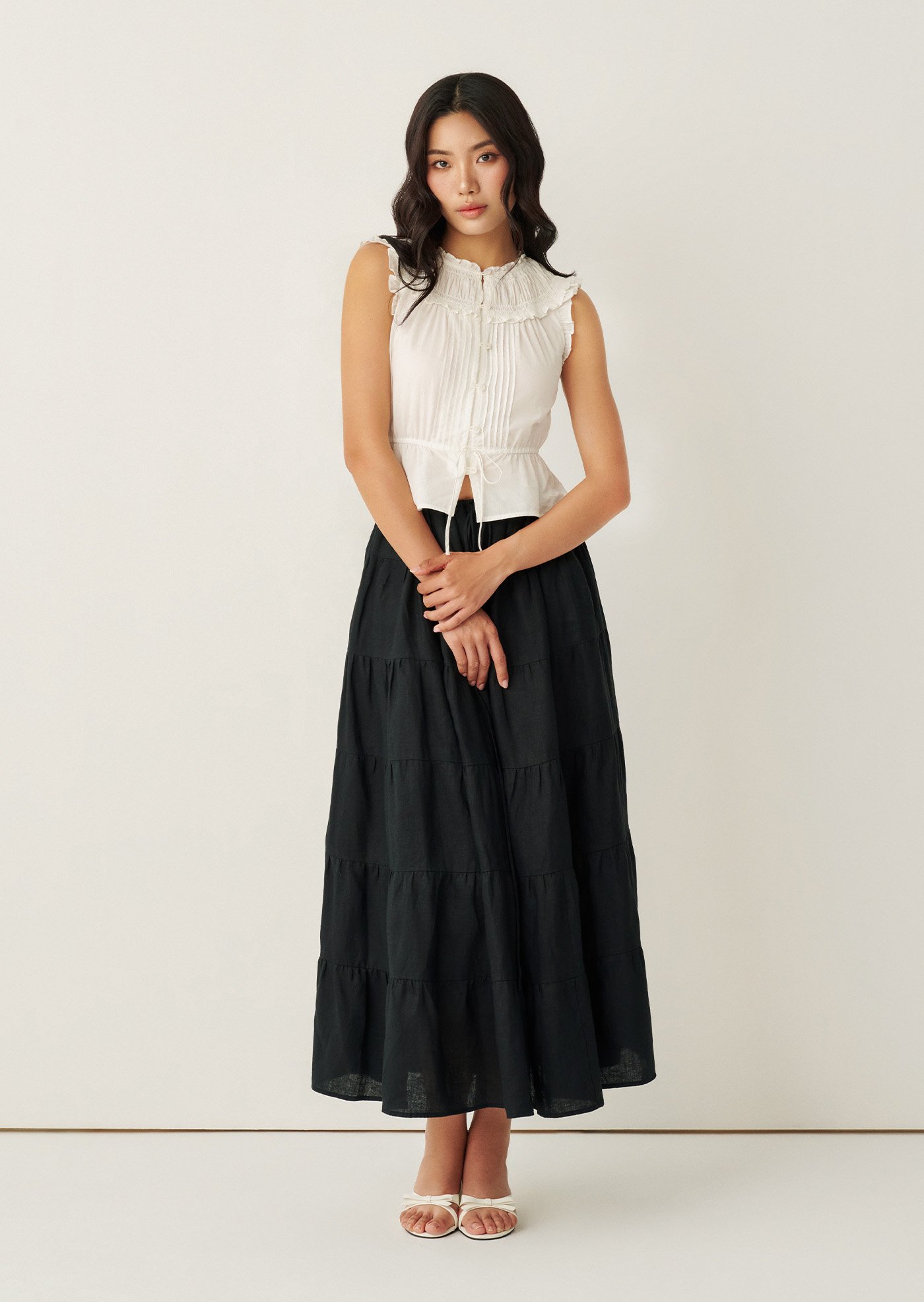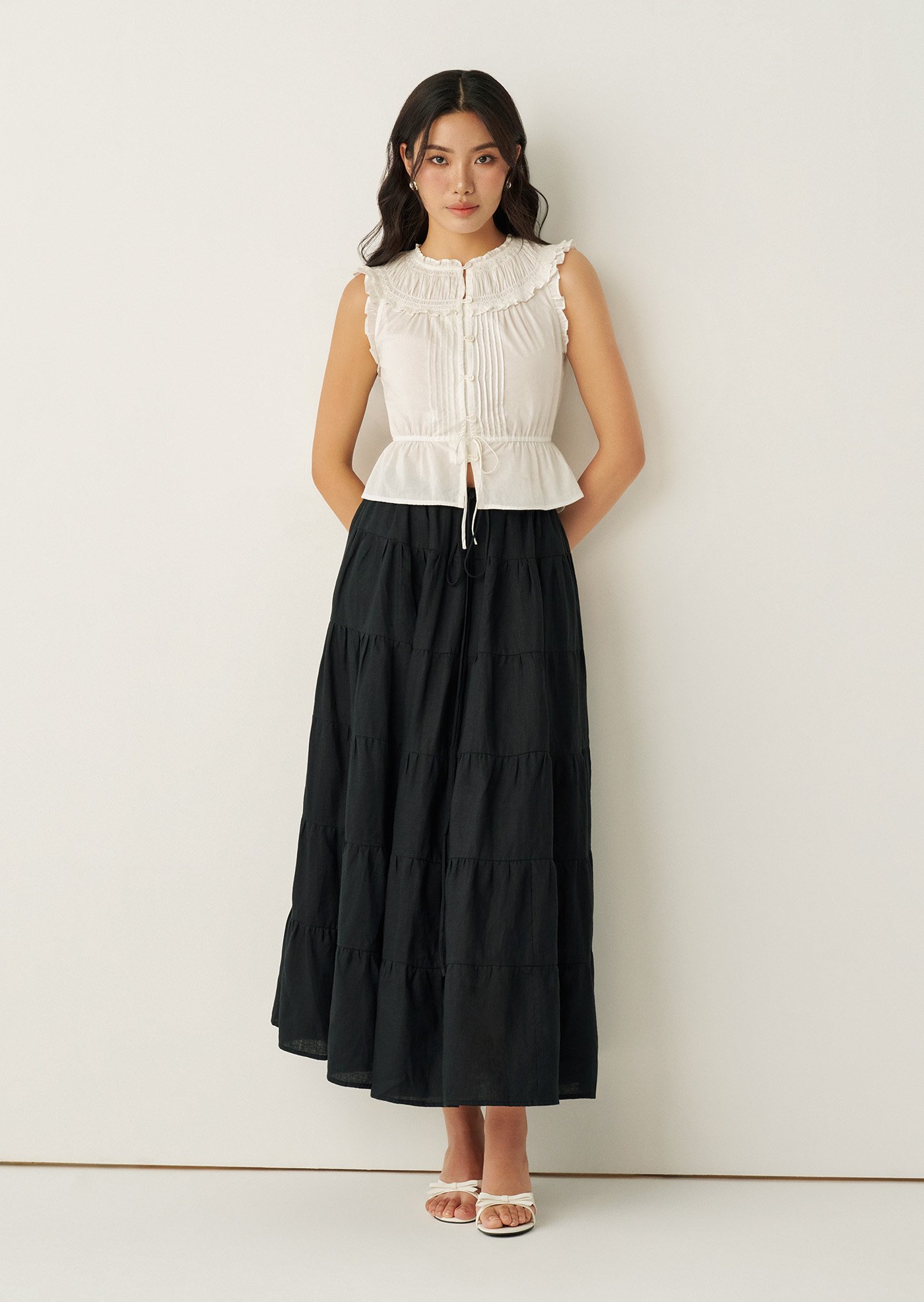 The Rhoda Top is defined by delicate pintucks, a ruffled neckline, and an adjustable waist tie that flatters without feeling restrictive. Light and airy in cotton voile, it’s a timeless piece made for slow days — effortlessly paired with skirts, denim, or worn as a quiet statement on its own.