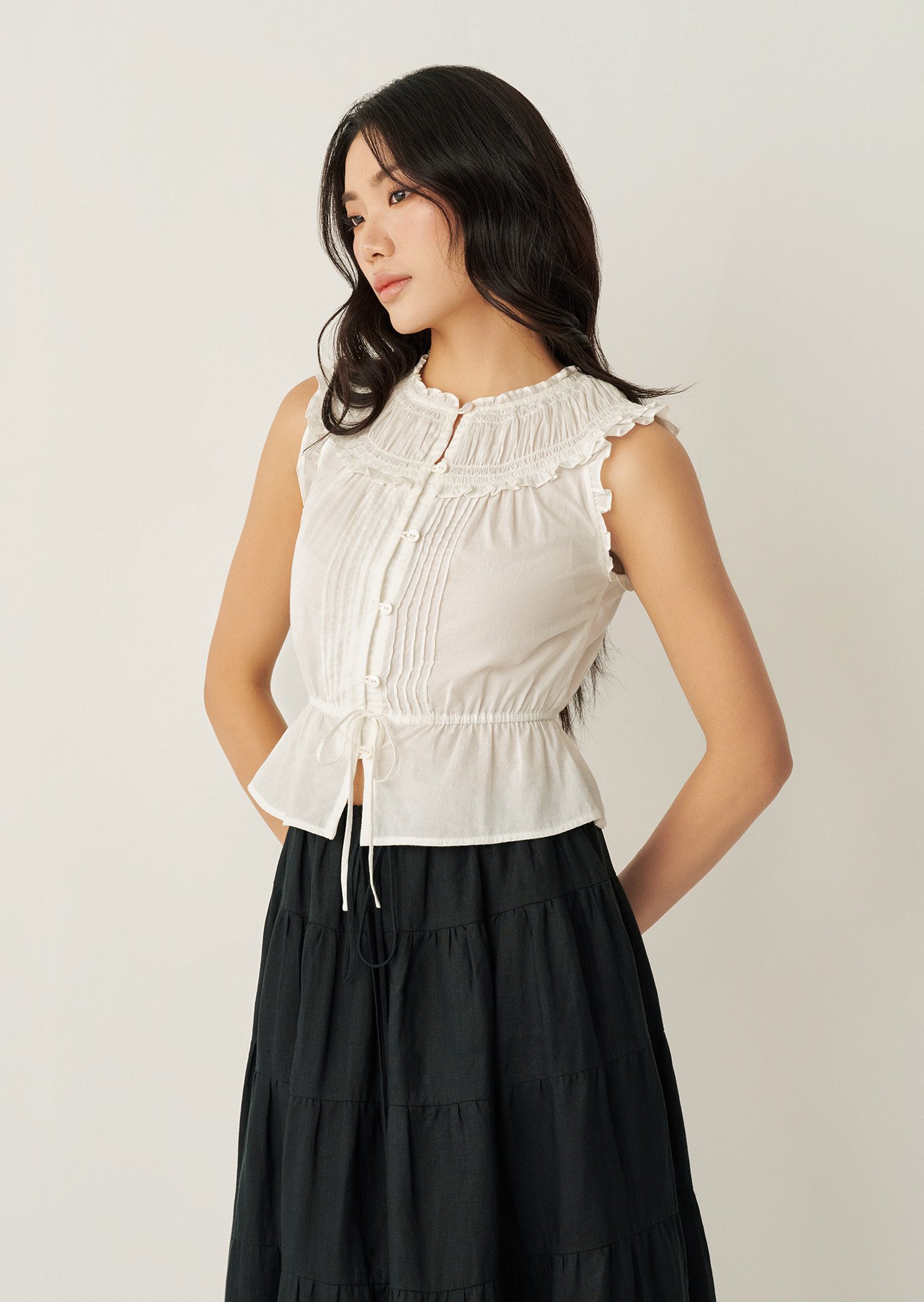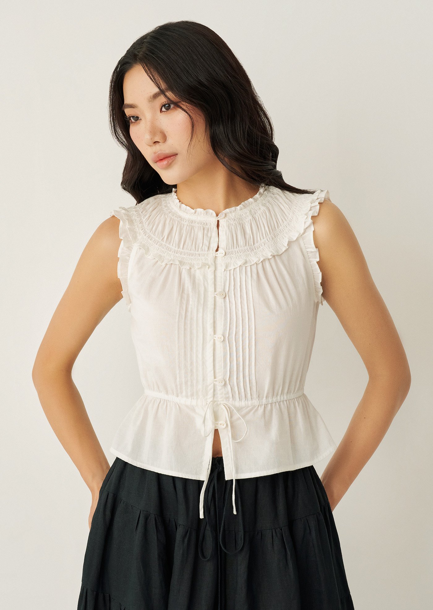 -High ruffled neckline with delicate gathers
