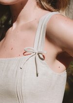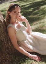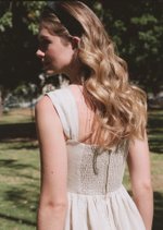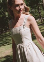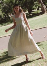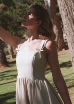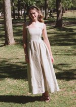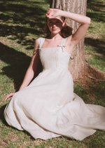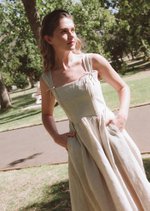The Rio maxi dress showcases a lovely square neckline and ruched sleeves with charming ribbon and pearl details. With its corset-like bodice and handy side pockets, it beautifully blends elegance and practicality.