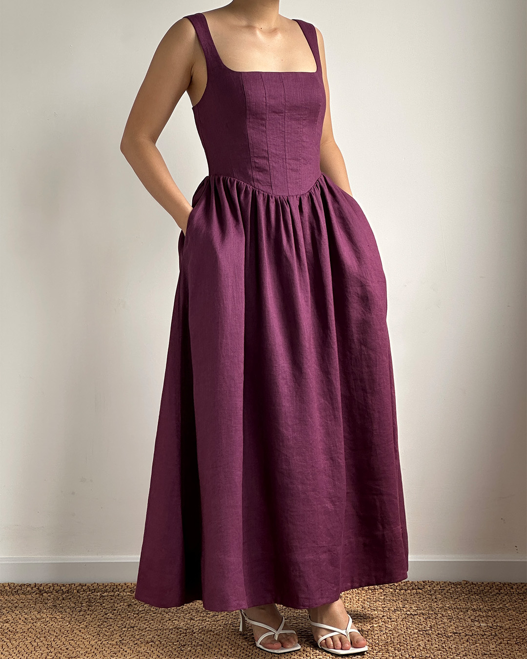 Discover the Sabrina Midaxi Dress, featuring a flattering corset-inspired bodice and handy pockets, ideal for weddings or vacation getaways.
