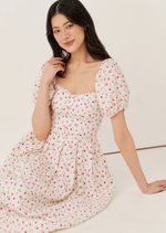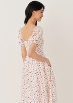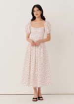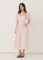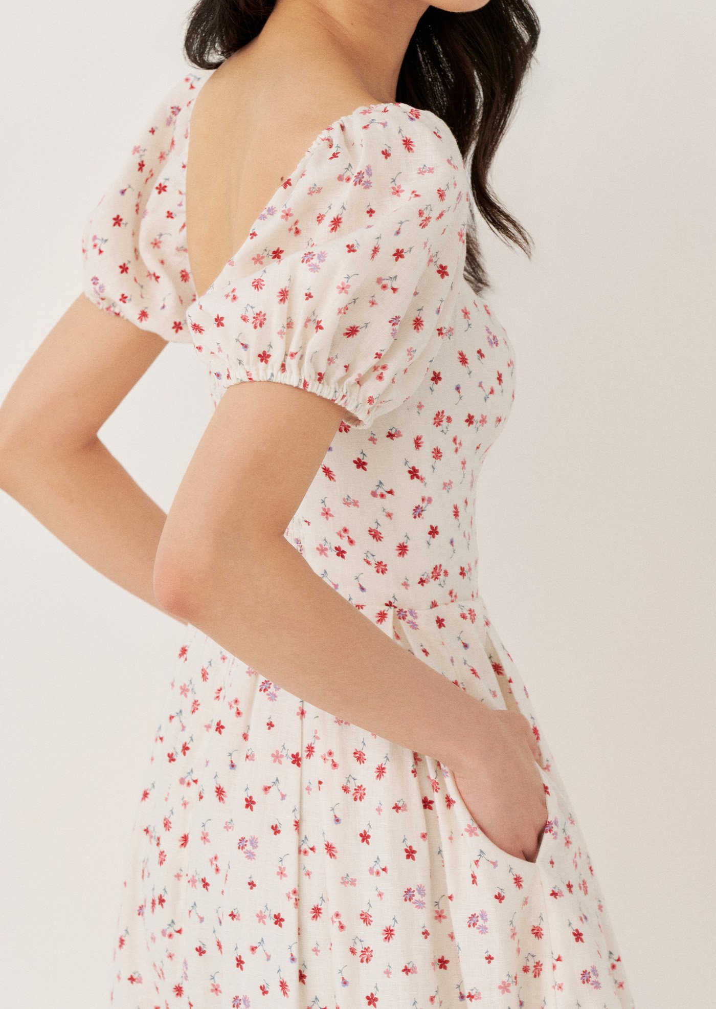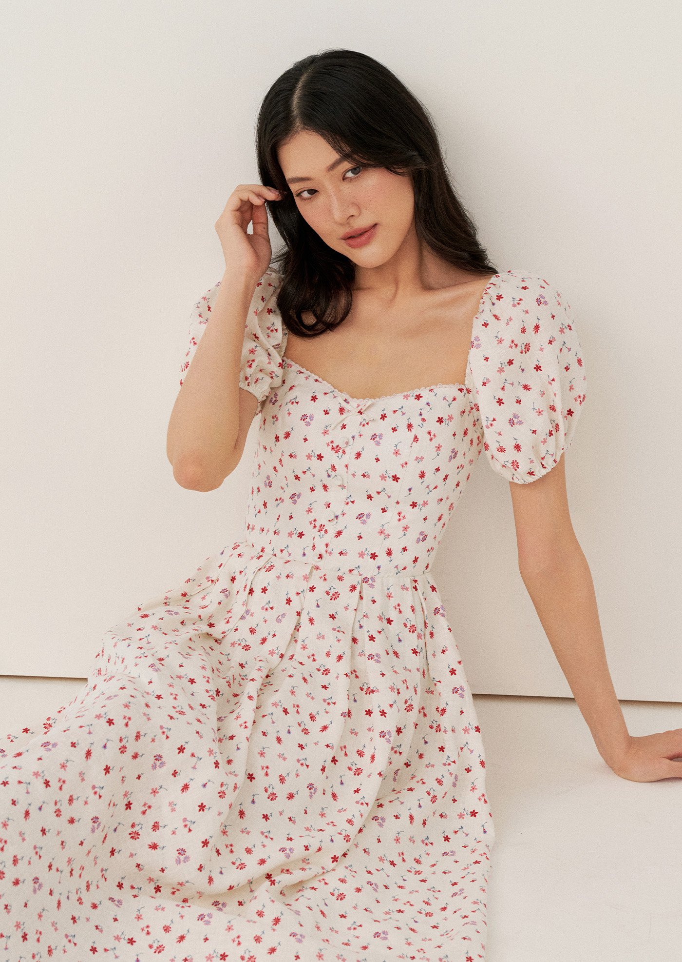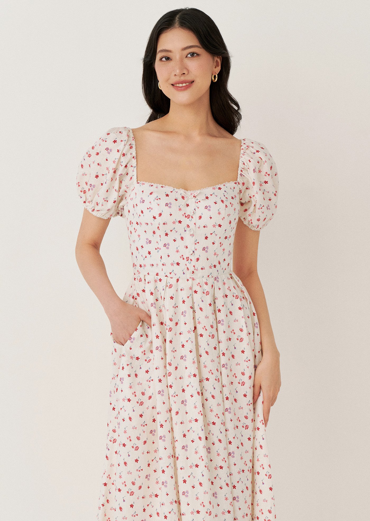 The Sailor Midi Dress features a softly structured bodice with a square neckline and puff sleeves that frame the silhouette beautifully. Finished in a delicate blue floral print, it falls into a full midi skirt for an effortlessly romantic look.