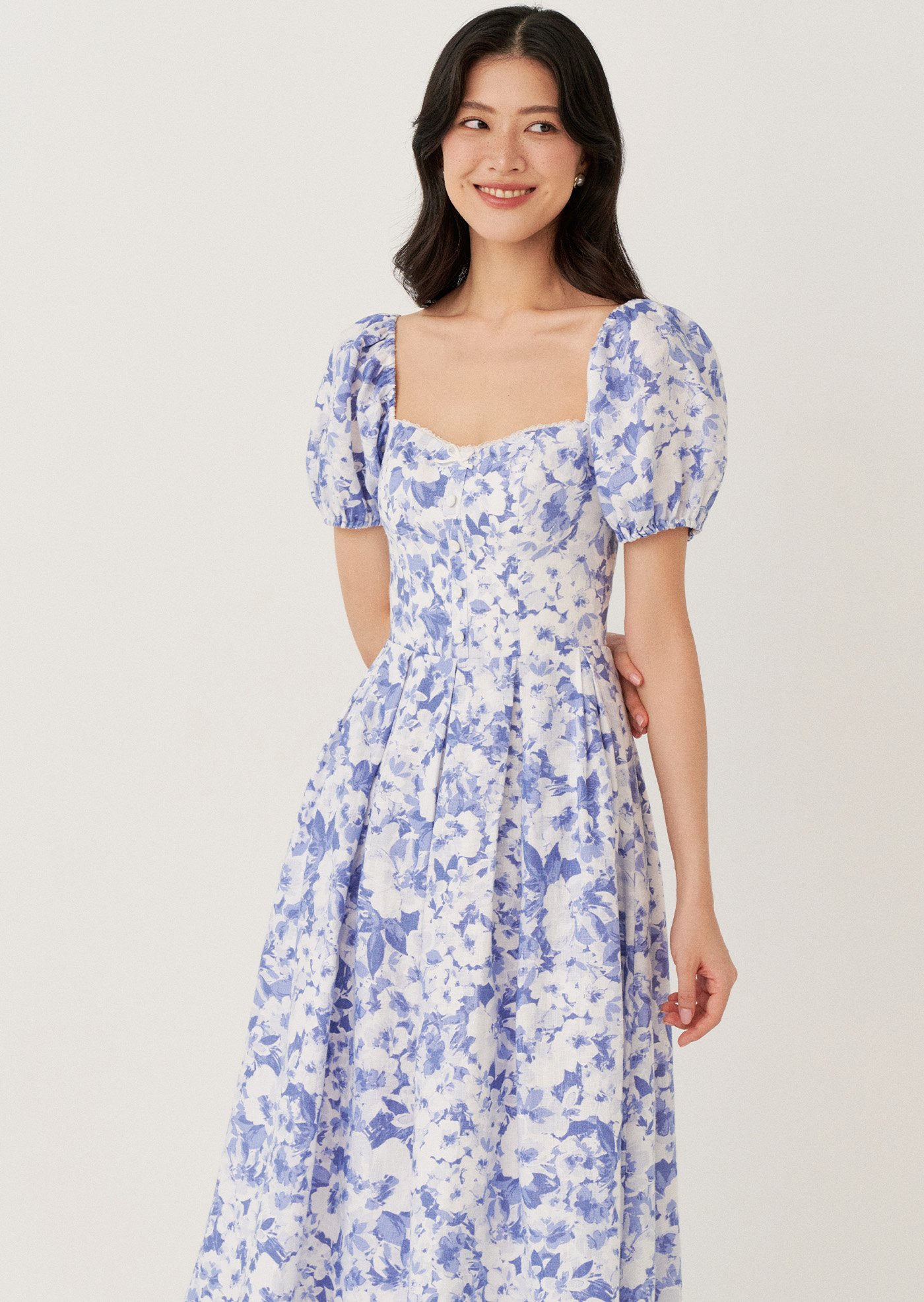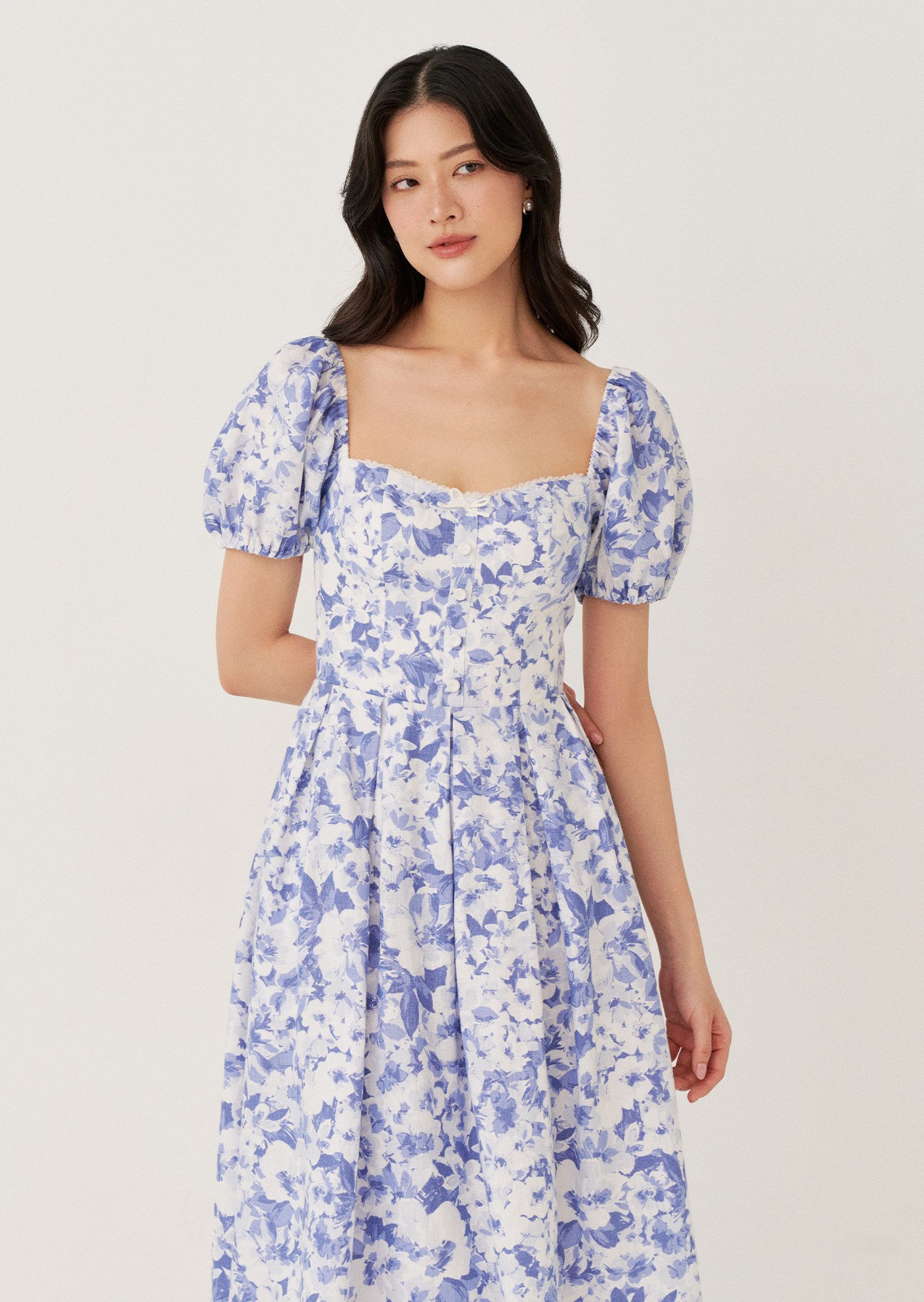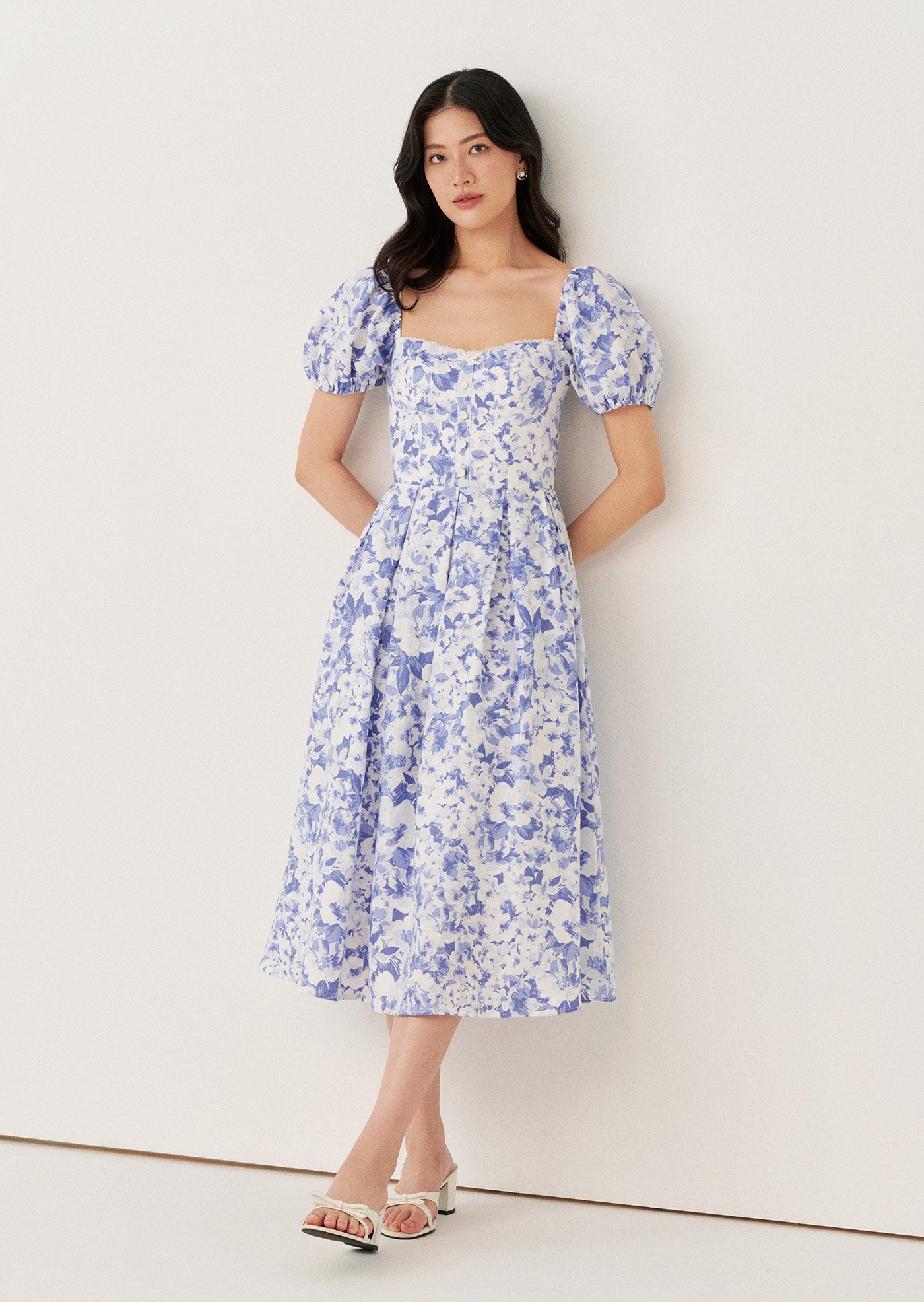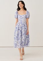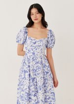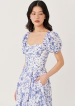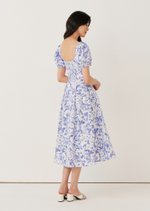 The Sailor Midi Dress features a softly structured bodice with a square neckline and puff sleeves that frame the silhouette beautifully. Finished in a delicate blue floral print, it falls into a full midi skirt for an effortlessly romantic look.