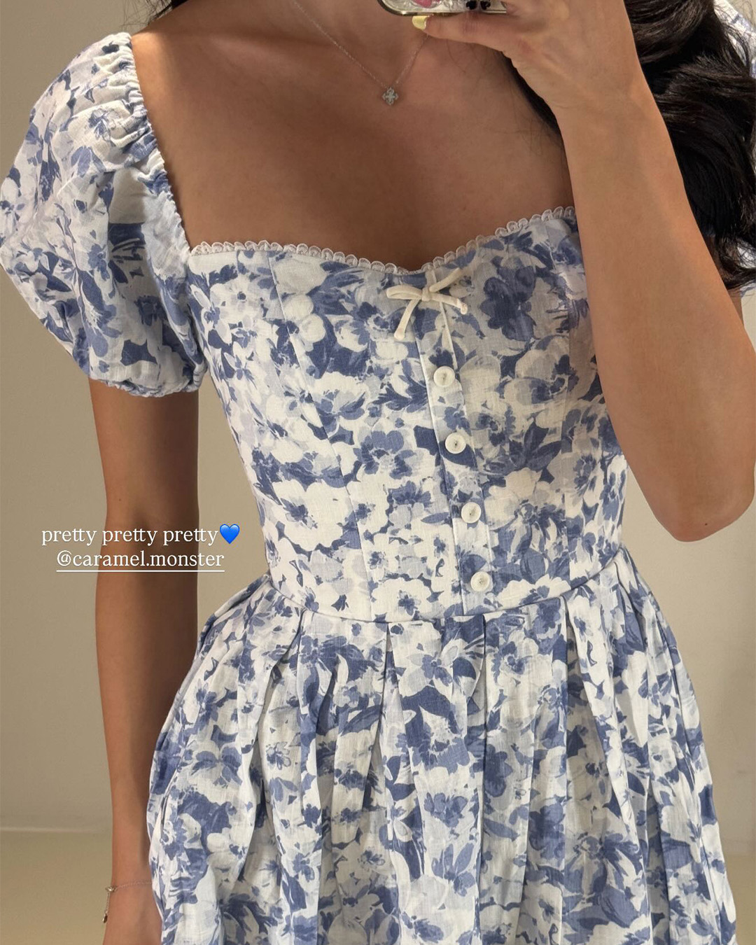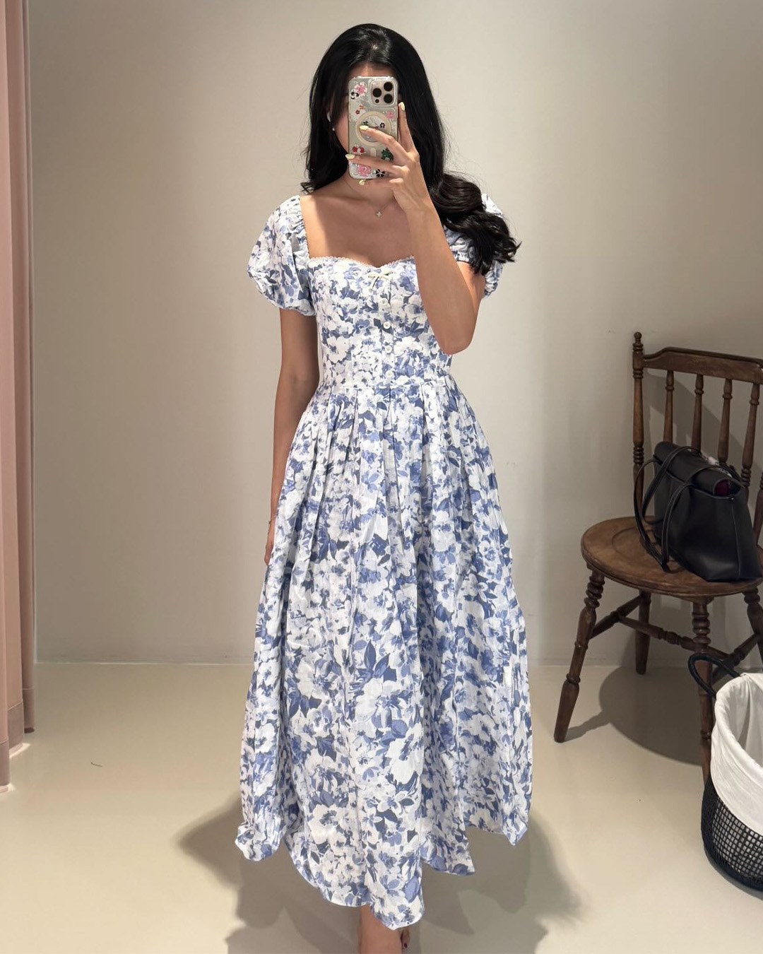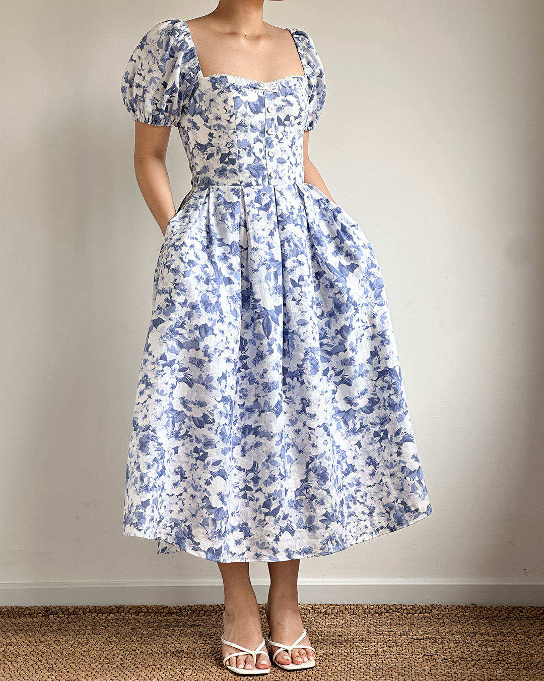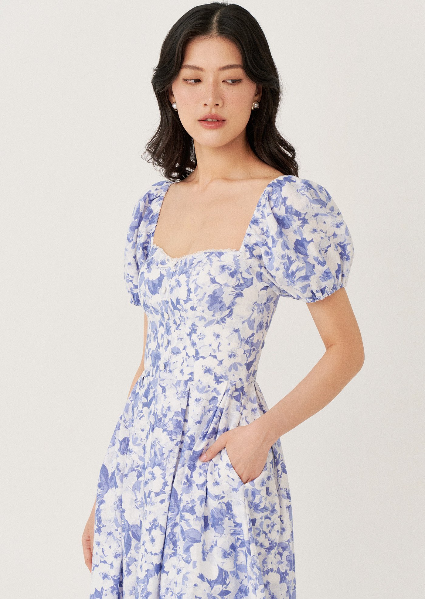 The Sailor Midi Dress features a softly structured bodice with a square neckline and puff sleeves that frame the silhouette beautifully. Finished in a delicate blue floral print, it falls into a full midi skirt for an effortlessly romantic look.