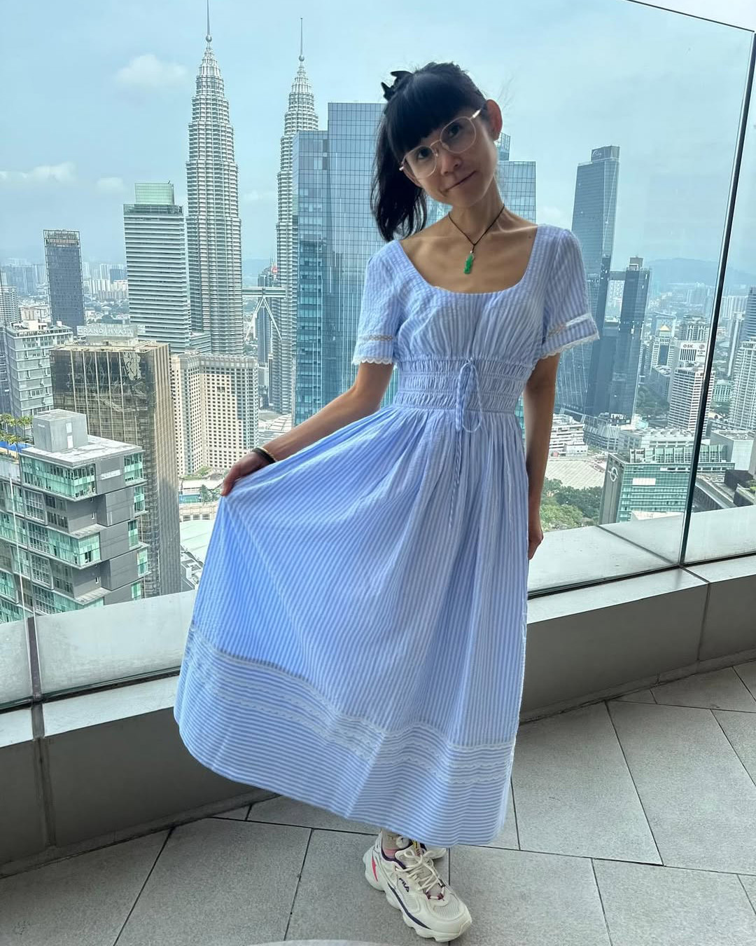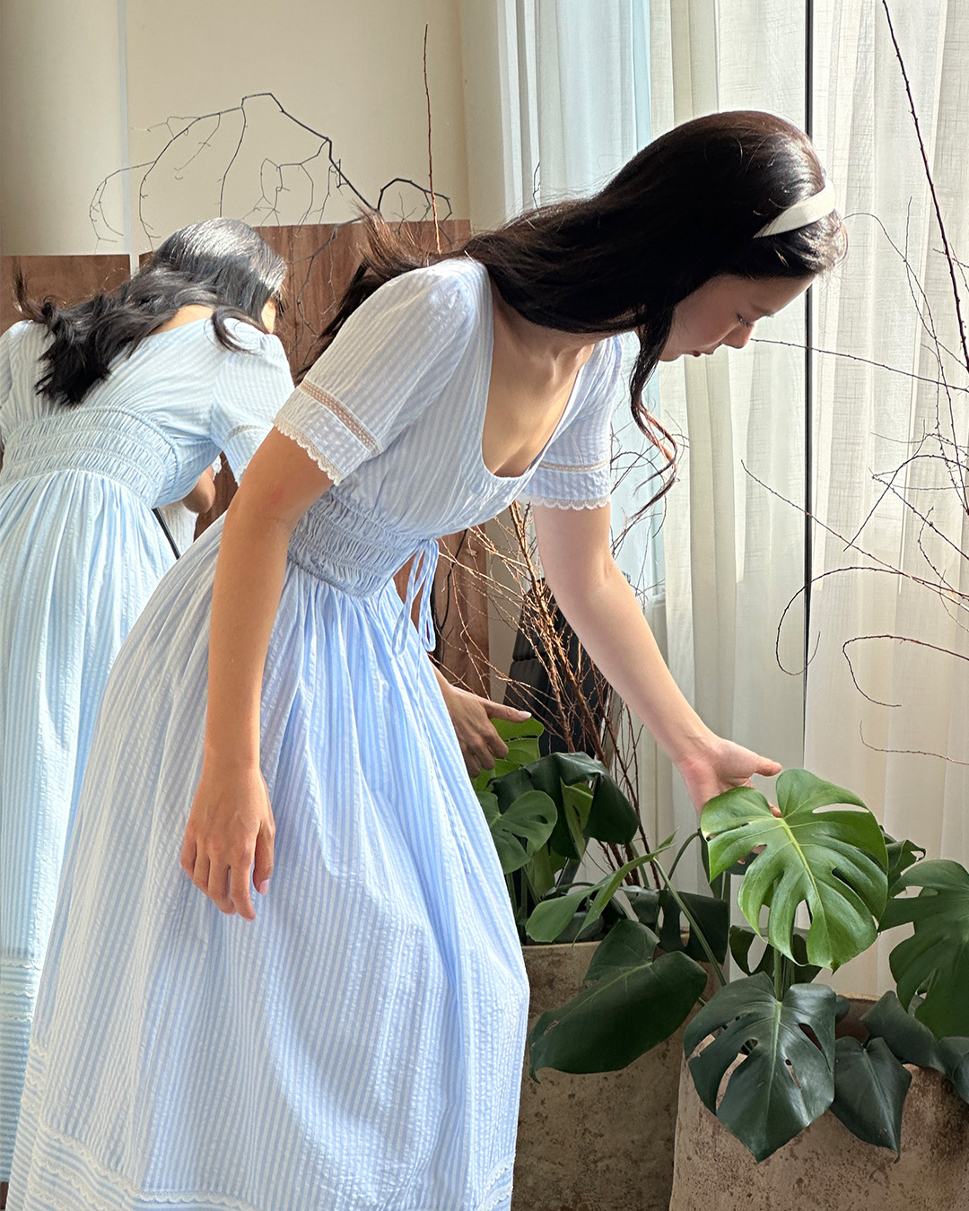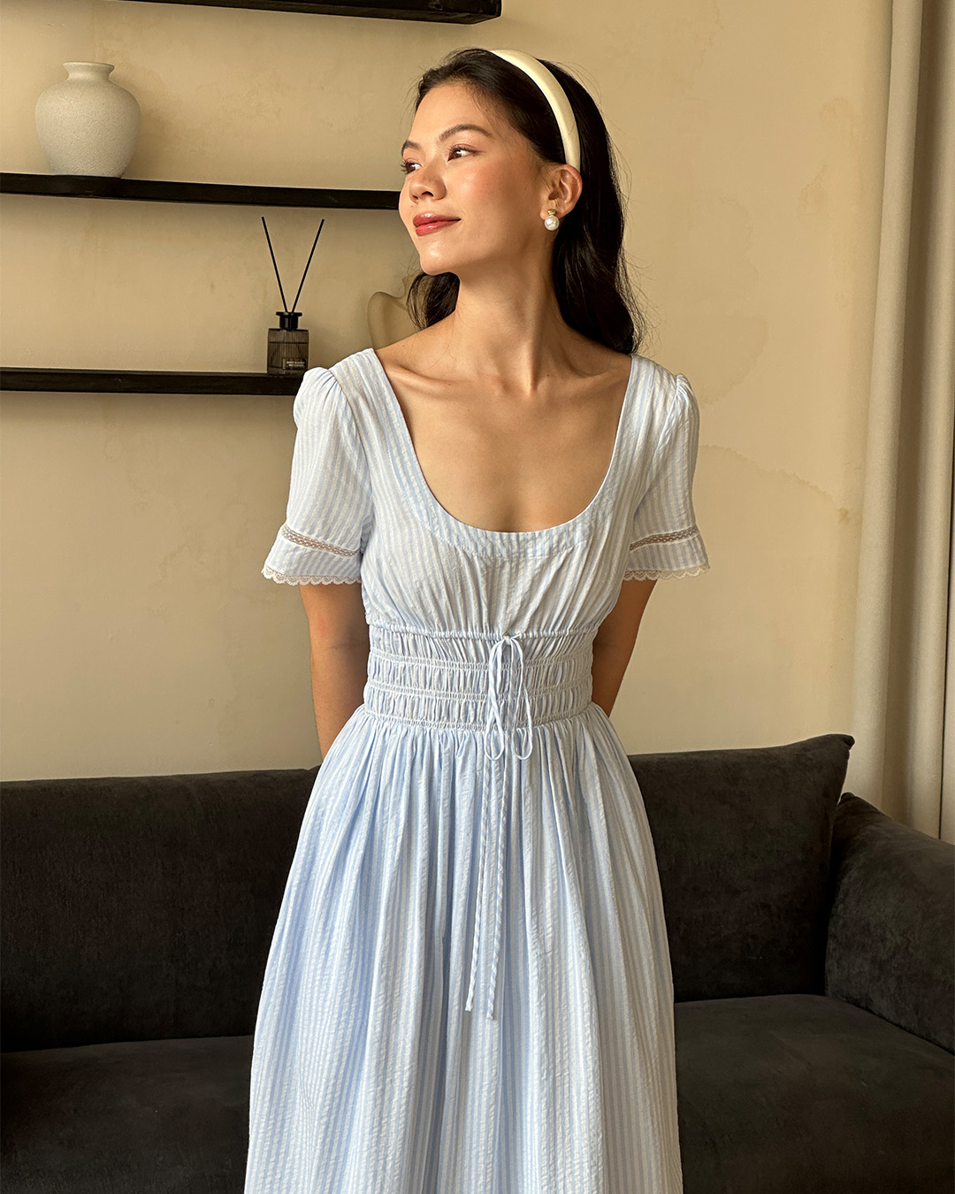 The Scarlett Midi is a sweet summer classic, featuring soft blue stripes, a smocked bodice, and delicate lace accents for a nostalgic touch. With its flattering scoop neckline and breezy silhouette, it’s made for sunlit strolls and effortless charm.