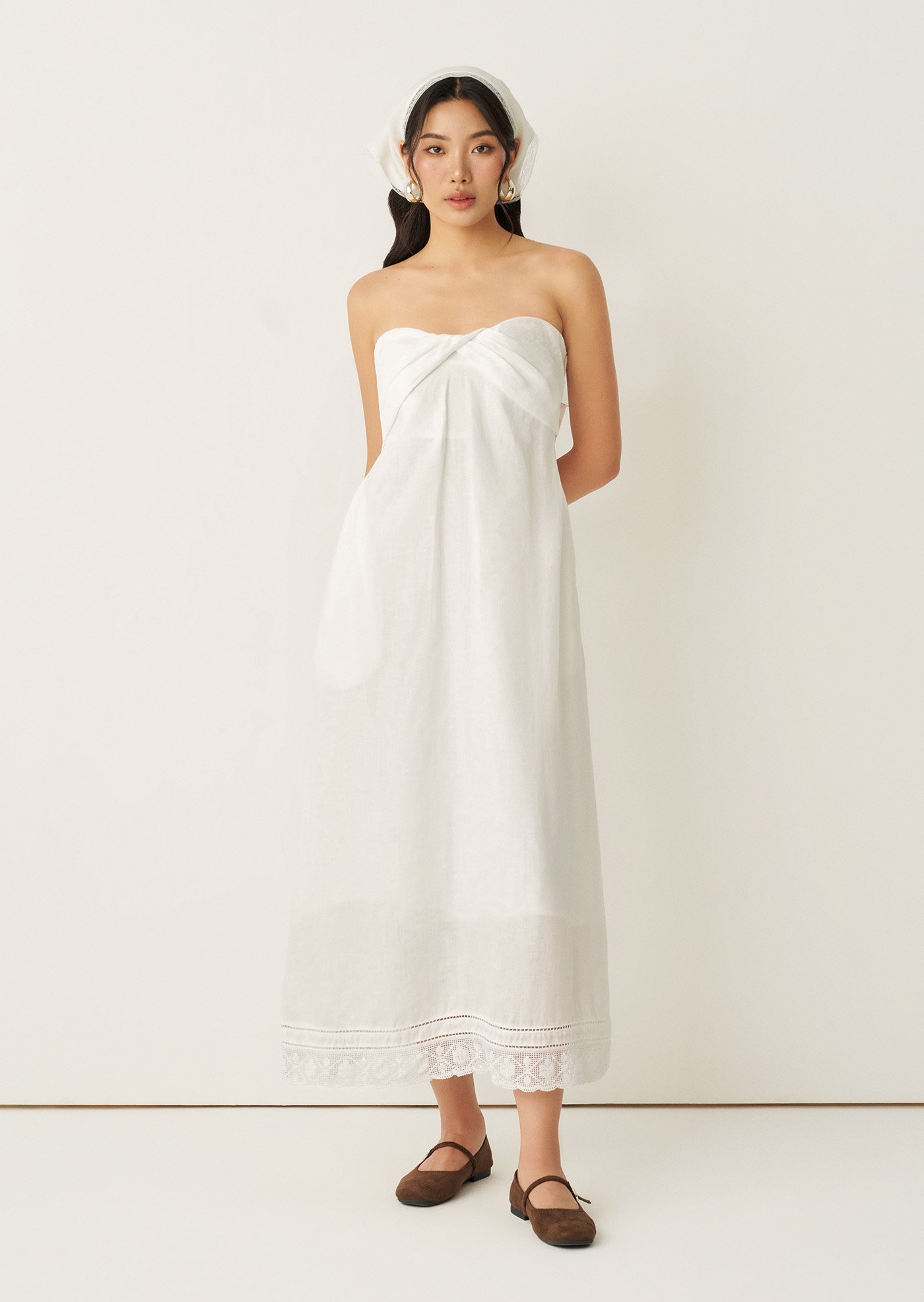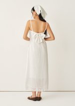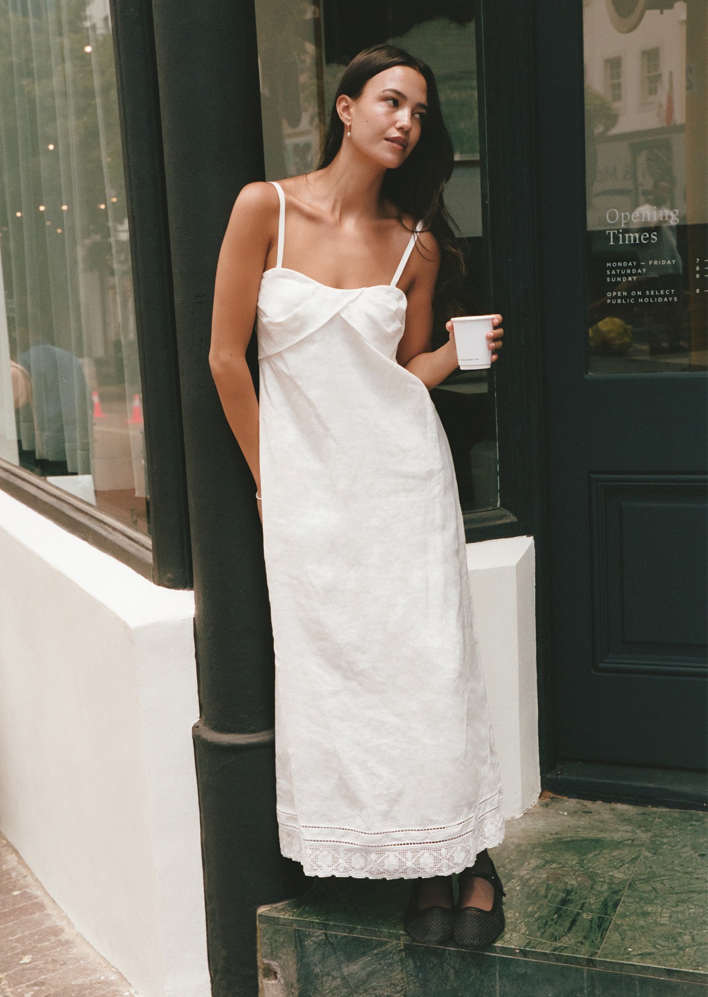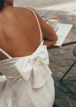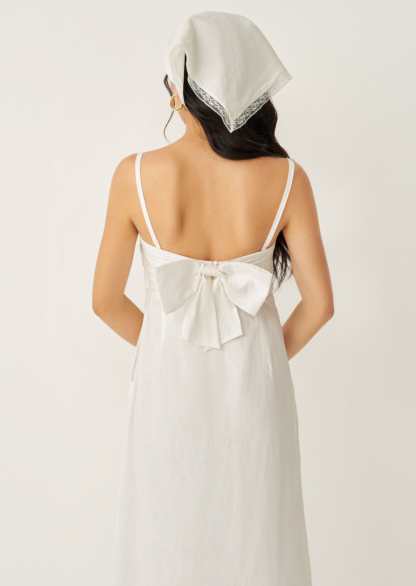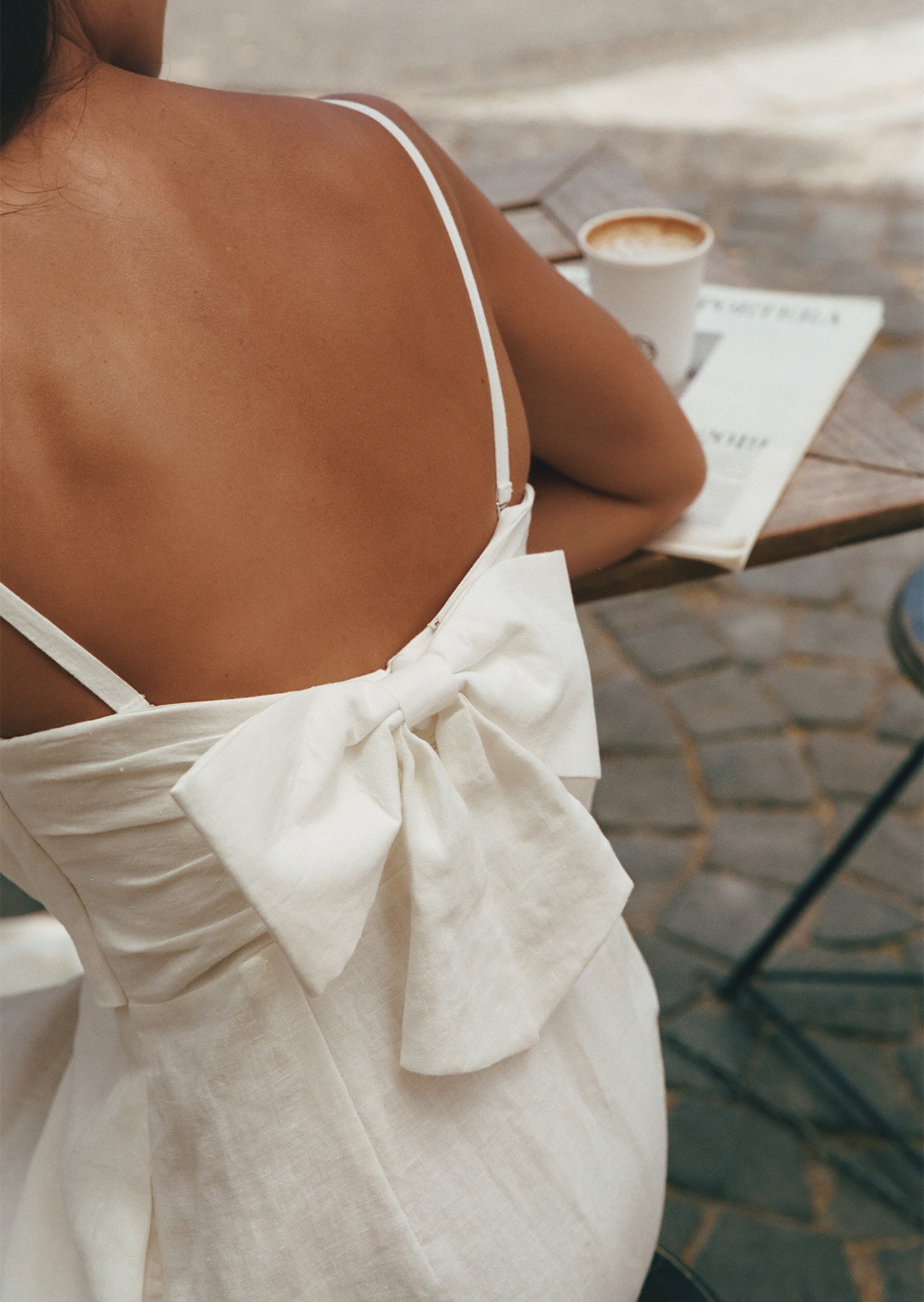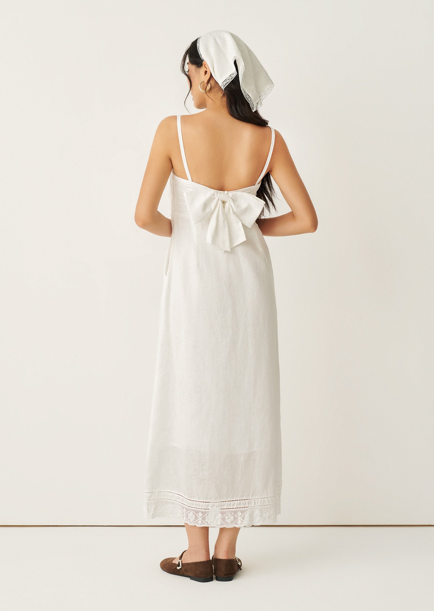 An airy linen maxi with a softly draped neckline, slim straps, and a flowy silhouette. Finished with a statement back bow and delicate lace hem, Seraphine is effortless, romantic, and easy to wear.