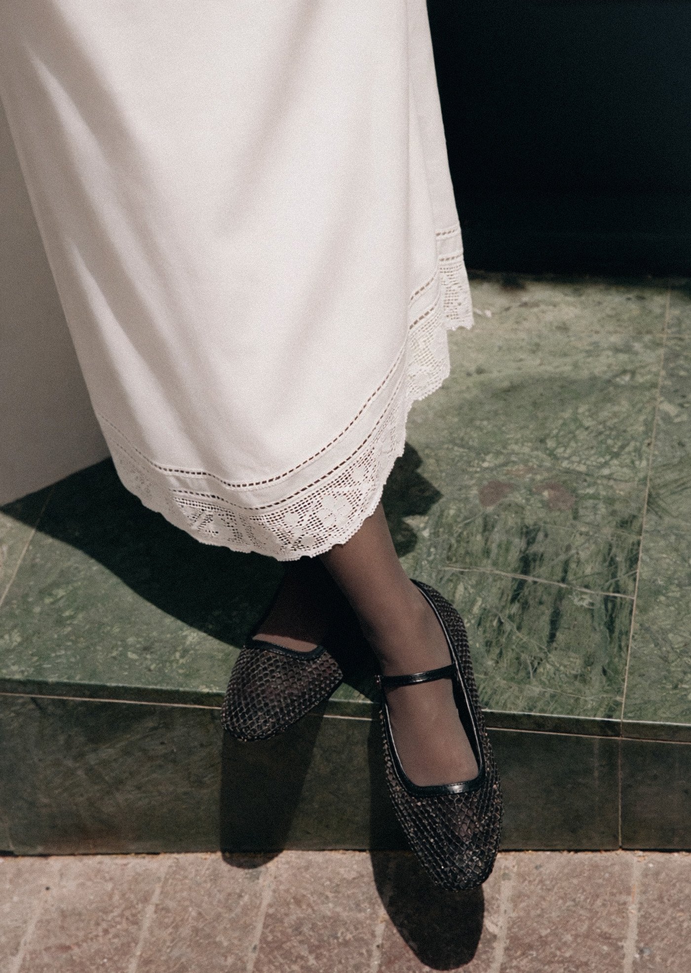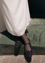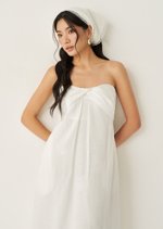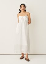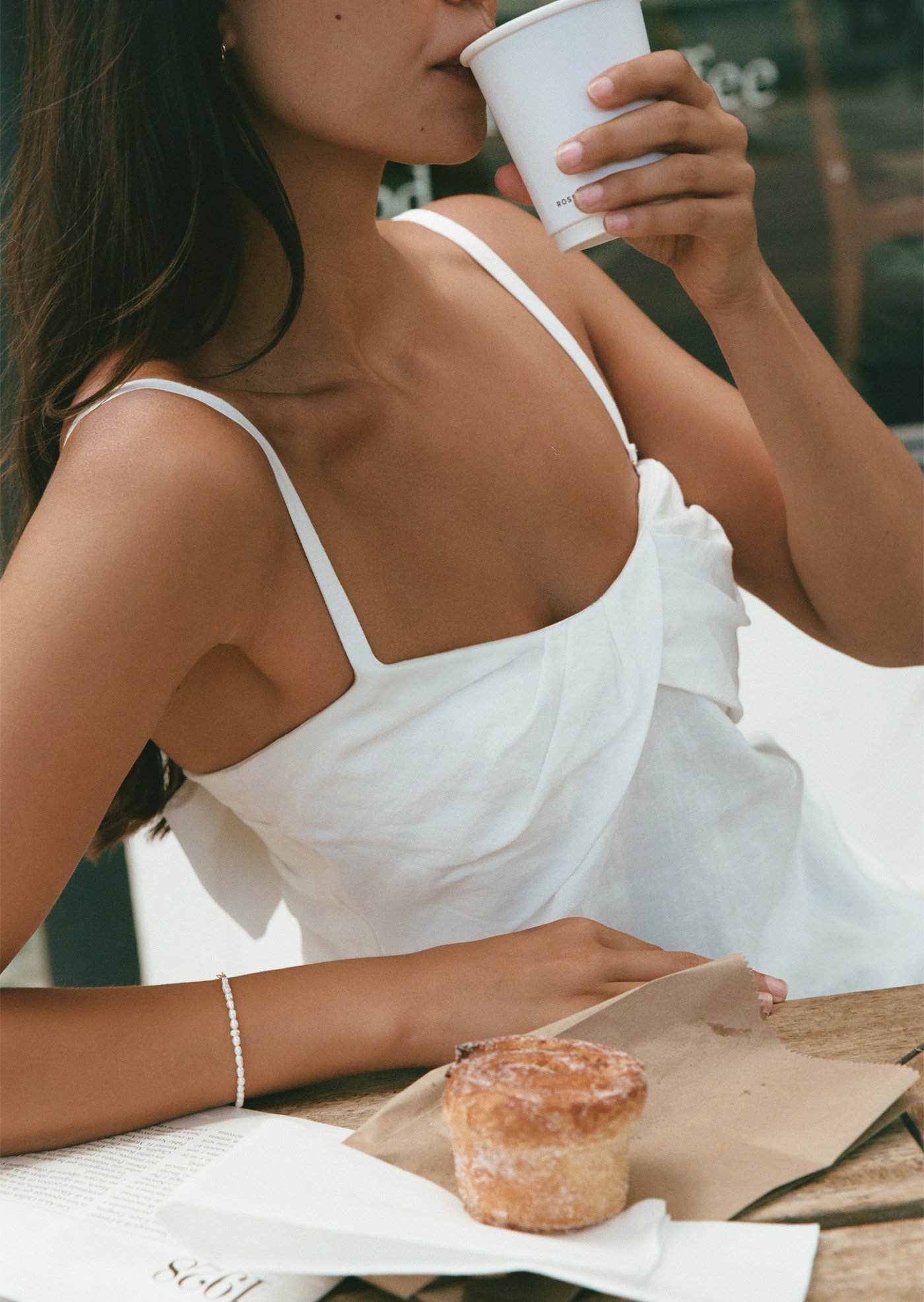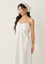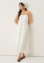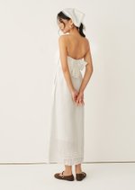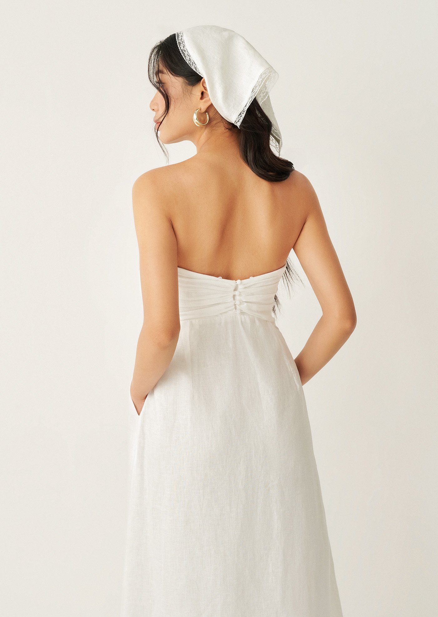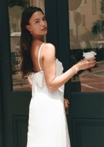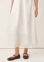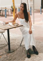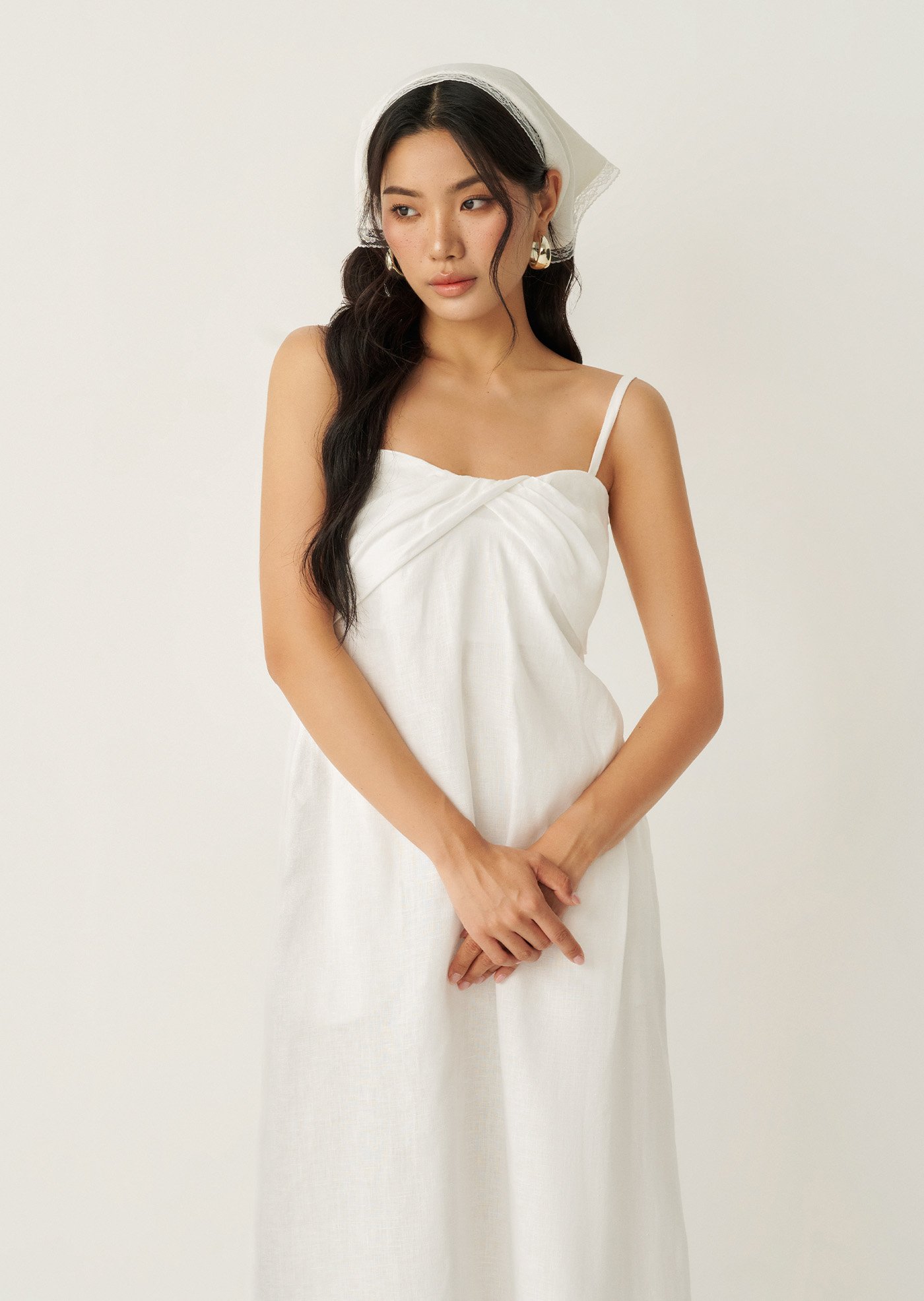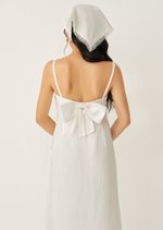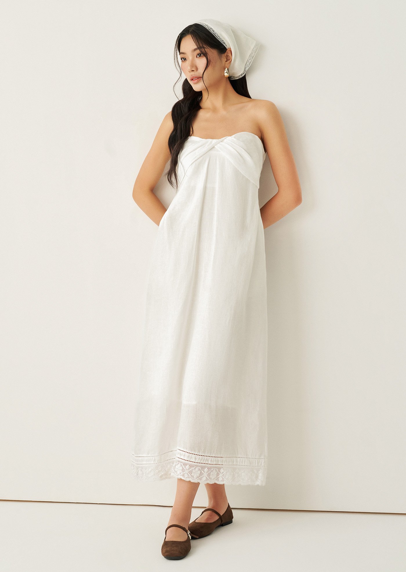 An airy linen maxi with a softly draped neckline, slim straps, and a flowy silhouette. Finished with a statement back bow and delicate lace hem, Seraphine is effortless, romantic, and easy to wear.