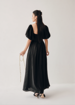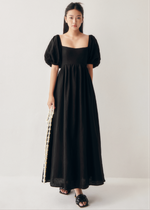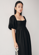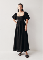 The Sherlyn is a midaxi length dress with a fitted bodice, voluminous sleeves and full skirt. Self lined bodice, side pockets and centre back zipper.