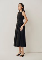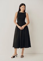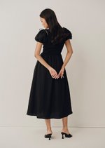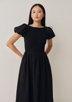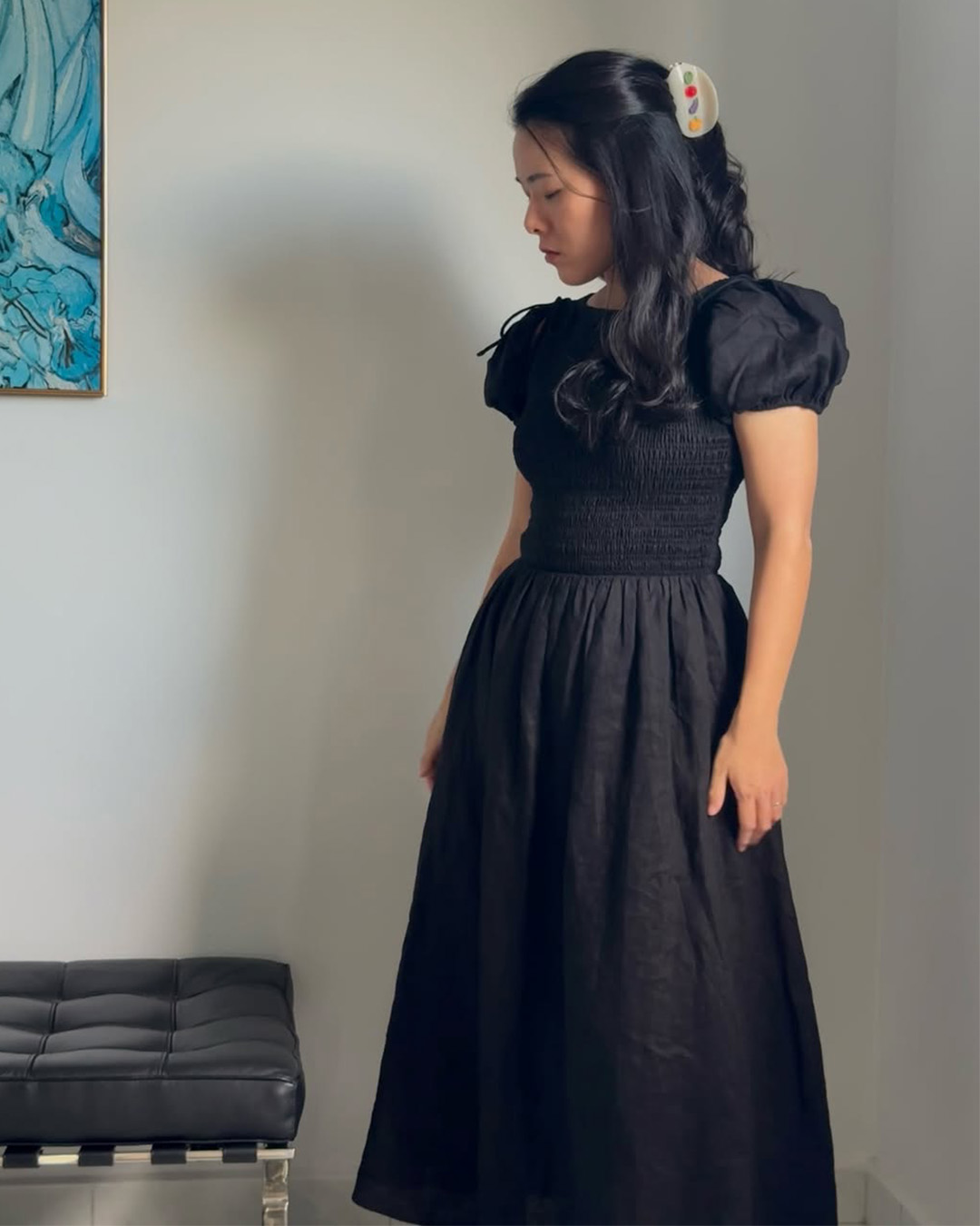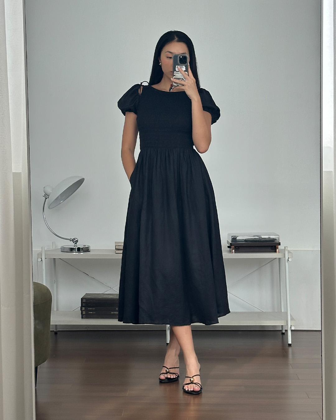 The Sophia Midi Dress blends classic charm with thoughtful details — featuring a boat neckline, fully smocked bodice, and detachable puff sleeves with sweet shoulder ties. With its high-waisted silhouette, hidden pockets, and soft lining, it’s designed for comfort, movement, and quiet elegance all at once.