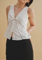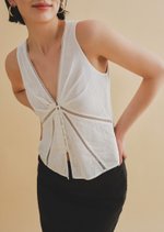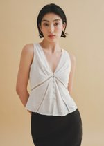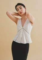 Discover the effortless charm of the Sur Top—a relaxed fit that combines comfort and contemporary style. Featuring a plunging V neckline, a diagonal seam accented with delicate lace trims, and a button-and-loop opening, this top is designed for everyday elegance.
