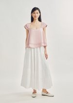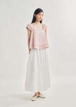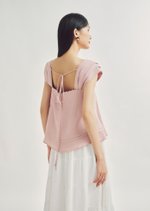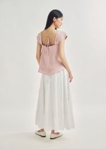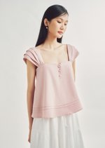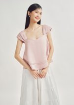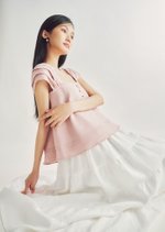 The scalloped series that you've all been waiting for. The Vel top showcases a sweetheart neckline with scalloped hems, and folded sleeves, all adorned with buttons and a self-tied back ribbon detailing.