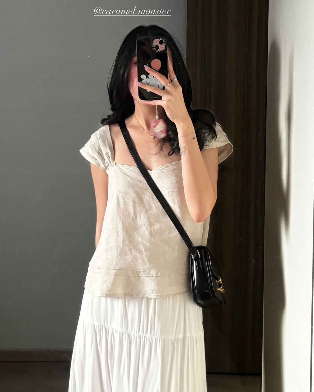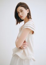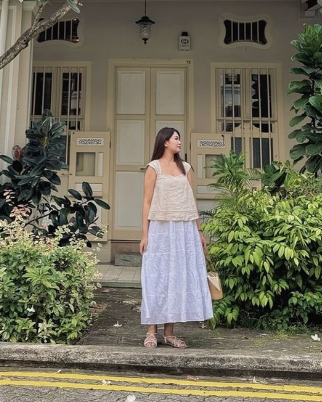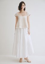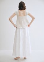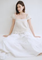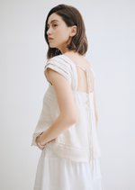 The Vel top showcases a sweetheart neckline with scalloped hems, and folded sleeves, all adorned with buttons and a self-tied back ribbon detailing.