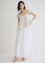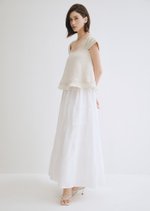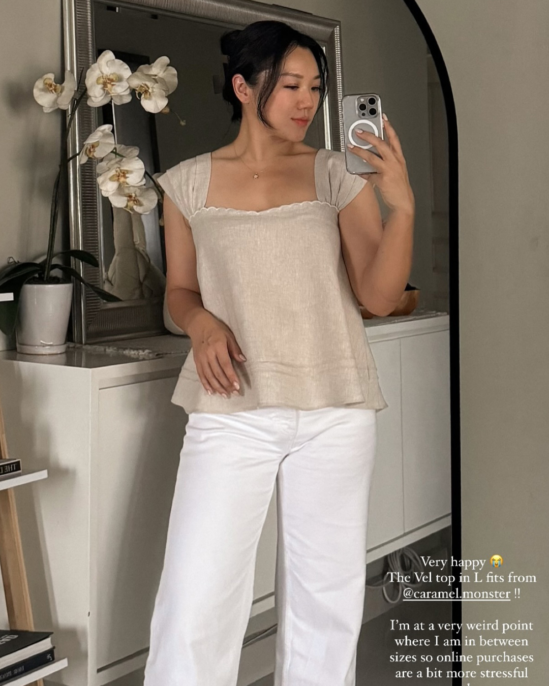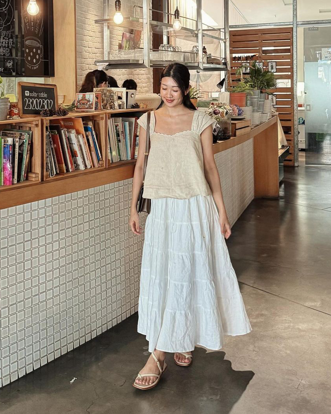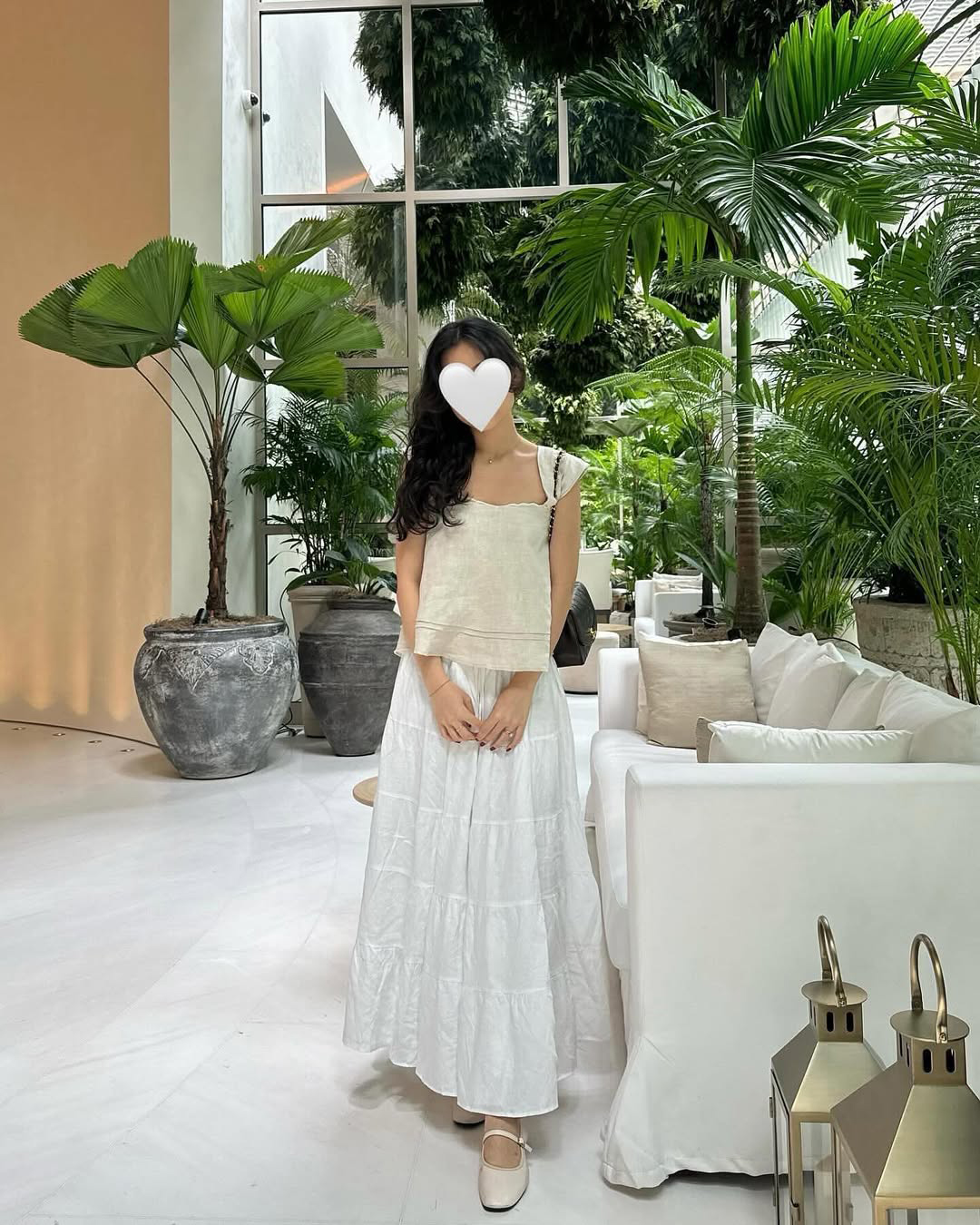The Vel top showcases a sweetheart neckline with scalloped hems, and folded sleeves, all adorned with buttons and a self-tied back ribbon detailing.