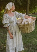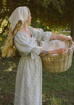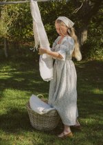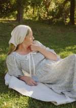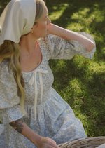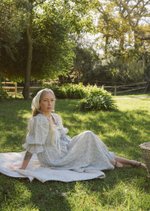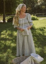The Vesna Midi blends romance and ease with its smocked bodice, ruffled square neckline, and flowing A-line skirt. Finished with 3/4 puff sleeves, a back zip, and a soft front tie — an effortless piece for sunlit days.