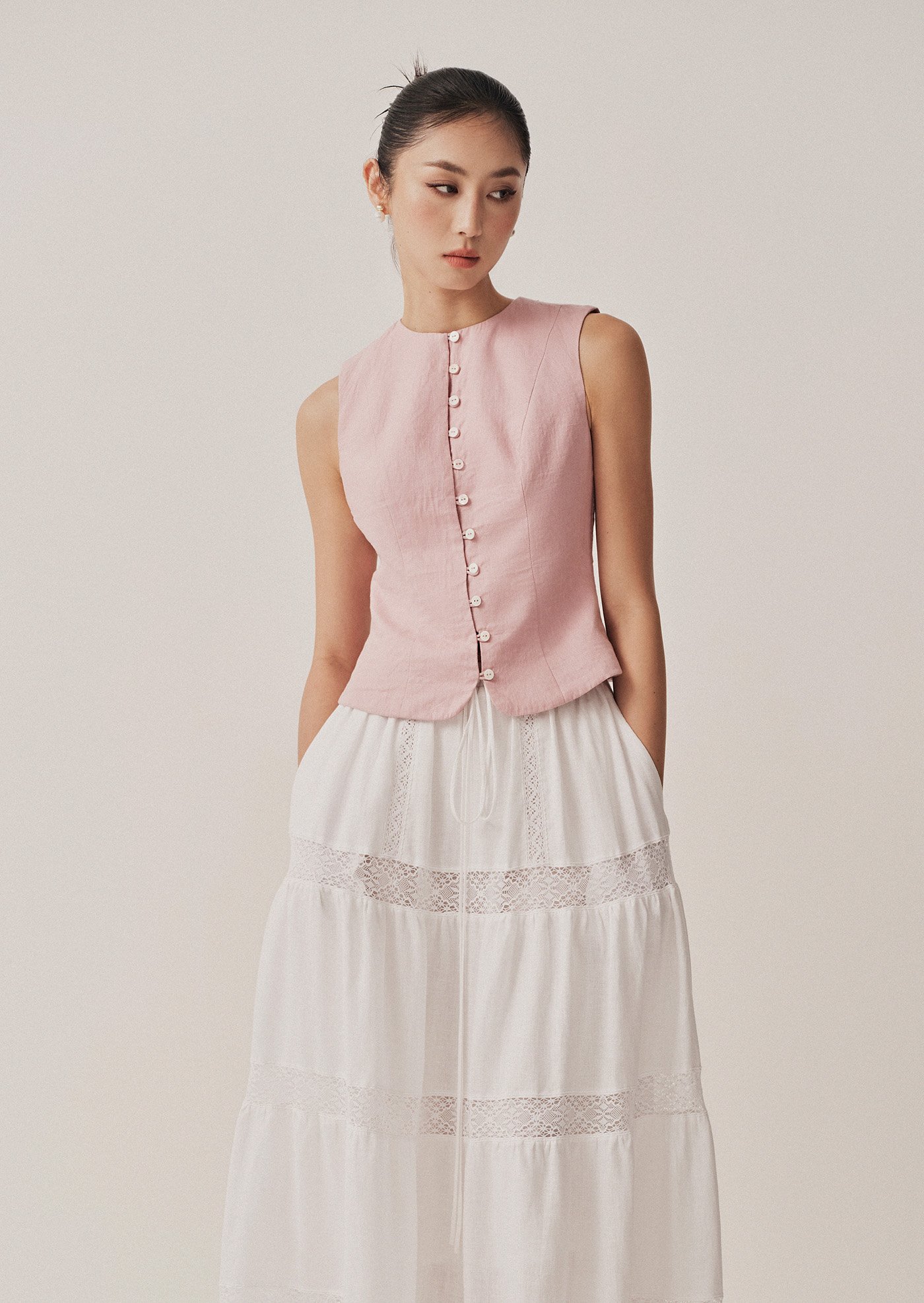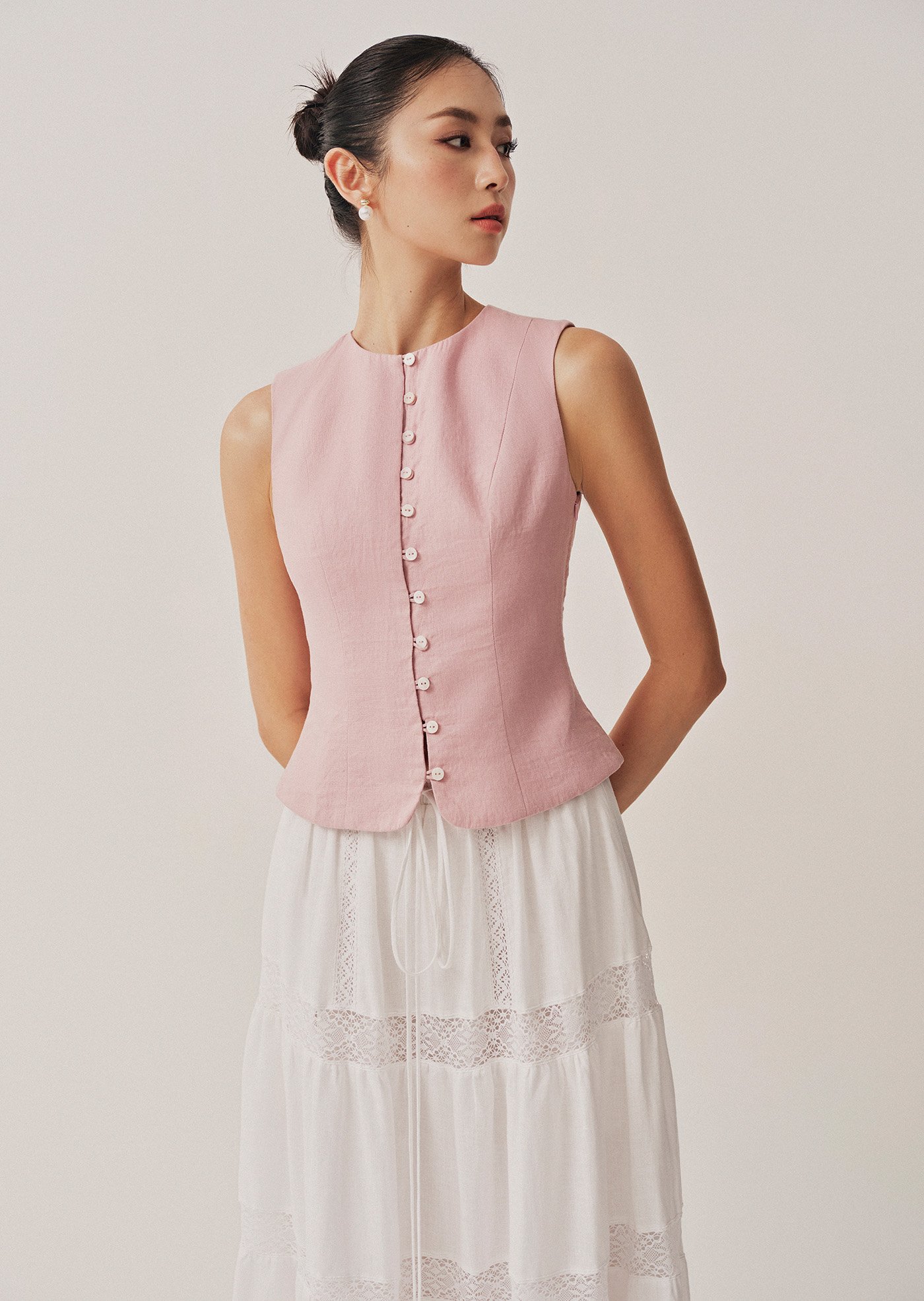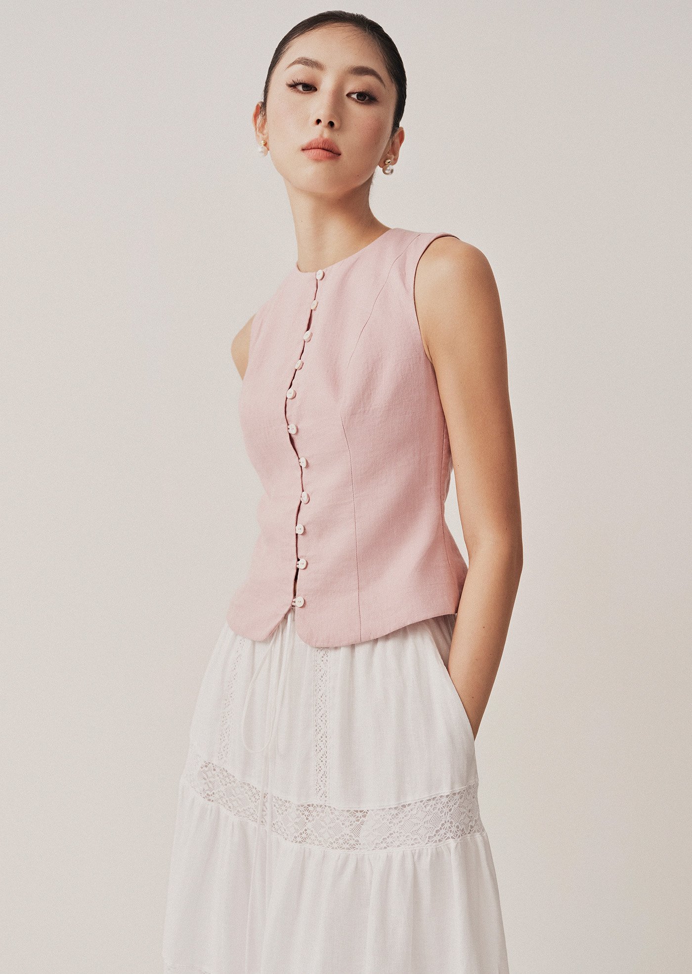 The Vivi Top is a modern take on a classic silhouette—elegant, minimal, and quietly refined. With its clean lines and asymmetrical button detail, it's a piece that moves effortlessly from workdays to slow weekends.