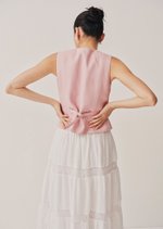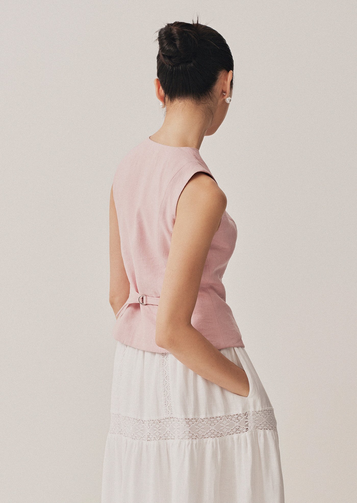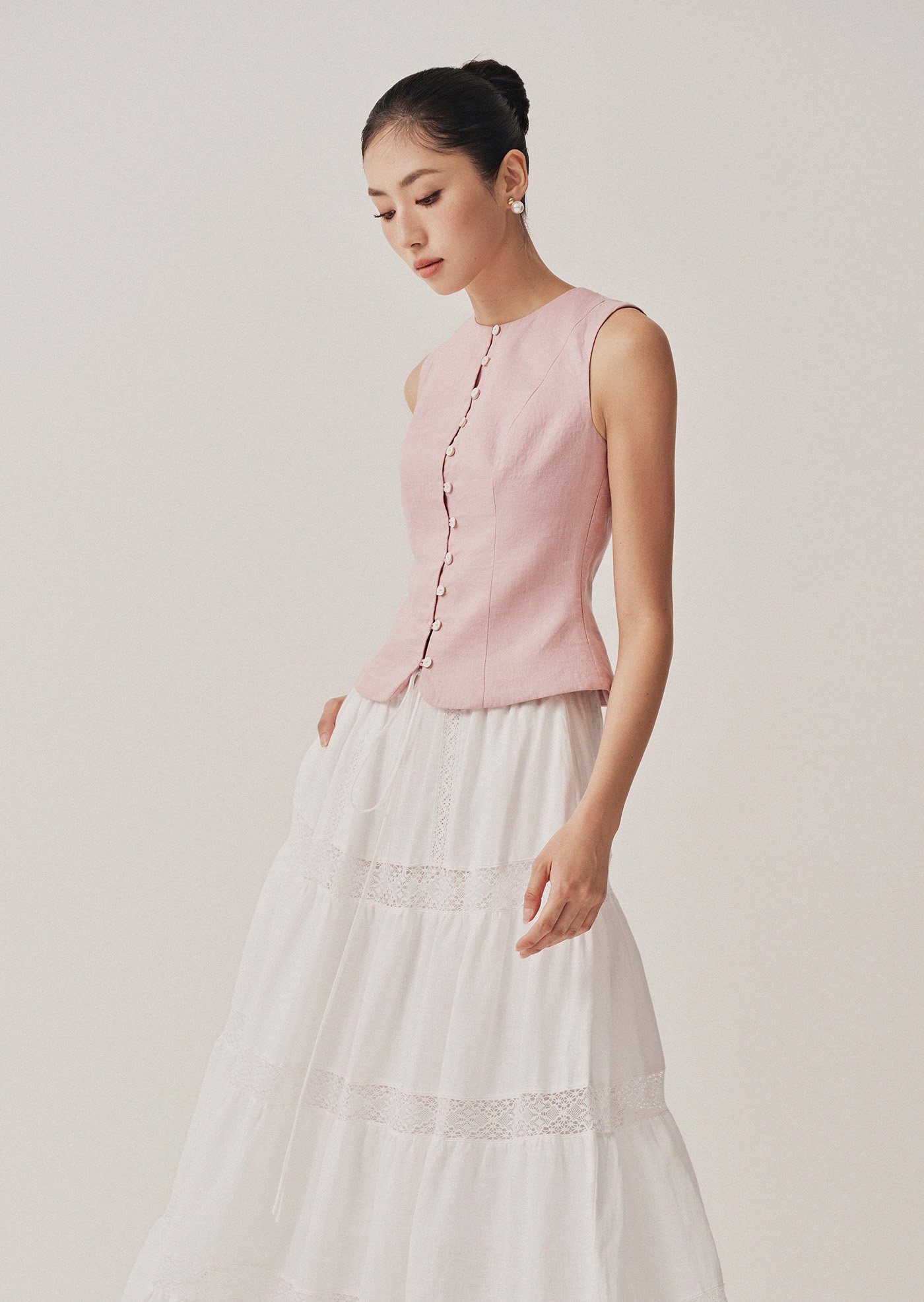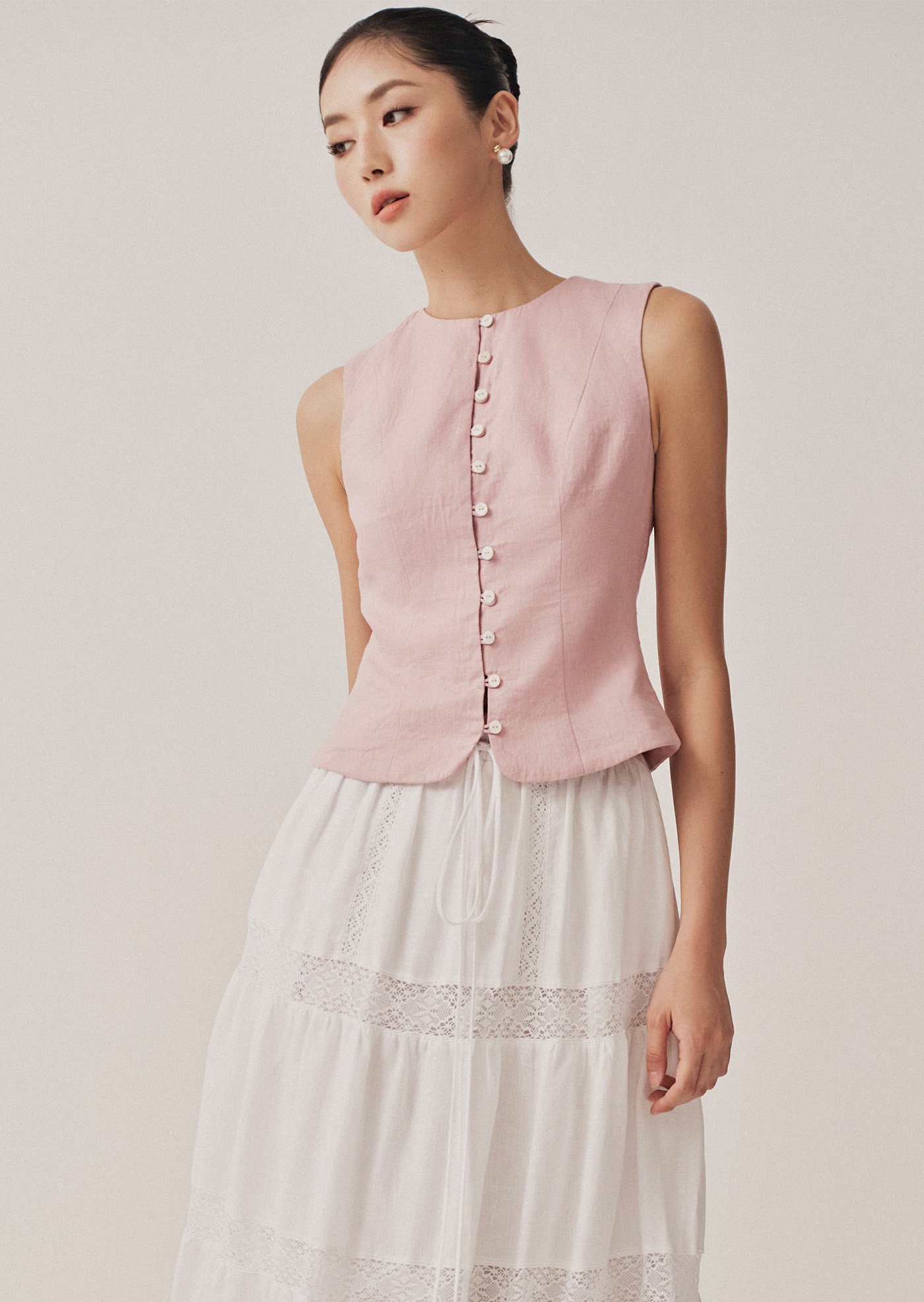 The Vivi Top is a modern take on a classic silhouette—elegant, minimal, and quietly refined. With its clean lines and asymmetrical button detail, it's a piece that moves effortlessly from workdays to slow weekends.