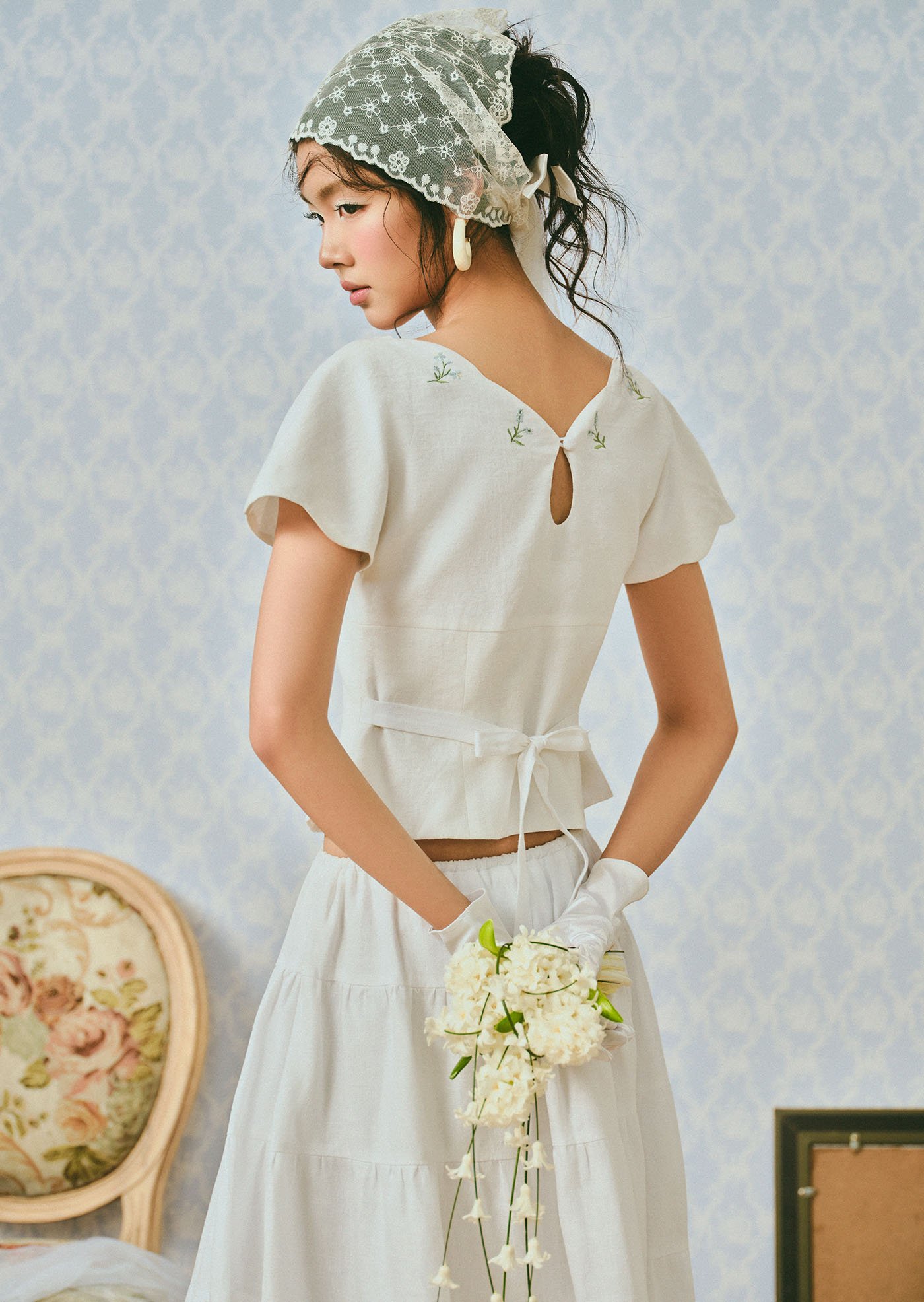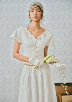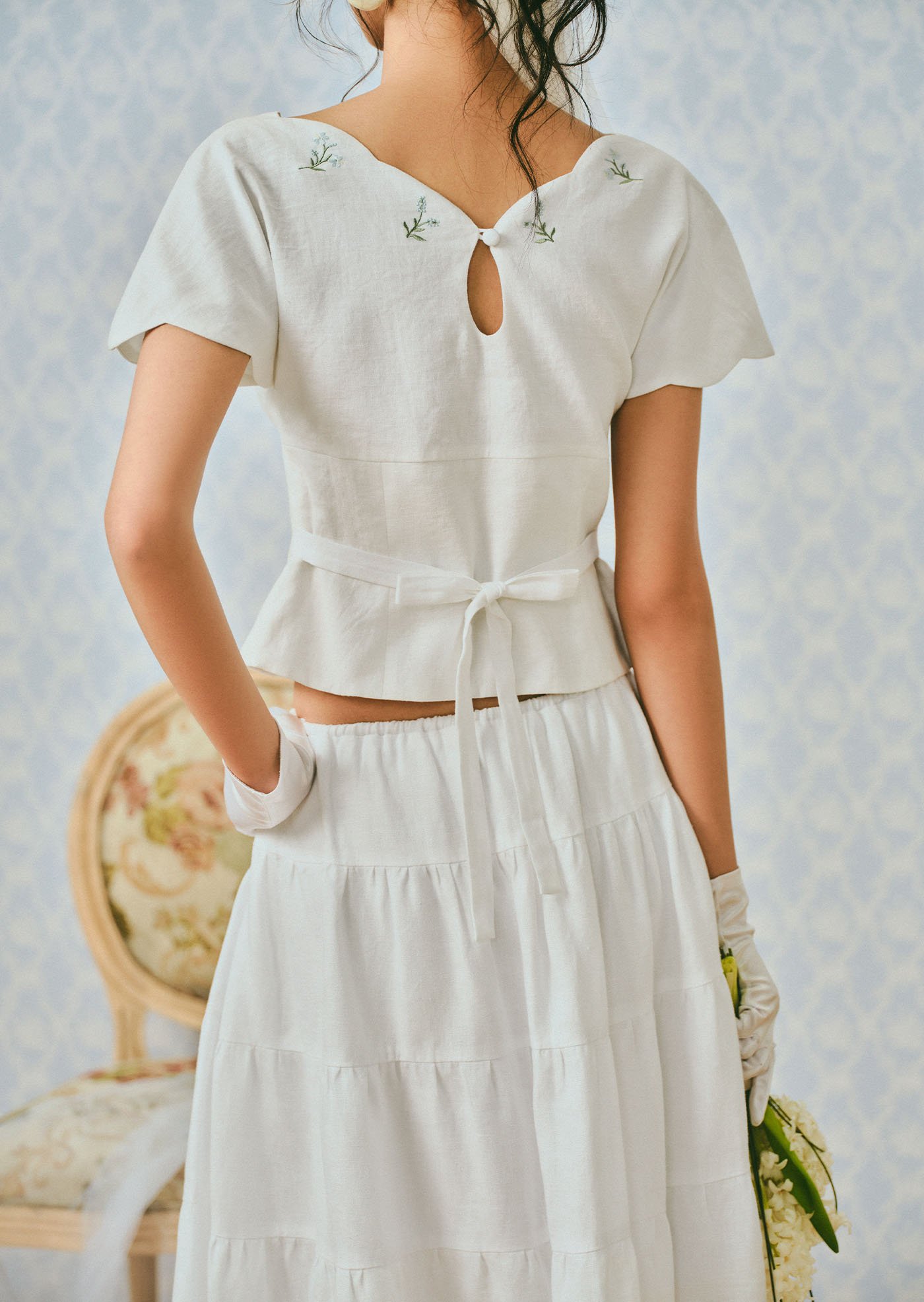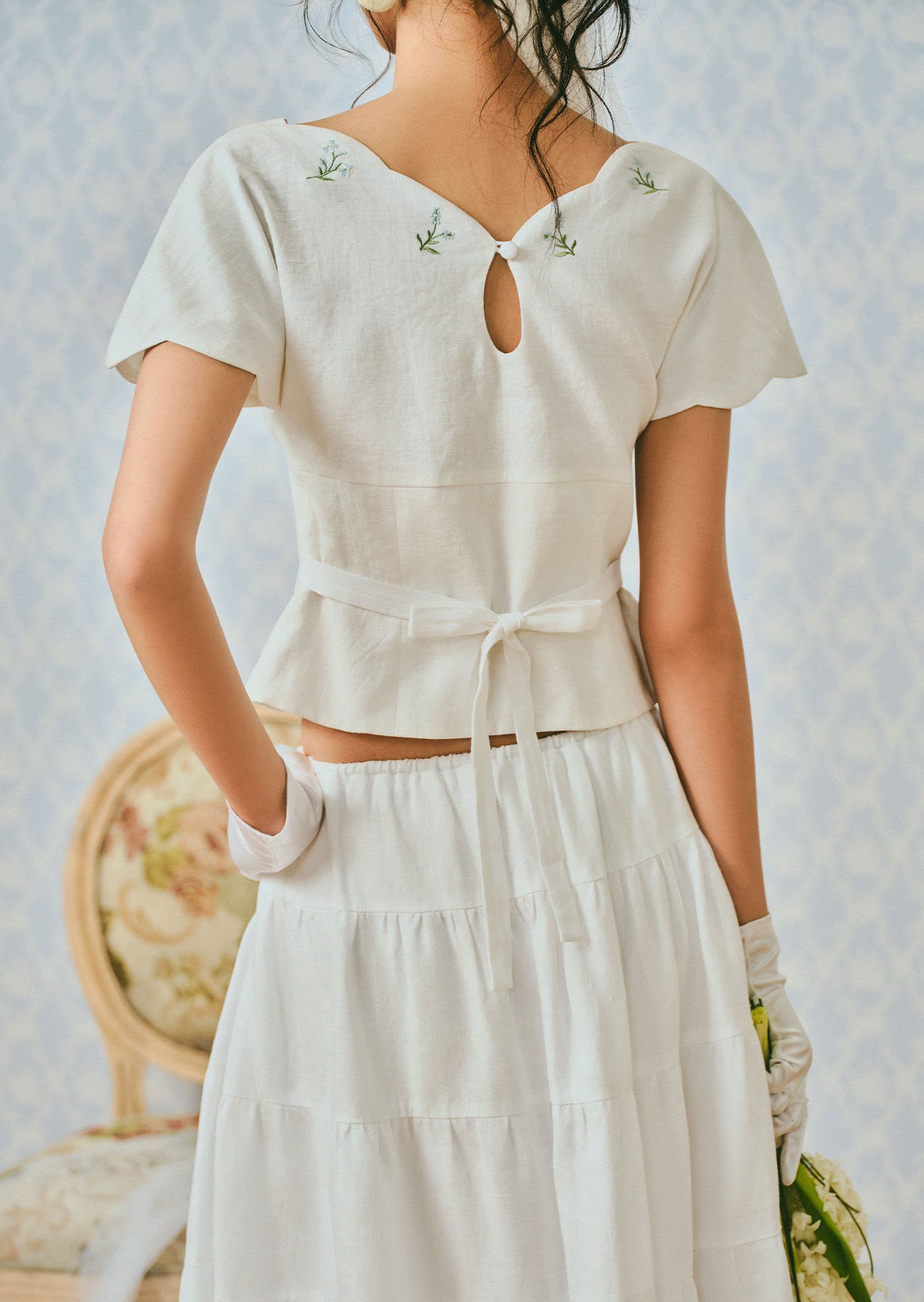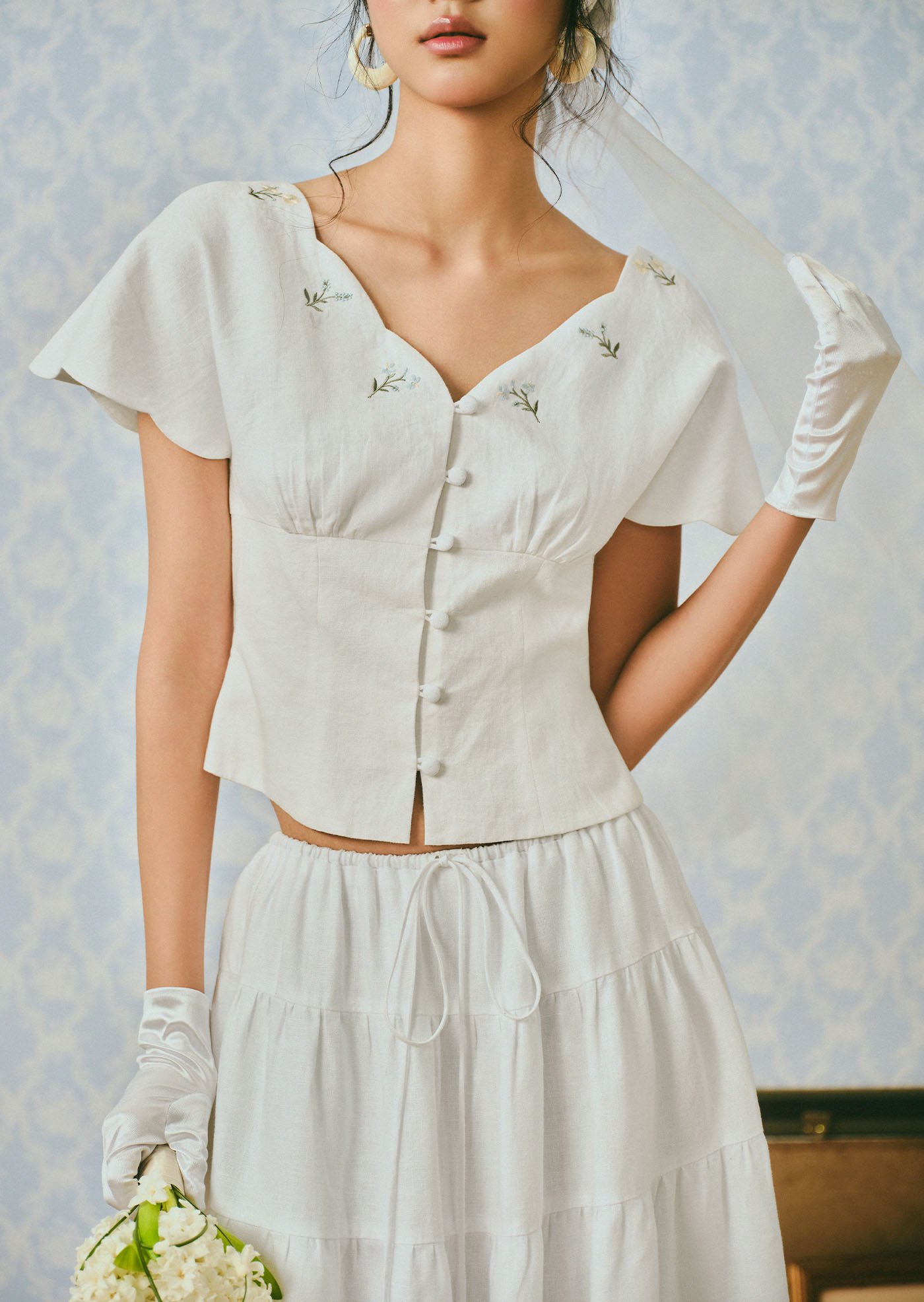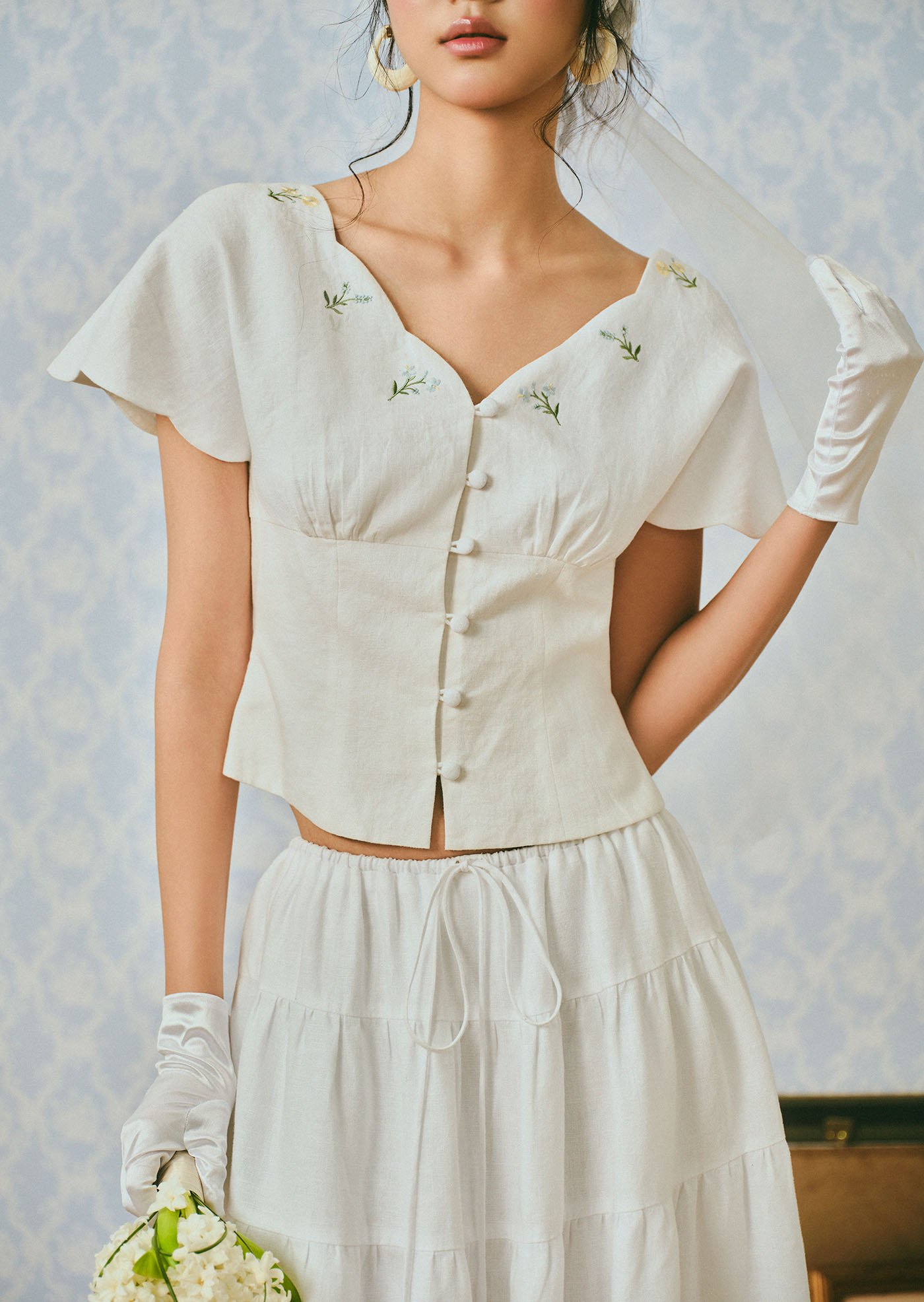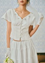 The Whisperwind Top features soft flutter sleeves and delicate hand embroidery, creating a light and romantic silhouette that feels effortlessly graceful.