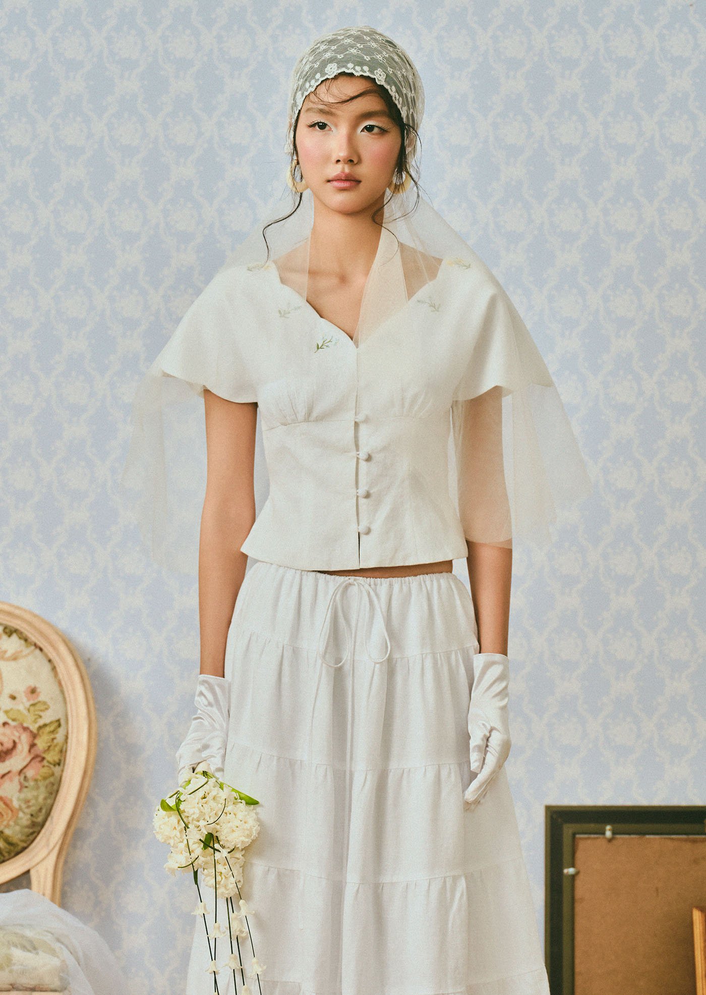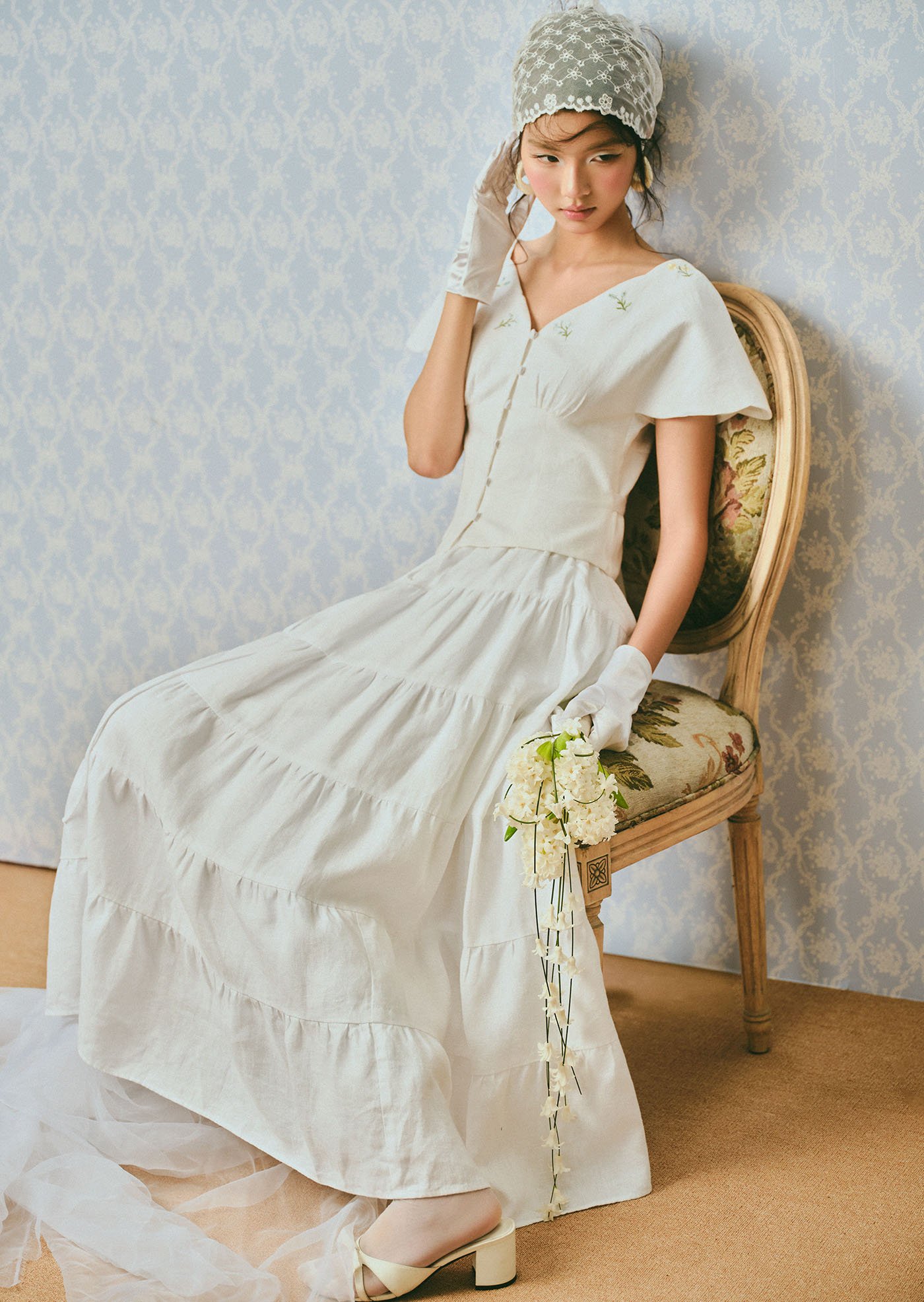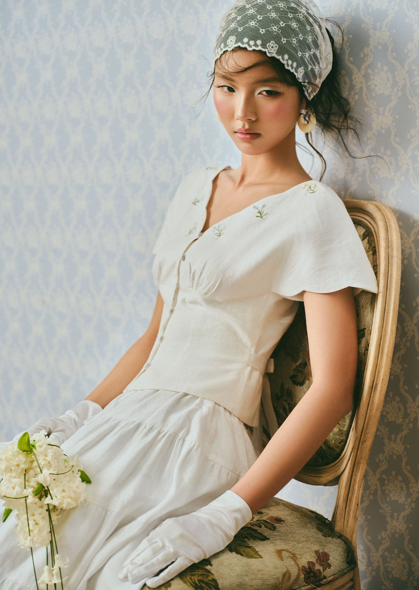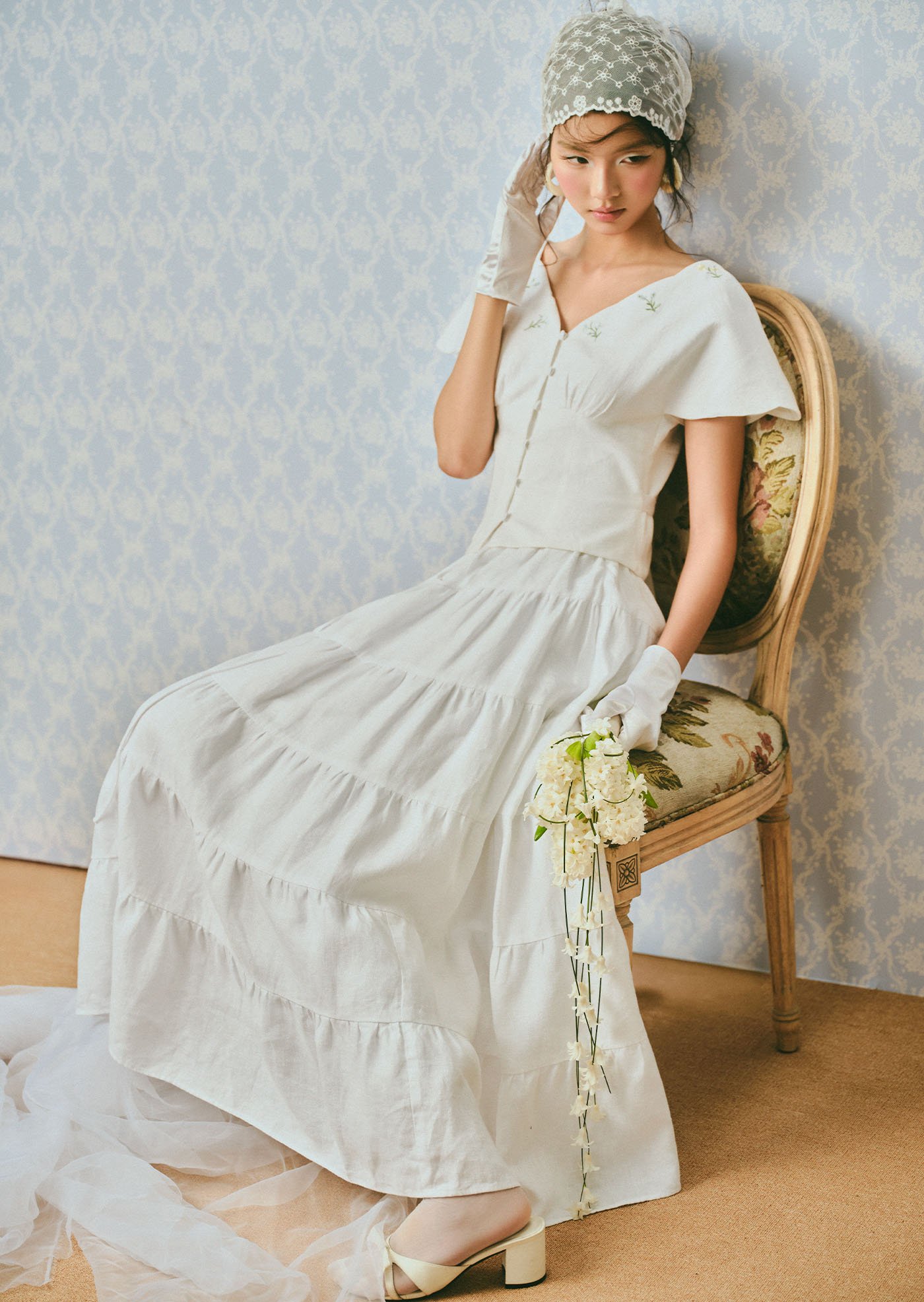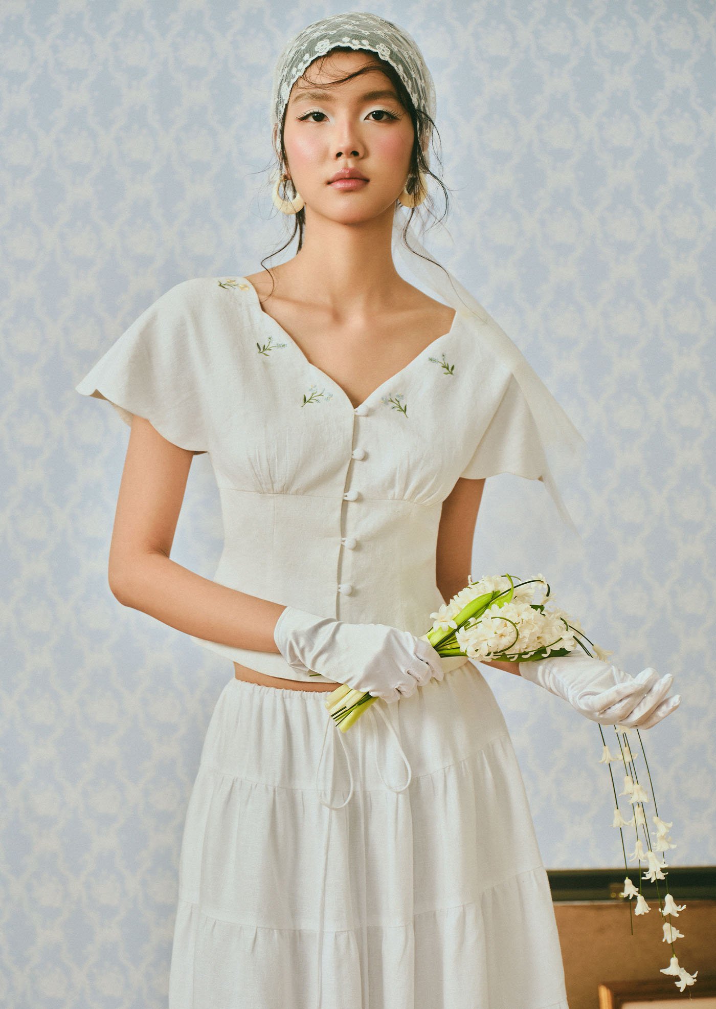 The Whisperwind Top features soft flutter sleeves and delicate hand embroidery, creating a light and romantic silhouette that feels effortlessly graceful.