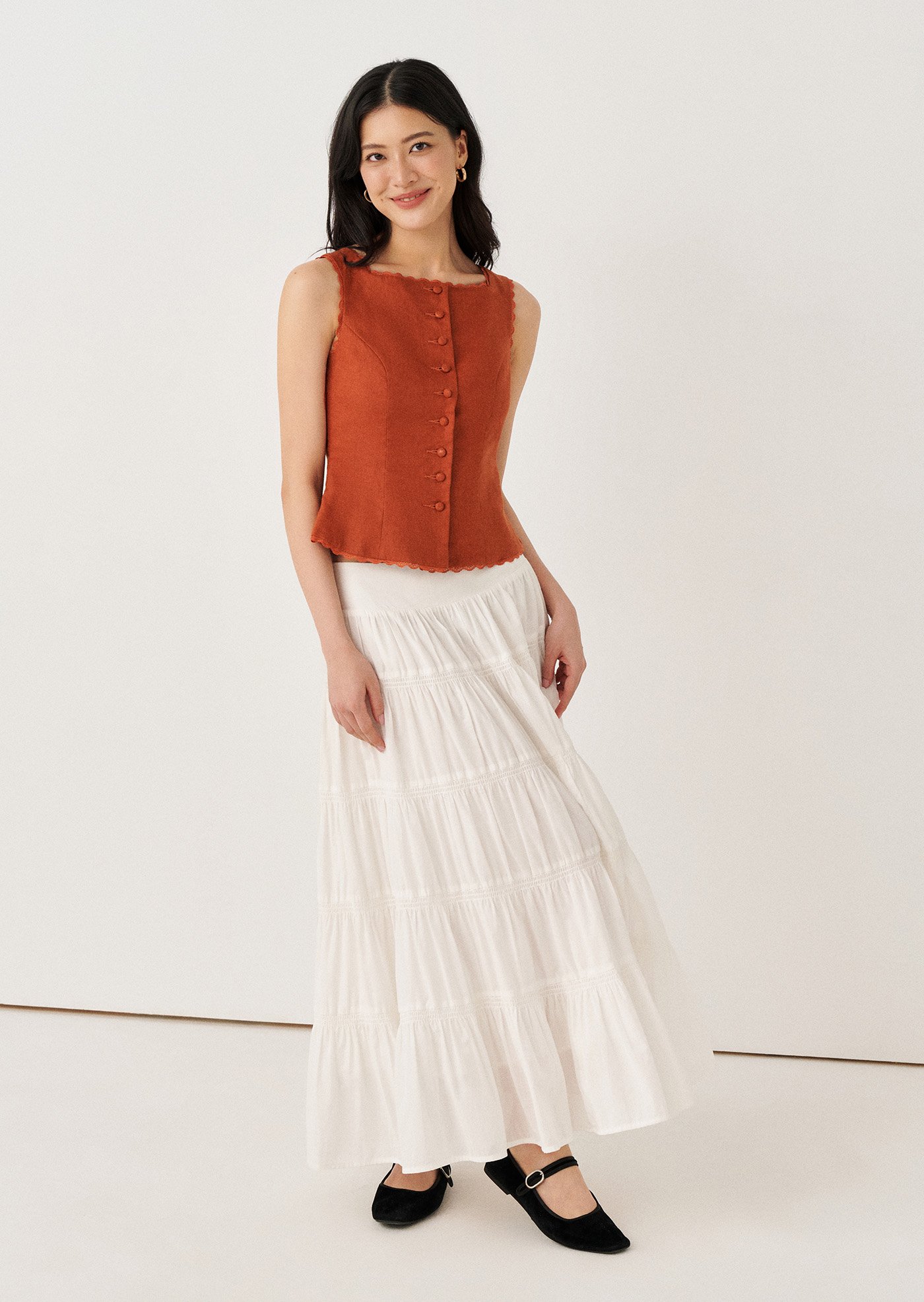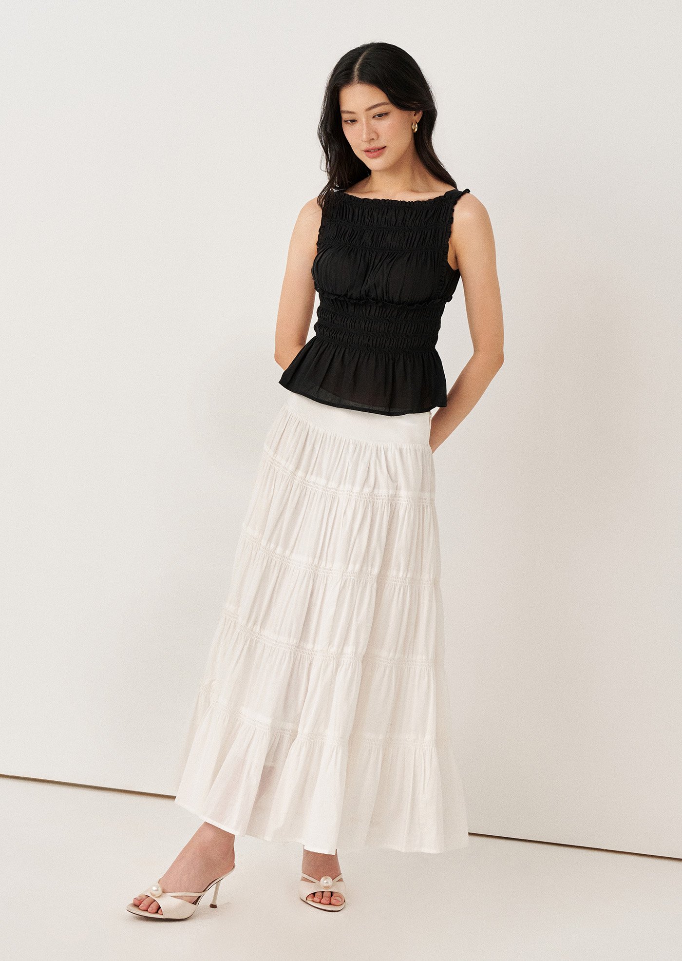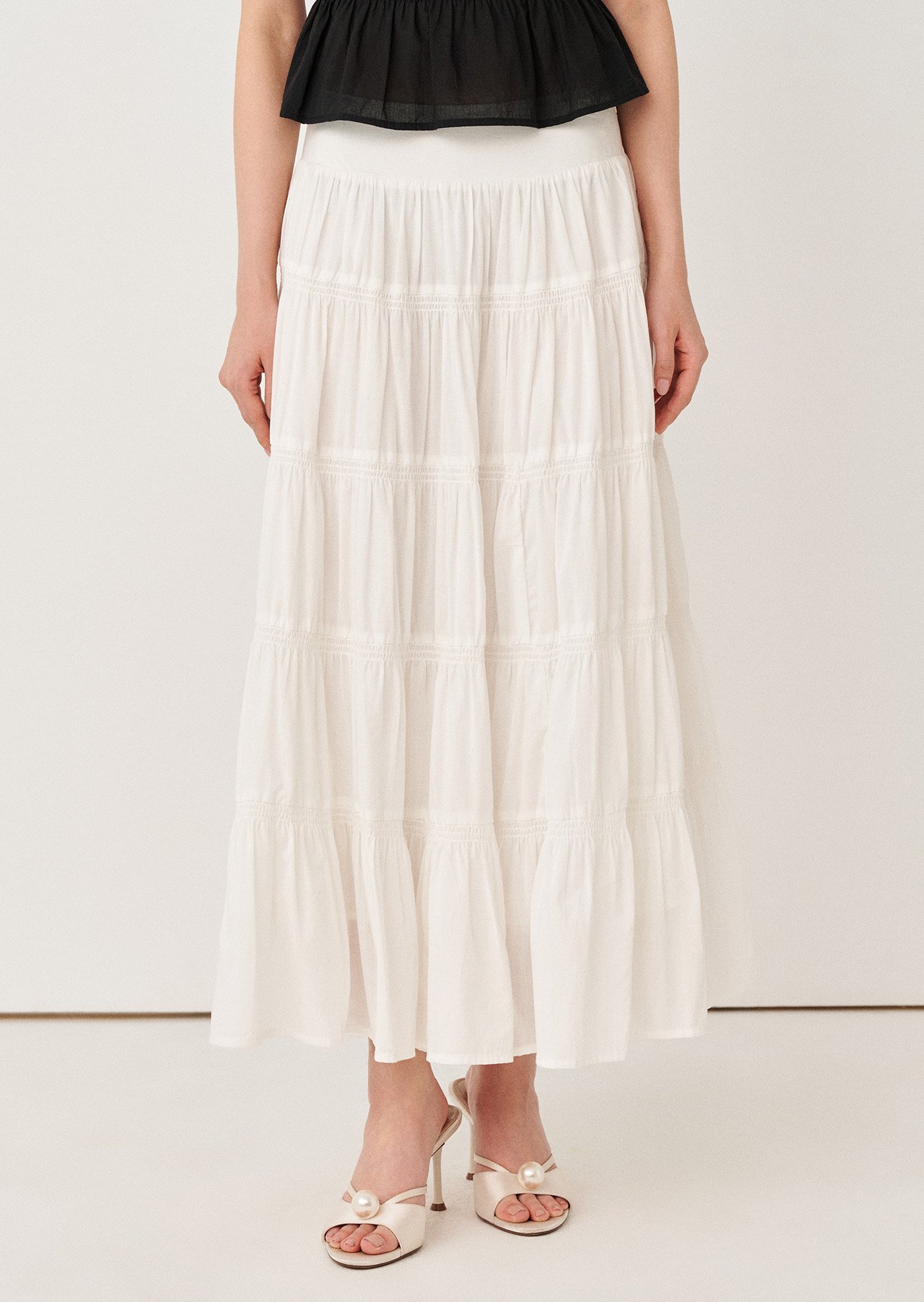 Say hello to Yasmin, a maxi skirt adorned with voluminous tiered layers and a smocked panel. It serves as the ideal wardrobe staple to help you stand out and effortlessly achieve a chic look.